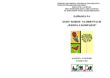 GÓRNOŚLĄSKI ODDZIAŁ POLSKIEGO TOWARZYSTWA TURYSTYCZNO-KRAJOZNAWCZEGO KOŁO PTTK „CZARTAK” PRZY KOMENDZIE HUFCA ZHP KATOWICE IM. BOHATERÓW WIEŻY SPADOCHRONOWEJ ZAPRASZA NA XXXIV MARSZE NA ORIENTACJĘ „WIOSNA Z KOMPASEM” KATOWICE – PANEWNIKI 22 MARCA 2014 REGULAMIN XXXIV MARSZÓW NA ORIENTACJĘ „WIOSNA Z KOMPASEM” ELIMINACJE MIEJSKIE LXII OGÓLNOPOLSKIEGO MŁODZIEŻOWEGO TURNIEJU TURYSTYCZNO-KRAJOZNAWCZEGO PTTK 1. Termin i miejsce imprezy: Impreza odbędzie się 22 marca 2014 roku (sobota). Baza imprezy: Zespół Szkół Fundacji „Elementarz”, Katowice, ul. Studencka 18. Organizator: Koło PTTK „Czartak” – Komisja Imprez na Orientację Górnośląskiego Oddziału PTTK w Katowicach Impreza non-profit organizowana na zasadach samoorganizacji. 2. Zgłoszenia powinny do nas dotrzeć do godziny 18.00 w dniu 20 marca: a) za pomocą formularza na stronie internetowej www.czartak.katowice.pttk.pl b) pocztą elektroniczną na adres [email protected] c) osobiście w dniach 18 i 20 marca w godz. 16:30 18:00 d) listownie: PTTK „Czartak” przy KH ZHP Katowice, Barbary 25A; 40-053 Katowice e) w przypadku posiadania wolnych materiałów startowych możliwe zgłoszenie w dniu imprezy po wniesieniu podwyższonej opłaty. 3. Wysokości wpłat na udział w imprezie: trasy TF, TP, uczestnicy eliminacji miejskich OMTTK 6,00 zł młodzież ucząca się 8,00 zł pozostali 10,00 zł Dla zgłoszonych po terminie wpłaty ulegają podwyższeniu o 3,00 zł. Wpłaty: osobiście w kasie Koła w terminach wymienionych w pkt. 2a. Wpłat można również dokonać na rachunek bankowy Górnośląskiego Oddziału PTTK w Getin Noble Bank S.A.: 24 1560 1111 0000 9070 0019 9551- dowód przelewu należy okazać w sekretariacie imprezy. Wpłaty w razie rezygnacji z udziału w imprezie nie są zwracane. 4. Zapewniamy: nagrody i dyplomy dla zwycięzców (miejsca I-III), - upominki dla członków drużyn (co najmniej 4-osobowych) na trasie familijnej - napój i coś słodkiego, - możliwość skorzystania z okolicznościowej pieczątki, - dobrą zabawę na trasach. 5. Zespół organizacyjny: Kierownik Imprezy Marian Kaczmarek Sędzia Główny Jagoda Paździor Sekretariat Michał Pojedyniec Budowa tras Krystyna Polonius, Tadeusz Kucharski, Łukasz Polonius, Roman Bargieł 6. Rodzaj imprezy: dzienna, piesza, turystyczna 7. Trasy: TF – familijna (rodzinna) bez klasyfikacji i ograniczeń wiekowych, TP – dla początkujących (urodzeni w roku 2001 i później – bardzo łatwa TM – dzieci i młodzież (urodzeni w roku 1998 i później) – średnio trudna TJ – juniorzy (urodzeni w roku 1995 i później) – trudna TS – seniorzy (urodzeni w roku 1994 i wcześniej) – trudna, dłuższa TW – weterani (urodzeni w roku 1964 i wcześniej) – średnio trudna UWAGA: Na trasach TP, TM, TJ osoby urodzone wcześniej niż w podanych latach mogą startować na trasie poza klasyfikacją. W przypadku małej ilości drużyn na danej trasie (poniżej 3) trasa ta może zostać zamknięta, na własne życzenie drużyna może wystartować w wyższej kategorii. Trasa TS może przekraczać drogi publiczne i prowadzić w terenie poprzemysłowym i zurbanizowanym. 8. Mapa: W skali 1: 15 000, aktualność: 2001 r. Dla tras TJ, TS, TW możliwa mapa niepełna, w innej skali, częściowo przetworzona, zagadki kartograficzne, zdjęcia lotnicze, ... 9. Klasyfikacja: Zasady punktacji zgodnie z zaleceniami KINO ZG PTTK. Na trasie TF i TP i drużyny maksymalnie czteroosobowe. Na trasach TM i TJ drużyny dwuosobowe (dopuszcza się start indywidualny). Na trasie TS i TW start tylko i wyłącznie indywidualny. Drużyny biorące udział w OMTTK będą klasyfikowane odrębnie, startują w trzyosobowych składach „turniejowych” na trasach TM i TJ. Na trasach przewidziano do zrealizowania zadania dodatkowe. ZABRANIA się pod groźbą dyskwalifikacji korzystania z pomocy opiekunów i osób trzecich! 10. Potwierdzenie punktów do Odznaki InO – 2 pkt. 11. Program imprezy: - przyjmowanie uczestników................................8:30-9:50 - odprawa przedstartowa.............................................10:00 - godzina „0”...............................................................10:15 - czas zamknięcia mety...............................................14:00 - planowane zakończenie dla tras TP, TM..................14:30 - planowane zakończenie dla tras TJ, TS, TW............15:00 Zastrzegamy sobie możliwość zmiany zaplanowanych godzin stosownie do potrzeb. 12. Wyposażenie: kompas (busola) – istnieje możliwość wypożyczenia u organizatorów, oprawka na mapę, kątomierz, linijka, cyrkiel, ołówek, ubiór umożliwiający swobodne poruszanie się w terenie, plecak pełen dobrego humoru. 13. Komunikacja: Autobusami z przystanku Katowice Mikołowska (naprzeciw Pałacu Młodzieży) do przystanku Ligota Akademiki linie: 12 (8.41, 9.01, 9.21), 154 (9.14), Czas przejazdu ok. 20 minut, dojście do bazy ok. 10 minut. 14. Postanowienia końcowe: - impreza odbędzie się bez względu na warunki atmosferyczne, - nie wysyłamy potwierdzeń przyjęcia na imprezę, - uczestnicy ubezpieczają się we własnym zakresie, - członkowie PTTK z opłaconymi aktualnymi składkami są ubezpieczeni od NNW, - organizatorzy nie ponoszą odpowiedzialności za szkody poniesione lub spowodowane przez osoby trzecie, - interpretacja niniejszego regulaminu należy do organizatorów. Ewentualne uwagi dotyczące budowy tras, wywieszanych wstępnych wyników przyjmują: Kierownik Zawodów i Sędzia Główny. ZAPRASZAMY !