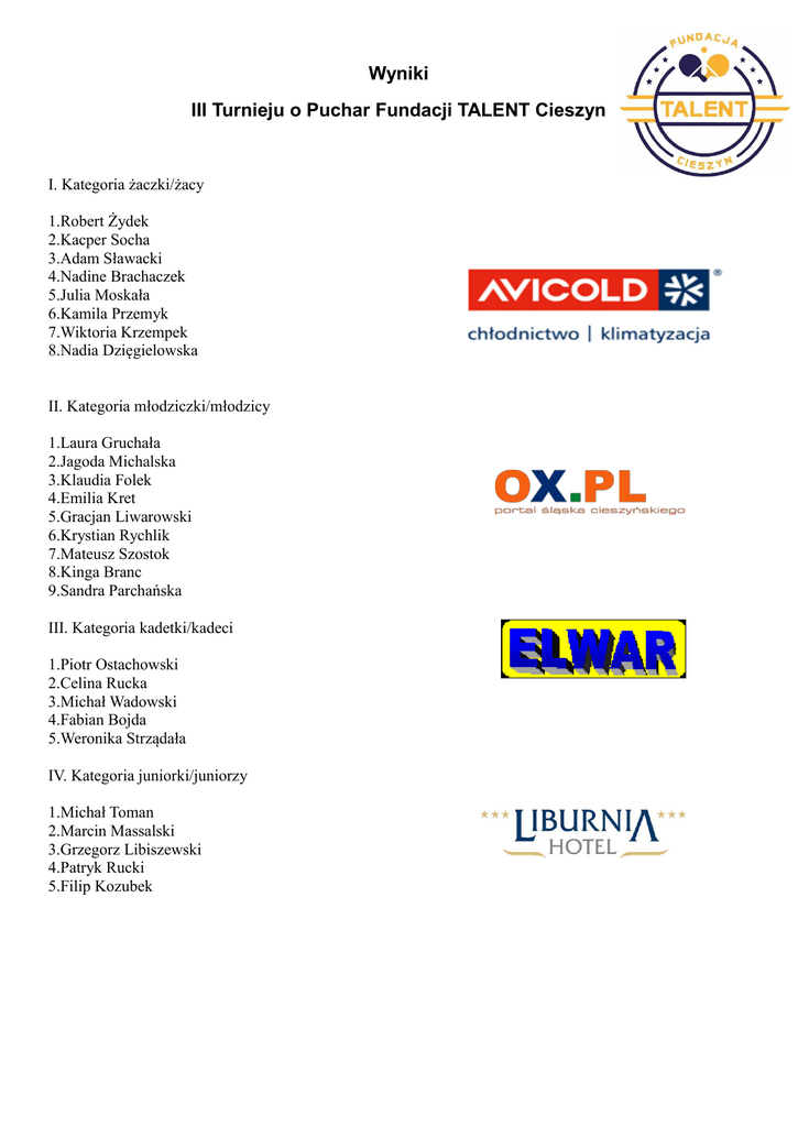 Wyniki III Turnieju o Puchar Fundacji TALENT Cieszyn I. Kategoria żaczki/żacy 1.Robert Żydek 2.Kacper Socha 3.Adam Sławacki 4.Nadine Brachaczek 5.Julia Moskała 6.Kamila Przemyk 7.Wiktoria Krzempek 8.Nadia Dzięgielowska II. Kategoria młodziczki/młodzicy 1.Laura Gruchała 2.Jagoda Michalska 3.Klaudia Folek 4.Emilia Kret 5.Gracjan Liwarowski 6.Krystian Rychlik 7.Mateusz Szostok 8.Kinga Branc 9.Sandra Parchańska III. Kategoria kadetki/kadeci 1.Piotr Ostachowski 2.Celina Rucka 3.Michał Wadowski 4.Fabian Bojda 5.Weronika Strządała IV. Kategoria juniorki/juniorzy 1.Michał Toman 2.Marcin Massalski 3.Grzegorz Libiszewski 4.Patryk Rucki 5.Filip Kozubek