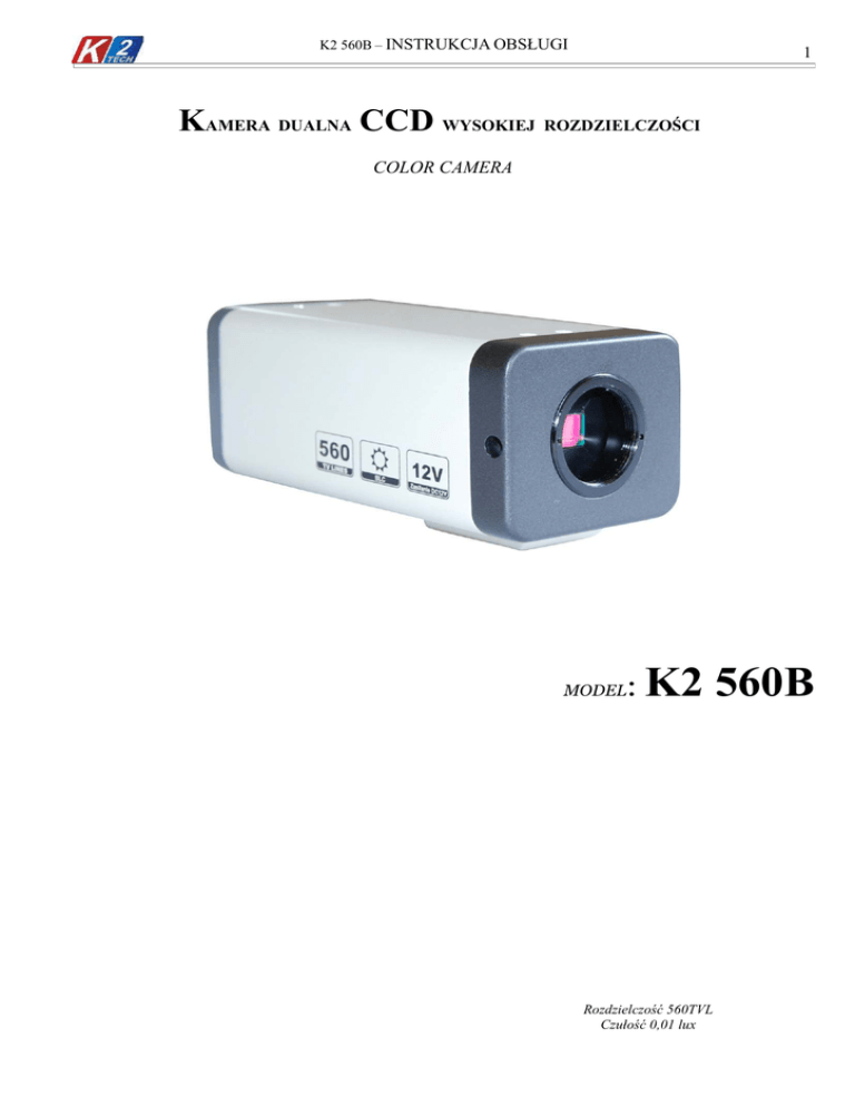 K2 560B – INSTRUKCJA OBSŁUGI 1 KAMERA DUALNA CCD WYSOKIEJ ROZDZIELCZOŚCI COLOR CAMERA MODEL : K2 Rozdzielczość 560TVL Czułość 0,01 lux 560B K2 560B – INSTRUKCJA OBSŁUGI 2 WSKAZÓWKI OGÓLNE I ŚRODKI OSTROŻNOŚCI Jak obchodzić się z kamerą - Należy unikać wstrząsów, uderzeń, itp. Kamera może ulec uszkodzeniu poprzez nieprawidłowe obchodzenie się z nią lub nieprawidłowe przechowywanie. Bezpieczeństwo elektryczne - By uniknąć porażenia prądem, nie należy usuwać osłon i śrub. W kamerze nie ma części możliwych do naprawienia przez użytkownika. W razie awarii, należy się kontaktować z wyspecjalizowanymi serwisami. Wymagania środowiskowe - Nie wolno korzystać z kamery ani przechowywać jej w miejscach bardzo gorących i bardzo zimnych, wilgotnych i nadmiernie suchych oraz w pobliżu źródeł silnych pól magnetycznych lub promieniowania elektromagnetycznego takich jak odbiorniki radiowe lub przekaźniki telewizyjne. Czyszczenie - Do czyszczenia produktu należy używać delikatnych suchych materiałów, a w przypadku poważnych zabrudzeń używać delikatnych środków. Nie należy dotykać powierzchni przetwornika obrazu lub soczewek. Po przypadkowym dotknięciu do wyczyszczenia powierzchni należy użyć miękkiej szmatki nasączonej alkoholem. Zamontowanie kamery - Nigdy nie kierować kamery w kierunku słońca lub bardzo jasnych obiektów, nawet gdy kamera jest wyłączona. Nie wolno korzystać z kamery ani przechowywać jej w pobliżu lamp fluorescencyjnych lub obiektów odbijających światło oraz niestałych lub migoczących źródłach światła. Transport - Kamera powinna być zabezpieczona przed naciskiem, wibracjami oraz wilgocią podczas transportu i przechowywania. Powinna być transportowana w częściach, w oryginalnym opakowaniu. Uszkodzenia spowodowane nieprawidłowym transportem nie są objęte gwarancją. Instalacja - Kamerę należy zainstalować w przewidzianym dla niej położeniu. Nie należy narażać części kamery na uszkodzenie mechaniczne. Wszelkie czynności serwisowe powinny być wykonane przez wykwalifikowaną osobę. Nie należy samodzielnie rozkręcać obudowę kamery, wewnątrz nie ma żadnych części które można samodzielnie naprawić. Wszystkie naprawy powinny zostać wykonane przez wykwalifikowany serwis. ➢ ➢ ➢ ➢ ➢ ➢ ➢ Przed podłączeniem kamery należy uważnie przeczytać tę instrukcję, by uniknąć uszkodzeń spowodowanych nieprawidłowym montażem lub użytkowaniem. Kamera może pracować wyłącznie przy określonym napięciu zasilania. Należy przestrzegać instrukcji dotyczących bezpieczeństwa umieszczonych na kamerze. Jeśli do wnętrza obudowy dostanie się ciecz lub ciało obce, należy odłączyć kamerę od źródła zasilania i zlecić jej sprawdzenie przez autoryzowanego przedstawiciela handlowego przed ponownym użyciem. Jeśli z urządzenia zacznie się wydobywać jakikolwiek nienormalny zapach lub dym, należy przestać użytkować produkt. W takiej sytuacji należy natychmiast odłączyć źródło zasilania i skontaktować się z serwisem. (Dalsze użytkowanie urządzenia może doprowadzić do pożaru lub porażenia prądem). Urządzenie to zostało przetestowane i jest zgodne z ograniczeniami dotyczącymi urządzenie cyfrowych klasy B. Ograniczenia te służą zapewnieniu właściwej ochrony przed szkodliwymi zakłóceniami w instalacjach mieszkalnych. To urządzenie może generować, wykorzystywać i emitować energię o częstotliwości radiowej. Jeśli nie zostanie zamontowane i nie będzie używane zgodnie z instrukcjami, może powodować szkodliwe zakłócenia łączności radiowej. Kompatybilność elektromagnetyczna (EMC) Urządzenie jest przeznaczone do zastosowań ogólnych w systemach telewizji przemysłowej (CCTV) w środowiskach mieszkalnych, komercyjnych lub przemysłowych. Aby zapewnić prawidłowe działanie i uniknąć problemów dotyczących zakłóceń elektromagnetycznych, uradzenie należy zamontować zgodnie z aktualnie obowiązującymi instrukcjami montażu dotyczącymi kompatybilności elektromagnetycznej. Urządzenia spełniają wymagania zawarte w dyrektywach oraz przepisach krajowych wprowadzających dyrektywy: • Kompatybilność elektromagnetyczna EMC 89/336/EEC ze zmianami • Niskonapięciowa LVD 73/23/EEC ze zmianą, w przypadku sprzętu elektrycznego przeznaczonego do użytkowania przy napięciu nominalnym od 50VAC do 1000VAC oraz od 75VDC do 1500VDC. Niniejsze urządzenie zostało oznakowane zgodnie z Dyrektywą WEEE (2002/96/EC), dotyczącą zużytego sprzętu elektrycznego i elektronicznego. Zapewniając prawidłowe złomowanie przyczyniają się Państwo do ograniczenia ryzyka wystąpienia negatywnego wpływu produktu na środowisko i zdrowie ludzi, które mogłoby zaistnieć w przypadku niewłaściwej utylizacji urządzenia. Symbol umieszczony na produkcie lub dołączonych do niego dokumentach oznacza, że niniejszy produkt nie jest klasyfikowany jako odpad z gospodarstwa domowego. Urządzenie należy oddać do odpowiedniego punktu utylizacji odpadów w celu recyklingu. Aby uzyskać dodatkowe informacje dotyczące recyklingu niniejszego produktu należy skontaktować się z przedstawicielem władz lokalnych, dostawcą usług utylizacji odpadów lub sklepem, gdzie nabyto produkt. Na stronie www.simtecsystem.com.pl są dostępne informacje o zasadach udzielania gwarancji i składania reklamacji oraz do pobrania jest druk serwisowy. K2 560B – INSTRUKCJA OBSŁUGI SPECYFIKACJA Przetwornik obrazu 1/3” Sony CCD, 12-bitowy DSP System wideo PAL Synchronizacja wewnętrzna Rozdzielczość 560TVL Stosunek sygnał/ szum >60dB Czułość 0.01 Lux (F1.2) Migawka elektroniczna 1/50sec ~ 1/100000sec Wzmocnienie AGC TAK Menu ekranowe OSD NIE Balans bieli Automatyczny Funkcje odbicia obrazu Lustro Kompensacja tła BLC TAK Zasilanie DC12V, 100mA Waga 280g Temp. pracy/ wilgotność -10˚C ~ +50˚C / RH 85% MAX Wymiary 130mm * 60mm * 53mm 3 K2 560B 