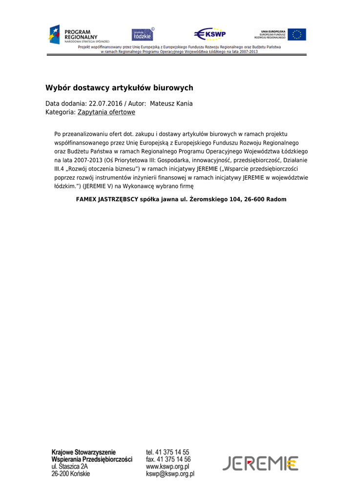 . Wybór dostawcy artykułów biurowych Data dodania: 22.07.2016 / Autor: Mateusz Kania Kategoria: Zapytania ofertowe Po przeanalizowaniu ofert dot. zakupu i dostawy artykułów biurowych w ramach projektu współfinansowanego przez Unię Europejską z Europejskiego Funduszu Rozwoju Regionalnego oraz Budżetu Państwa w ramach Regionalnego Programu Operacyjnego Województwa Łódzkiego na lata 2007-2013 (Oś Priorytetowa III: Gospodarka, innowacyjność, przedsiębiorczość, Działanie III.4 „Rozwój otoczenia biznesu”) w ramach inicjatywy JEREMIE („Wsparcie przedsiębiorczości poprzez rozwój instrumentów inżynierii finansowej w ramach inicjatywy JEREMIE w województwie łódzkim.”) (JEREMIE V) na Wykonawcę wybrano firmę FAMEX JASTRZĘBSCY spółka jawna ul. Żeromskiego 104, 26-600 Radom .
