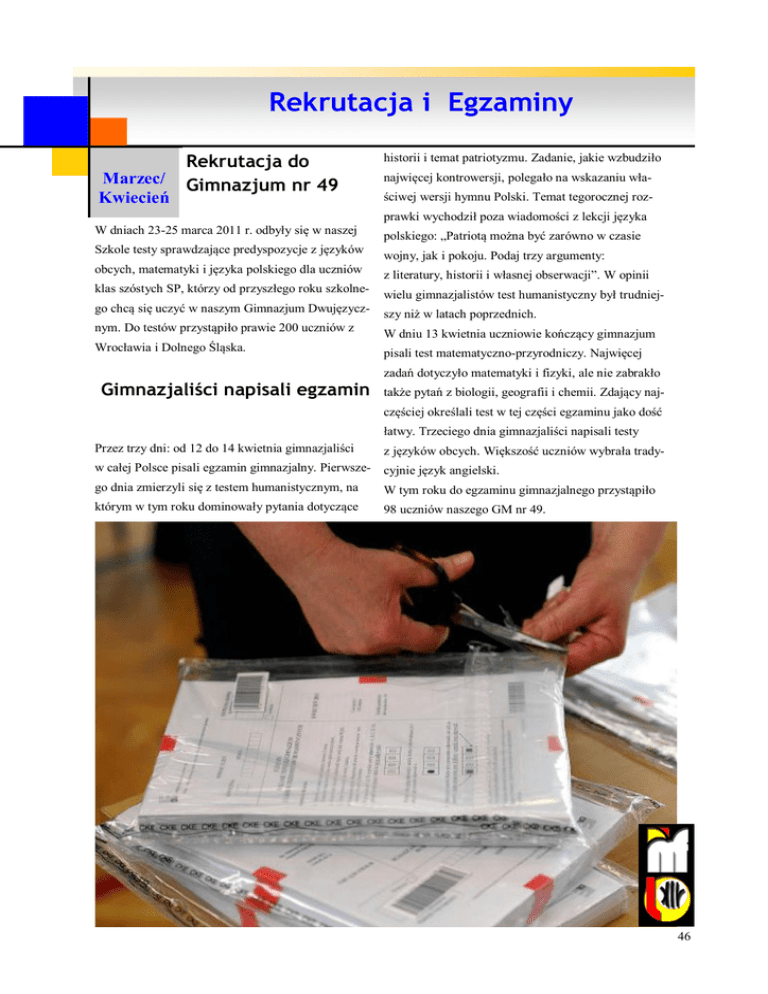 Rekrutacja i Egzaminy Marzec/ Kwiecień Rekrutacja do Gimnazjum nr 49 historii i temat patriotyzmu. Zadanie, jakie wzbudziło najwięcej kontrowersji, polegało na wskazaniu właściwej wersji hymnu Polski. Temat tegorocznej rozprawki wychodził poza wiadomości z lekcji języka W dniach 23-25 marca 2011 r. odbyły się w naszej polskiego: „Patriotą można być zarówno w czasie Szkole testy sprawdzające predyspozycje z języków wojny, jak i pokoju. Podaj trzy argumenty: obcych, matematyki i języka polskiego dla uczniów z literatury, historii i własnej obserwacji”. W opinii klas szóstych SP, którzy od przyszłego roku szkolnego chcą się uczyć w naszym Gimnazjum Dwujęzycznym. Do testów przystąpiło prawie 200 uczniów z Wrocławia i Dolnego Śląska. wielu gimnazjalistów test humanistyczny był trudniejszy niż w latach poprzednich. W dniu 13 kwietnia uczniowie kończący gimnazjum pisali test matematyczno-przyrodniczy. Najwięcej zadań dotyczyło matematyki i fizyki, ale nie zabrakło Gimnazjaliści napisali egzamin także pytań z biologii, geografii i chemii. Zdający najczęściej określali test w tej części egzaminu jako dość łatwy. Trzeciego dnia gimnazjaliści napisali testy Przez trzy dni: od 12 do 14 kwietnia gimnazjaliści z języków obcych. Większość uczniów wybrała tradyw całej Polsce pisali egzamin gimnazjalny. Pierwsze- cyjnie język angielski. go dnia zmierzyli się z testem humanistycznym, na W tym roku do egzaminu gimnazjalnego przystąpiło którym w tym roku dominowały pytania dotyczące 98 uczniów naszego GM nr 49. 46