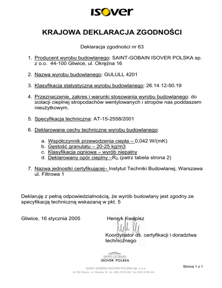 KRAJOWA DEKLARACJA ZGODNOŚCI Deklaracja zgodności nr 63 1. Producent wyrobu budowlanego: SAINT-GOBAIN ISOVER POLSKA sp. z o.o. 44-100 Gliwice, ul. OkręŜna 16 2. Nazwa wyrobu budowlanego: GULULL 4201 3. Klasyfikacja statystyczna wyrobu budowlanego: 26.14.12-50.19 4. Przeznaczenie, zakres i warunki stosowania wyrobu budowlanego: do izolacji cieplnej stropodachów wentylowanych i stropów nas poddaszem nieuŜytkowym. 5. Specyfikacja techniczna: AT-15-2558/2001 6. Deklarowane cechy techniczne wyrobu budowlanego: a. b. c. d. Współczynnik przewodzenia ciepła – 0,042 W/(mK) Gęstość granulatu – 20-25 kg/m3 Klasyfikacja ogniowa – wyrób niepalny Deklarowany opór cieplny –RD (patrz tabela strona 2) 7. Nazwa jednostki certyfikującej– Instytut Techniki Budowlanej, Warszawa ul. Filtrowa 1 Deklaruję z pełną odpowiedzialnością, Ŝe wyrób budowlany jest zgodny ze specyfikacją techniczną wskazaną w pkt. 5 Gliwice, 16 stycznia 2005 Henryk Kwapisz Koordynator ds. certyfikacji i doradztwa technicznego Strona 1 z 1