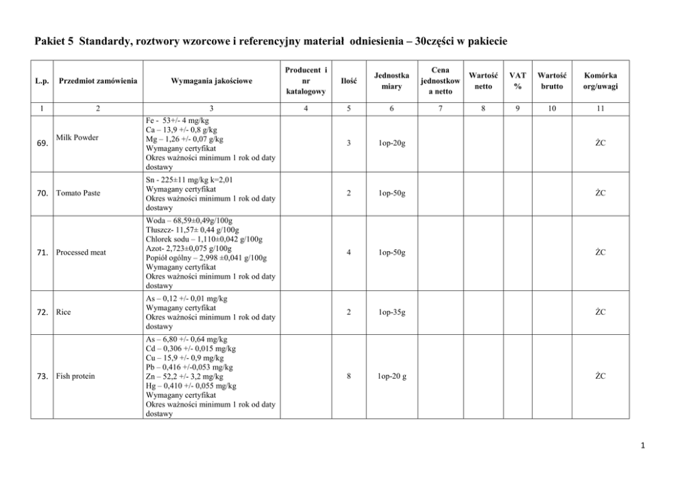 Pakiet 5 Standardy, roztwory wzorcowe i referencyjny materiał odniesienia – 30części w pakiecie L.p. Przedmiot zamówienia Wymagania jakościowe Producent i nr katalogowy Ilość Jednostka miary Cena jednostkow a netto Wartość netto VAT % Wartość brutto Komórka org/uwagi 1 2 3 4 5 6 7 8 9 10 11 Fe - 53+/- 4 mg/kg Ca – 13,9 +/- 0,8 g/kg Mg – 1,26 +/- 0,07 g/kg Wymagany certyfikat Okres waŜności minimum 1 rok od daty dostawy 3 1op-20g śC 70. Tomato Paste Sn - 225±11 mg/kg k=2,01 Wymagany certyfikat Okres waŜności minimum 1 rok od daty dostawy 2 1op-50g śC 71. Processed meat Woda – 68,59±0,49g/100g Tłuszcz- 11,57± 0,44 g/100g Chlorek sodu – 1,110±0,042 g/100g Azot- 2,723±0,075 g/100g Popiół ogólny – 2,998 ±0,041 g/100g Wymagany certyfikat Okres waŜności minimum 1 rok od daty dostawy 4 1op-50g śC 72. Rice As – 0,12 +/- 0,01 mg/kg Wymagany certyfikat Okres waŜności minimum 1 rok od daty dostawy 2 1op-35g śC 73. Fish protein As – 6,80 +/- 0,64 mg/kg Cd – 0,306 +/- 0,015 mg/kg Cu – 15,9 +/- 0,9 mg/kg Pb – 0,416 +/-0,053 mg/kg Zn – 52,2 +/- 3,2 mg/kg Hg – 0,410 +/- 0,055 mg/kg Wymagany certyfikat Okres waŜności minimum 1 rok od daty dostawy 8 1op-20 g śC 69. Milk Powder 1 do chromatografii jonowej; okres waŜności minimum 1/2 roku Roztwór wzorcowy od daty dostawy; fluorków w wodzie o dostarczyć ze świadectwem 74. stęŜeniu nominalnym wzorcowania GUM lub certyfikatem 100 mg/l akredytowanego laboratorium wzorcującego do chromatografii jonowej; okres waŜności minimum 1/2 roku Roztwór wzorcowy od daty dostawy; ortofosforanów w dostarczyć ze świadectwem 75. wodzie o stęŜeniu wzorcowania GUM lub certyfikatem nominalnym 1000 mg/l akredytowanego laboratorium wzorcującego do chromatografii jonowej, okres waŜności minimum Roztwór wzorcowy 1/2 roku od daty dostawy; ortofosforanów w dostarczyć ze świadectwem 76. wodzie o stęŜeniu wzorcowania GUM lub certyfikatem nominalnym 100mg/l akredytowanego laboratorium wzorcującego do chromatografii jonowej, okres waŜności minimum Roztwór wzorcowy 1/2 roku od daty dostawy; siarczanów w wodzie o dostarczyć ze świadectwem 77. stęŜeniu nominalnym wzorcowania GUM lub certyfikatem 100 mg/l akredytowanego laboratorium wzorcującego do chromatografii jonowej, Roztwór wzorcowy okres waŜności minimum siarczanów w wodzie o 1/2 roku od daty dostawy; 78. stęŜeniu nominalnym dostarczyć ze świadectwem 1000 mg/l wzorcowania GUM lub certyfikatem akredytowanego laboratorium 7 1 op-100 ml KW 1 1 op-100 ml KW 3 1op-100 ml KW 4 1 op-100 ml KW 3 1 op-500 ml KW 2 79. 80. 81. 82. 83. wzorcującego do chromatografii jonowej, okres waŜności minimum Roztwór wzorcowy 1/2 roku od daty dostawy; chlorków w wodzie o dostarczyć ze świadectwem stęŜeniu nominalnym wzorcowania GUM lub certyfikatem 1000 mg/l akredytowanego laboratorium wzorcującego do chromatografii jonowej, okres waŜności minimum Roztwór wzorcowy 1/2 roku od daty dostawy; azotynów w wodzie o dostarczyć ze świadectwem stęŜeniu nominalnym wzorcowania GUM lub certyfikatem 100 mg/l akredytowanego laboratorium wzorcującego do chromatografii jonowej, okres waŜności minimum Roztwór wzorcowy 1/2 roku od daty dostawy; azotanów w wodzie o dostarczyć ze świadectwem stęŜeniu nominalnym wzorcowania GUM lub certyfikatem 100 mg/l akredytowanego laboratorium wzorcującego do chromatografii jonowej, okres waŜności minimum Roztwór wzorcowy 1/2 roku od daty dostawy; azotanów w wodzie o dostarczyć ze świadectwem stęŜeniu nominalnym wzorcowania GUM lub certyfikatem 1000 mg/l akredytowanego laboratorium wzorcującego do chromatografii jonowej; Roztwór wzorcowy okres waŜności minimum 1/2 roku chlorynów w wodzie o od daty dostawy; stęŜeniu nominalnym dostarczyć ze świadectwem 1000 mg/l wzorcowania GUM lub certyfikatem 3 1 op-500 ml KW 5 1op-100 ml KW 4 1op-100 ml KW 3 1op-500 ml KW 4 1op-125 ml KW 3 akredytowanego laboratorium wzorcującego do chromatografii jonowej; okres waŜności minimum 1 rok od daty dostawy; Roztwór wzorcowy bromianów w wodzie o 84. dostarczyć ze świadectwem stęŜeniu nominalnym wzorcowania GUM lub 1000 mg/l 2 1op-125 ml KW 2 1op-125 ml KW 6 1op-100 ml KW 1 1op-125 ml KW 3 1op-500 ml KW certyfikatem akredytowanego laboratorium wzorcującego Roztwór wzorcowy chloranów w wodzie o 85. stęŜeniu nominalnym 1000 mg/l Wzorzec twardości ogólnej w roztworze 86. wodnym; (3,57±0,02) mmol/l CaCO3 Roztwór wzorcowy boru w 2÷7% wodnym 87. roztworze HNO o 3 stęŜeniu nominalnym 1000 mg/l Roztwór wzorcowy wapnia 1000 mg/l w 88. wodnym roztworze HNO3 do chromatografii jonowej; okres waŜności minimum 1 rok od daty dostawy; dostarczyć ze świadectwem wzorcowania GUM lub certyfikatem akredytowanego laboratorium wzorcującego Okres waŜności minimum 1/2 roku od daty dostawy; dostarczyć ze świadectwem wzorcowania GUM lub certyfikatem akredytowanego laboratorium wzorcującego do ICP-MS; okres waŜności minimum 1 rok od daty dostawy; dostarczyć ze świadectwem wzorcowania GUM lub certyfikatem akredytowanego laboratorium wzorcującego do absorpcji atomowej; okres waŜności minimum 1 rok od daty dostaw; dostarczyć ze świadectwem 4 89. 90. 91. 92. 93. wzorcowania GUM lub certyfikatem akredytowanego laboratorium wzorcującego do absorpcji atomowej; okres waŜności minimum Roztwór wzorcowy 1 rok od daty dostaw; magnezu 1000 mg/l w dostarczyć ze świadectwem wodnym roztworze wzorcowania GUM lub certyfikatem HNO3 akredytowanego laboratorium wzorcującego Okres waŜności minimum Roztwór wzorcowy 1/2 roku od daty dostawy; ogólnego węgla dostarczyć ze świadectwem organicznego w wzorcowania GUM lub certyfikatem wodzie (OWO) 1000 akredytowanego laboratorium mg/l wzorcującego Wartość barwy wyraŜona wg skali Roztwór wzorcowy platynowo-kobaltowej; barwy wody 500 mg/l dostarczyć ze świadectwem Pt wzorcowania GUM lub certyfikatem (Color Standard 500 akredytowanego laboratorium Units) wzorcująceg