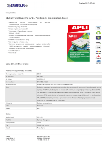 Gdańsk 2017-03-08 Karta produktu: Etykiety ekologiczne APLI, 70x37mm, prostokątne, białe Ekologiczne etykiety samoprzylepne do drukarek atramentowych, laserowych i kserokopiarek Rozmiar etykiety: 70x37mm Liczba etykiet na arkuszu: 24 Gramatura: 143gsm (papier matowy) Białość: 140 CIE Etykiety oraz opakowanie wykonane z papieru otrzymanego w 100% z odzysku W 100% wolne od chloru (EFC) Zawierają klej na bazie wody Darmowy program do projektowania i wydruku etykiet APLI SOFT kompatybilny również z oprogramowaniem Windows 7 dostępny na apli.com lub pbspolska.eu 100 arkuszy w j.s. Kolor biały Cena 101,78 PLN brutto Podstawowe parametry produktu Numer produktu w systemie 13528 Nr dostawcy AP12061 Nr Celcen 14-00084-2 Kod kreskowy 8410782120612 Nazwa produktu Etykiety ekologiczne APLI, 70x37mm, prostokątne, białe Opis Ekologiczne etykiety samoprzylepne do drukarek atramentowych, laserowych i kserokopiarek; rozmiar etykiety: 70x37mm; liczba etykiet na arkuszu: 24; gramatura: 143gsm (papier matowy); białość: 140 CIE; etykiety oraz opakowanie wykonane z papieru otrzymanego w 100% z odzysku; w 100% wolne od chloru (EFC); zawierają klej na bazie wody; darmowy program do projektowania i wydruku etykiet APLI SOFT kompatybilny również z oprogramowaniem Windows 7 dostępny na apli.com lub pbspolska.eu; 100 arkuszy w j.s.; kolor biały Kategoria Etykiety samoprzylepne Klasa Premium Marka APLI Cecha W ofercie od 2013-09 Produkt Etykiety ekologiczne Ekologiczność 100% Typ Inkjet, laser, copier Kształt Prostokątne Samfix Miałki Szlak 52 80-717 Gdańsk NIP: 583-026-77-81 REGON: 190500169 +48 (58) 305 31 60 Gdańsk 2017-03-08 Karta katalogowa produktu cd. Etykiety ekologiczne APLI, 70x37mm, prostokątne, białe Materiał Papier Wymiary Wymiary (mm) 70x37 Gramatura (g/m2) 143 Wspólny słownik zamówień CPV 30192800-9 Etykiety samoprzylepne Certyfikaty Nowy produkt w ofercie Standard Hit Standard Ilość Ilość arkuszy 100 Ilość etykiet na arkuszu 24 Kolor Kolor Biały Pozostałe zdjęcia produktu Serdecznie zapraszamy do współpracy Zespół Samfix. Samfix Miałki Szlak 52 80-717 Gdańsk NIP: 583-026-77-81 REGON: 190500169 +48 (58) 305 31 60