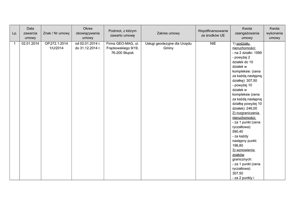 Lp. Data zawarcia umowy 1 02.01.2014 Znak / Nr umowy Okres obowiązywania umowy OP.272.1.2014 1/U/2014 od 02.01.2014 r. do 31.12.2014 r. Podmiot, z którym zawarto umowę Firma GEO-MAG, ul. Frąckowskiego 9/19, 76-200 Słupsk Zakres umowy Usługi geodezyjne dla Urzędu Gminy Współfinansowanie ze środków UE NIE Kwota zaangażowania umowy 1) podziału nieruchomości: - na 2 działki: 1599 - powyżej 2 działek do 10 działek w kompleksie: (cena za każdą następną działkę): 307,50 - powyżej 10 działek w kompleksie (cena za każdą następną działkę powyżej 10 działek): 246,00 2) rozgraniczenia nieruchomości: - za 1 punkt (cena ryczałtowa): 590,40 - za każdy następny punkt: 196,80 3) wznowienia znaków granicznych: - za 1 punkt (cena ryczałtowa): 307,50 - za 2 punkty i Kwota wykonania umowy każdy następny do 4 punktu: 221,40 - za każdy następny powyżej 4 punktów: 123,00 4) oznaczenia części działki przeznaczonej pod dzierżawę: -dla 1 dzierżawcy (cena ryczałtowa): 196,80 - dla 2 do 7 dzierżawców w kompleksie (cena ryczałtowa): 100,86 - dla kompleksu powyżej 7 dzierżawców (cena za jednostkę): 61,60 5) zmiana użytku gruntu: 61,50 2 02.01.2014 OK.2151.4.2014 8/U/2014 od 02.01.2014 r. do 31.12.2014 r. 3 02.01.2014 OK.2151.1.2014 4/U/2014 od 02.01.2014 r. do 31.12.2014 r. Kancelaria prawnicza Ejsmont&Madeła Al. Henryka Sienkiewicza 1 Słupsk "Net Serwis" Marek Wróblewski ul. Zjednoczenia 63 b 76-248 Dębnica Kaszubska Usługi prawne NIE 4 797,00 Obsługa BIP Urzędu Gminy Dębnica Kaszubska NIE 570,00 zł miesięcznie 4 02.01.2014 5 03.01.2014 6 08.01.2014 OK.2151.2.2014 5/U/2014 od 02.01.2014 r. do 31.12.2014 r. OP.6140.2.2014 21/U/2014 od 03.01.2014 r. do 28.02.2015 r. PP.272.1.2014 2/U/2014 od 08.01.2014 r. do 31.12.2014 r. "Net Serwis" Marek Wróblewski ul. Zjednoczenia 63 b 76-248 Dębnica Kaszubska Ogólnopolskie Towarzystwo Ochrony Zwierząt OTOZ Animals w Gdyni, ul. Świętojańska 41/16 Aleksander Aziukiewicz, 76-200 Słupsk ul. Włodkowica 17/5 Krzysztof Zawadzki, 76-200 Słupsk ul. Boya-Żeleńskiego 13 Obsługa informatyczna Urzędu Gminy Wykonanie usług polegających na zapewnieniu miejsca w schronisku wraz z opieką weterynaryjną bezdomnym zwierzętom (psy i koty), Usługi urbanistyczne - projekty decyzji o warunkach zabudowy oraz projekty decyzji o lokalizacji inwestycji celu publicznego. NIE NIE NIE 5 929,10 zł miesięcznie Koszt: - za psa: 1300 zł, - za kota: 600 zł, - za kocię: 350 zł kwota ryczałtowa za 1 projekt decyzji w tym: - wzizt dla terenu wymagającego podziału nieruchomości – 300,00 - wzizt dla terenu planowanego do zalesienia (dla terenu o powierzchni do 10ha) – 300,00 - wzizt dla terenu wnioskowanego na cele nowej zabudowy 300,00 - wzizt dla terenu wnioskowanego na cele rozbudowy istniejącego obiektu budowlanego 300,00 zł - umcp dla terenu do 5 działek ewidencyjnych i łącznej powierzchni nie przekraczającej 1ha - 400,00 zł - umcp dot. infrastruktury technicznej o długości sieci lub drogi do 1 km 400,00 zł - decyzja o zmianie decyzji o warunkach zabudowy-200,00 zł 7 13.01.2014 OK.272.1.2014 3/U/2014 od 13.01.2014 r. do 31.12.2014 r. 8 14.01.2014 GO.7031.1.2014 11/U/2014 od 14.01.2014 r. do 31.12.2014 r. 9 15.01.2014 OK.2151.3.2014 7/U/2014 od 15.01.2014 r. do 31.12.2014 r. 10 15.01.2014 ON.2151.1.2014 od 15.01.2014 r. do 31.12.2014 r. Hurtownia OPTIM, Os. Niepodległości 22, 77-200 Miastko NEUTIL s.c. Dudzicze 1, 76-248 Dębnica Kaszubska Perfex s.c. 76-251 Kobylnica; ul. Widzińska 18 "AGABOR" Agata Iwaszko ul. Jasna 11 05-506 Wilcza Gór Dostawa materiałów biurowych do Urzędu Gminy i jednostek NIE 29 945,75 zł Odbiór padłych zwierząt NIE 108 zł za sztukę Usługi BHP NIE 369,00 zł miesięcznie Dokumentacja dot. ochrony informacji niejawnych NIE 2 952,00 zł 11 12 15.01.2014 OP.6140.3.2014 22/U/2014 od 15.01.2014 r. do 31.12.2014 r. Agnieszka Kuc – Mikłaszewicz Gabinet Weterynaryjny Ogonek, ul. Świerkowa 13, 76-248 Dębnica Kaszubska 23.01.2014 PP.7021.2.2013 2/Z/2014 od 23.01.2014 r. do 28.02.2014 r. Józef Kozłowski Tychowo 16 76-100 Sławno Usługi weterynaryjne NIE 1) udzielanie całodobowej opieki weterynaryjnej w przypadku zdarzeń drogowych z udziałem zwierząt (stawka za dobę): 50 zł + koszty leków; 2) wykonywanie sterylizacji bezdomnych zwierząt (psów i kotów): pies – 250 zł, kot – 70 zł; 3) wykonywanie kastracji bezdomnych zwierząt (psów i kotów): pies – 100 zł, kot-50 zł; 4)przeprowadzeni e interwencji z udzieleniem pomocy na miejscu zdarzenia (stawka za 1 h): 30 zł + koszt leków Wykonanie remontu placu zabaw po wichurze NIE 5 412,00 zł 0 5 412,00 Technika IT S.A. Ul. Toszeckiej 2, 44-102 Gliwice Asysta techniczna na oprogramowanie do USC NIE 3 207,84 zł Elżbieta Trubicka Obsługa Futsal NIE 500 zł 500 Stanisław Wziątek Obsługa Futsal NIE 500 zł 500 Łukasz Jenczyk Obsługa Futsal NIE 500 zł 500 Kamil Płatek Obsługa Futsal NIE 500 zł 500 Jerzy Chomicki Obsługa Futsal NIE 500 zł 500 od 04.02.2014 r. do 11.02.2014 r. Starostwo Powiatowe w Słupsku Wypisy i wyrysy NIE 4 080,00 zł 4 080,00 FR.2151.1.2014. FG 10/U/2014 od 05.02.2014 r. do 27.02.2014 r. Monika Botwinionek, Doręczenie decyzji podatkowych NIE 356,40 zł 335,61 17.02.2014 GN.6840.1.2014 11/Z/2014 od 17.02.2014 r. do 24.02.2014 r. Agencja Reklamowo Wydawnicza, ul. Sienkiewicza 1/2, Słupsk Publikacja ogłoszenia NIE 369,00 zł 369 17.02.2014 OC.5210.1.2014. MP 20/Z/2014 od 17.02.2014 r. do 31.03.2014 r. Marek Pietrzak Dostarczenie wezwań do kwalifikacji wojskowych NIE 480,00 zł 480 Operat szacunkowy NIE 872,00 zł 872 Zakup znaków NIE 3 770,56 zł 3 770,56 USC.1333.1.201 4 9/U/2014 od 01.01.2014 r. do 31.12.2014 r WS.425.2014 4/Z/2014 WS.425.2014 5/Z/2014 WS.425.2014 6/Z/2014 WS.425.2014 8/Z/2014 WS.425.2014 9/Z/2014 od 01.02.2014 r. do 28.02.2014 r. od 01.02.2014 r. do 28.02.2014 r. od 01.02.2014 r. do 28.02.2014 r. od 01.02.2014 r. do 28.02.2014 r. od 01.02.2014 r. do 28.02.2