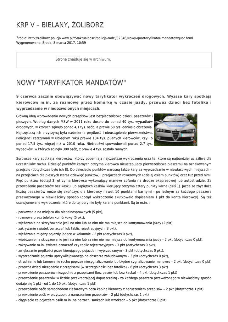 KRP V – BIELANY, ŻOLIBORZ Źródło: http://zoliborz.policja.waw.pl/r5/aktualnosci/policja-radzi/32346,Nowy-quottaryfikator-mandatowquot.html Wygenerowano: Środa, 8 marca 2017, 10:59 Strona znajduje się w archiwum. NOWY "TARYFIKATOR MANDATÓW" 9 czerwca zacznie obowiązywać nowy taryfikator wykroczeń drogowych. Wyższe kary spotkają kierowców m.in. za rozmowę przez komórkę w czasie jazdy, przewóz dzieci bez fotelika i wyprzedzanie w niedozwolonych miejscach. Główną ideą wprowadenia nowych przepisów jest bezpieczeństwo dzieci, pasażerów i pieszych. Według danych MSW w 2011 roku doszło do ponad 40 tys. wypadków drogowych, w których zginęło ponad 4,1 tys. osób, a prawie 50 tys. odniosło obrażenia. Najczęstszą ich przyczyną była nadmierna prędkość i nieustąpienie pierwszeństwa. Policjanci zatrzymali w ubiegłym roku prawie 184 tys. pijanych kierowców, czyli o ponad 17,5 tys. więcej niż w 2010 roku. Nietrzeźwi spowodowali ponad 2,7 tys. wypadków, w których zginęło 300 osób, z prawie 4 tys. zostało rannych. Surowsze kary spotkają kierowców, którzy popełniają najczęstsze wykroczenia oraz te, które są najbardziej uciążliwe dla uczestników ruchu. Dziesięć punktów karnych otrzyma kierowca nieustępujący pierwszeństwa pieszemu na oznakowanym przejściu (dotychczas było ich 8). Do dziesięciu punktów wzrosną także kary za wyprzedzanie w niewłaściwych miejscach na przejściach dla pieszych (teraz dziewięć punktów) i przejazdach rowerowych (dzisiaj osiem punktów) oraz tuż przed nimi. Pięć punktów (dotąd 3) otrzyma kierowca wykonujący manewr cofania na drodze ekspresowej lub autostradzie. Za przewożenie pasażerów bez kasku lub zapiętych kasków kierujący otrzyma cztery punkty karne (dziś 1). Jazda ze zbyt dużą liczbą pasażerów może się skończyć dla kierowcy nawet 10 punktami karnymi - po jednym za każdego pasażera przewożonego w niewłaściwy sposób (dotąd wykroczenie skutkowało dopisaniem 1 pkt do konta kierowcy). Są też usancjonowane wykroczenia, które do tej pory nie były karane punktami. Są to m.in. : - parkowanie na miejscu dla niepełnosprawnych (5 pkt), - rozmowa przez telefon komórkowy (5 pkt), - wjeżdżanie na skrzyżowanie jeśli na nim lub za nim nie ma miejsca do kontynuowania jazdy (2 pkt), - zakrywanie świateł, oznaczeń lub tablic rejestracyjnych (3 pkt). - wjeżdżanie między pojazdy jadące w kolumnie – 2 pkt (dotychczas 0 pkt), - wjeżdżanie na skrzyżowanie jeśli na nim lub za nim nie ma miejsca do kontynuowania jazdy – 2 pkt (dotychczas 0 pkt), - zakrywanie m.in. świateł, oznaczeń czy tablic rejestracyjnych – 3 pkt (dotychczas 0 pkt), - zwiększanie prędkości przez kierującego pojazdem wyprzedzanym – 3 pkt (dotychczas 0 pkt), - wyprzedzanie pojazdu uprzywilejowanego na obszarze zabudowanym – 3 pkt (dotychczas 0 pkt), - utrudnianie lub tamowanie ruchu poprzez niesygnalizowanie lub błędne sygnalizowanie manewru – 2 pkt (dotychczas 0 pkt) - przewóz dzieci niezgodnie z przepisami (w szczególności bez fotelika) – 6 pkt (dotychczas 3 pkt) - przewożenie pasażerów niezgodnie z przepisami (bez pasów lub bez kasku) – 4 pkt (dotychczas 1 pkt) - przewożenie pasażerów w liczbie przekraczającej dopuszczalną - za każdego pasażera przewożonego w niewłaściwy sposób dodaje się 1 pkt - od 1 do 10 pkt (dotychczas 1 pkt) - przewożenie osób samochodem ciężarowym poza kabiną kierowcy z naruszeniem przepisów – 2 pkt (dotychczas 1 pkt) - przewożenie osób w przyczepie z naruszeniem przepisów – 2 pkt (dotychczas 1 pkt) - ciągnięcie za pojazdem osób m.in. na nartach, sankach lub wrotkach – 5 pkt (dotychczas 0 pkt) - nieustąpienie pierwszeństwa pieszemu na oznakowanym przejściu – 10 pkt (dotychczas 8 pkt) - nieustąpienie pierwszeństwa pieszemu podczas cofania – 6 pkt (dotychczas 5 pkt) - niezatrzymanie pojazdu w razie przechodzenia przez jezdnię osoby niepełnosprawnej – 10 pkt (dotychczas 8 pkt) - wyprzedzanie na przejściach dla pieszych i przed nimi – 10 pkt (dotychczas 9 pkt) - wyprzedzanie na przejazdach rowerowych i przed nimi – 10 pkt (dotychczas 8 pkt) - cofanie na drodze ekspresowej lub autostradzie – 5 pkt (dotychczas 3 pkt) - niezatrzymanie pojazdu przed znakiem STOP – 2 pkt (dotychczas 1 pkt) eb/ro Ocena: 0/5 (0) Tweetnij