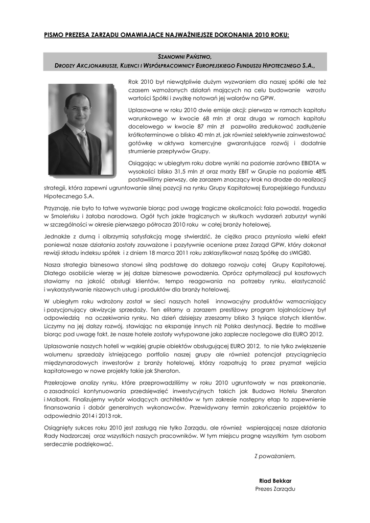PISMO PREZESA ZARZĄDU OMAWIAJĄCE NAJWAśNIEJSZE DOKONANIA 2010 ROKU: SZANOWNI PAŃSTWO, DRODZY AKCJONARIUSZE, KLIENCI I WSPÓŁPRACOWNICY EUROPEJSKIEGO FUNDUSZU HIPOTECZNEGO S.A., Rok 2010 był niewątpliwie duŜym wyzwaniem dla naszej spółki ale teŜ czasem wzmoŜonych działań mających na celu budowanie wzrostu wartości Spółki i zwyŜkę notowań jej walorów na GPW. Uplasowane w roku 2010 dwie emisje akcji: pierwsza w ramach kapitału warunkowego w kwocie 68 mln zł oraz druga w ramach kapitału docelowego w kwocie 87 mln zł pozwoliła zredukować zadłuŜenie krótkoterminowe o blisko 40 mln zł, jak równieŜ selektywnie zainwestować gotówkę w aktywa komercyjne gwarantujące rozwój i dodatnie strumienie przepływów Grupy. Osiągając w ubiegłym roku dobre wyniki na poziomie zarówno EBIDTA w wysokości blisko 31,5 mln zł oraz marŜy EBIT w Grupie na poziomie 48% postawiliśmy pierwszy, ale zarazem znaczący krok na drodze do realizacji strategii, która zapewni ugruntowanie silnej pozycji na rynku Grupy Kapitałowej Europejskiego Funduszu Hipotecznego S.A. Przyznaję, nie było to łatwe wyzwanie biorąc pod uwagę tragiczne okoliczności: fala powodzi, tragedia w Smoleńsku i Ŝałoba narodowa. Ogół tych jakŜe tragicznych w skutkach wydarzeń zaburzył wyniki w szczególności w okresie pierwszego półrocza 2010 roku w całej branŜy hotelowej. JednakŜe z dumą i olbrzymią satysfakcją mogę stwierdzić, Ŝe cięŜka praca przyniosła wielki efekt poniewaŜ nasze działania zostały zauwaŜone i pozytywnie ocenione przez Zarząd GPW, który dokonał rewizji składu indeksu spółek i z dniem 18 marca 2011 roku zaklasyfikował naszą Spółkę do sWIG80. Nasza strategia biznesowa stanowi silną podstawę do dalszego rozwoju całej Grupy Kapitałowej. Dlatego osobiście wierzę w jej dalsze biznesowe powodzenia. Oprócz optymalizacji pul kosztowych stawiamy na jakość obsługi klientów, tempo reagowania na potrzeby rynku, elastyczność i wykorzystywanie niszowych usług i produktów dla branŜy hotelowej. W ubiegłym roku wdroŜony został w sieci naszych hoteli innowacyjny produktów wzmacniający i pozycjonujący akwizycje sprzedaŜy. Ten elitarny a zarazem prestiŜowy program lojalnościowy był odpowiedzią na oczekiwania rynku. Na dzień dzisiejszy zrzeszamy blisko 3 tysiące stałych klientów. Liczymy na jej dalszy rozwój, stawiając na ekspansję innych niŜ Polska destynacji. Będzie to moŜliwe biorąc pod uwagę fakt, Ŝe nasze hotele zostały wytypowane jako zaplecze noclegowe dla EURO 2012. Uplasowanie naszych hoteli w wąskiej grupie obiektów obsługującej EURO 2012, to nie tylko zwiększenie wolumenu sprzedaŜy istniejącego portfolio naszej grupy ale równieŜ potencjał przyciągnięcia międzynarodowych inwestorów z branŜy hotelowej, którzy rozpatrują to przez pryzmat wejścia kapitałowego w nowe projekty takie jak Sheraton. Przekrojowe analizy rynku, które przeprowadziliśmy w roku 2010 ugruntowały w nas przekonanie, o zasadności kontynuowania przedsięwzięć inwestycyjnych takich jak Budowa Hotelu Sheraton i Malbork. Finalizujemy wybór wiodących architektów w tym zakresie następny etap to zapewnienie finansowania i dobór generalnych wykonawców. Przewidywany termin zakończenia projektów to odpowiednio 2014 i 2013 rok. Osiągnięty sukces roku 2010 jest zasługą nie tylko Zarządu, ale równieŜ wspierającej nasze działania Rady Nadzorczej oraz wszystkich naszych pracowników. W tym miejscu pragnę wszystkim tym osobom serdecznie podziękować. Z powaŜaniem, Riad Bekkar Prezes Zarządu