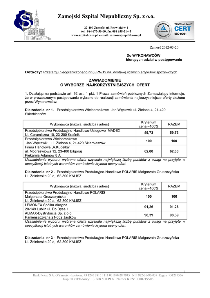 Zamojski Szpital Niepubliczny Sp. z o.o. 22-400 Zamość. ul. Peowiaków 1 tel. 084 677-50-00, fax 084 638-51-45 www.szpital.com.pl e-mail: [email protected] Zamość 2012-03-20 Do WYKONAWCÓW biorących udział w postępowaniu Dotyczy: Przetargu nieograniczonego nr 8 /PN/12 na dostawę różnych artykułów spożywczych ZAWIADOMIENIE O WYBORZE NAJKORZYSTNIEJSZYCH OFERT 1. Działając na podstawie art. 92 ust. 1 pkt. 1 Prawa zamówień publicznych Zamawiający informuje, że w prowadzonym postępowaniu wybrano do realizacji zamówienia najkorzystniejsze oferty złożone przez Wykonawców: Dla zadania nr 1- Przedsiębiorstwo Wielobranżowe Jan Węcławik ul. Zielona 4, 21-420 Skierbieszów Wykonawca (nazwa, siedziba i adres) Kryterium cena –100% RAZEM Przedsiębiorstwo Produkcyjno-Handlowo-Usługowe MADEX 59,73 59,73 Ul. Ceramiczna 10, 23-200 Kraśnik Przedsiębiorstwo Wielobranżowe 100 100 Jan Węcławik ul. Zielona 4, 21-420 Skierbieszów Firma Handlowa „A.Kudełka” 62,00 62,00 ul. Modrzewiowa 12, 23-400 Biłgoraj Piekarnia Adamów 8 A Uzasadnienie wyboru: wybrana oferta uzyskała największą liczbę punktów z uwagi na przyjęte w specyfikacji istotnych warunków zamówienia kryteria oceny ofert. Dla zadania nr 2 - Przedsiębiorstwo Produkcyjno-Handlowe POLARIS Małgorzata Gruszczyńska Ul. Żołnierska 20 a, 62-800 KALISZ Wykonawca (nazwa, siedziba i adres) Kryterium cena –100% RAZEM Przedsiębiorstwo Produkcyjno-Handlowe POLARIS 100 100 Małgorzata Gruszczyńska Ul. Żołnierska 20 a, 62-800 KALISZ LEMONEX Spółka Akcyjna 91,26 91,26 20-149 Lublin ul. Do Dysa 1 ALMAX-Dystrybucja Sp. z o.o. 98,39 98,39 Panieńszczyzna 21-002 Jastków Uzasadnienie wyboru: wybrana oferta uzyskała największą liczbę punktów z uwagi na przyjęte w specyfikacji istotnych warunków zamówienia kryteria oceny ofert. Dla zadania nr 3 - Przedsiębiorstwo Produkcyjno-Handlowe POLARIS Małgorzata Gruszczyńska Ul. Żołnierska 20 a, 62-800 KALISZ 1 Bank Pekao S.A. O/Zamość - konto nr: 43 1240 2816 1111 0010 0428 7945 NIP 922-26-93-037 Regon 951217536 Kapitał zakładowy: 13 368 500 PLN Numer KRS: 0000219506 Wykonawca (nazwa, siedziba i adres) Przedsiębiorstwo Produkcyjno-Handlowe POLARIS Małgorzata Gruszczyńska Ul. Żołnierska 20 a 62-800 KALISZ LEMONEX Spółka Akcyjna 20-149 Lublin ul. Do Dysa 1 ALMAX-Dystrybucja Sp. z o.o. Panieńszczyzna 21-002 Jastków Przedsiębiorstwo Usługowo-Handlowe ULTAX ul. Zagłoby 4, 22-400 Zamość Kryterium cena –100% RAZEM 100 100 34,74 34,74 58,64 58,64 40,55 40,55 Uzasadnienie wyboru: wybrana oferta uzyskała największą liczbę punktów z uwagi na przyjęte w specyfikacji istotnych warunków zamówienia kryteria oceny ofert. Dla zadania nr 4 - ALMAX-Dystrybucja Sp. z o.o. Panieńszczyzna 21-002 Jastków Kryterium Wykonawca (nazwa, siedziba i adres) cena –100% Przedsiębiorstwo Produkcyjno-Handlowe POLARIS 99,48 Małgorzata Gruszczyńska Ul. Żołnierska 20 a 62-800 KALISZ LEMONEX Spółka Akcyjna 99,22 20-149 Lublin ul. Do Dysa 1 ALMAX-Dystrybucja Sp. z o.o. 100 Panieńszczyzna 21-002 Jastków Uzasadnienie wyboru: wybrana oferta uzyskała największą liczbę punktów z uwagi na specyfikacji istotnych warunków zamówienia kryteria oceny ofert. RAZEM 99,48 99,22 100 przyjęte w Dla zadania nr 5 - Przedsiębiorstwo Produkcyjno-Handlowe POLARIS Małgorzata Gruszczyńska Ul. Żołnierska 20 a 62-800 KALISZ Wykonawca (nazwa, siedziba i adres) Kryterium cena –100% Przedsiębiorstwo Produkcyjno-Handlowo-Usługowe MADEX 96,22 Ul. Ceramiczna 10, 23-200 Kraśnik Przedsiębiorstwo Produkcyjno-Handlowe POLARIS 100 Małgorzata Gruszczyńska Ul. Żołnierska 20 a 62-800 KALISZ LEMONEX Spółka Akcyjna 83,18 20-149 Lublin ul. Do Dysa 1 ALMAX-Dystrybucja Sp. z o.o. 98,89 Panieńszczyzna 21-002 Jastków Uzasadnienie wyboru: wybrana oferta uzyskała największą liczbę punktów z uwagi na specyfikacji istotnych warunków zamówienia kryteria oceny ofert. RAZEM 96,22 100 83,18 98,89 przyjęte w Dla zadania nr 6 - Przedsiębiorstwo Usługowo-Handlowe ULTAX ul. Zagłoby 4, 22-400 Zamość Kryterium Wykonawca (nazwa, siedziba i adres) RAZEM cena –100% NORDIS Chłodnie Polskie Sp. z o.o. 89,21 89,21 65-707 Zielona Góra ul. Zimna 1A Magazyn w Zamościu 22-400 Zamość ul. Kilińskiego 83 P.P.H. „AMIKA“ 88,64 88,64 ul. Rejowiecka 169 22-100 Chełm ALMAX-Dystrybucja Sp. z o.o. 78,26 78,26 Panieńszczyzna 21-002 Jastków Przedsiębiorstwo Usługowo-Handlowe ULTAX 100 100 ul. Zagłoby 4, 22-400 Zamość 2 Bank Pekao S.A. O/Zamość - konto nr: 43 1240 2816 1111 0010 0428 7945 NIP 922-26-93-037 Regon 951217536 Kapitał zakładowy: 13 368 500 PLN Numer KRS: 0000219506 Uzasadnienie wyboru: wybrana oferta uzyskała największą liczbę punktów z uwagi na przyjęte w specyfikacji istotnych warunków zamówienia kryteria oceny ofert. Dla zadania nr 7- Ferma Drobiu Dariusz Juśko 22-400 Zamość ul. Młyńska 41 Uzasadnienie wyboru: tylko jedna oferta, uzyskała największą liczbę punktów z uwagi na przyjęte w specyfikacji istotnych warunków zamówienia kryteria oceny ofert. Umowy zawarte zostaną w terminie określonym w art. 94 ust.1 pkt. 2 2. Działając na podstawie art. 92 ust. 1 pkt. 2 i 3 Prawa zamówień publicznych Zamawiający informuje, że w prowadzonym postępowaniu nie zostały wykluczone i odrzucone żadne oferty. Dziękujemy za udział w postępowaniu i zapraszamy do współpracy w przyszłości. 3 Bank Pekao S.A. O/Zamość - konto nr: 43 1240 2816 1111 0010 0428 7945 NIP 922-26-93-037 Regon 951217536 Kapitał zakładowy: 13 368 500 PLN Numer KRS: 0000219506