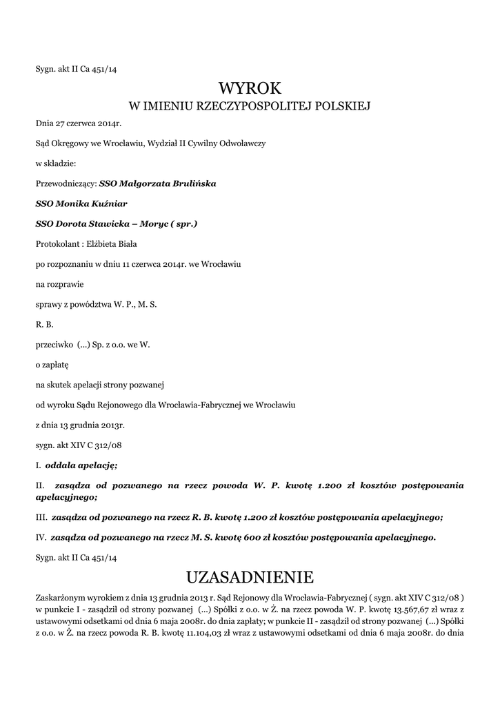 Sygn. akt II Ca 451/14 WYROK W IMIENIU RZECZYPOSPOLITEJ POLSKIEJ Dnia 27 czerwca 2014r. Sąd Okręgowy we Wrocławiu, Wydział II Cywilny Odwoławczy w składzie: Przewodniczący: SSO Małgorzata Brulińska SSO Monika Kuźniar SSO Dorota Stawicka – Moryc ( spr.) Protokolant : Elżbieta Biała po rozpoznaniu w dniu 11 czerwca 2014r. we Wrocławiu na rozprawie sprawy z powództwa W. P., M. S. R. B. przeciwko (...) Sp. z o.o. we W. o zapłatę na skutek apelacji strony pozwanej od wyroku Sądu Rejonowego dla Wrocławia-Fabrycznej we Wrocławiu z dnia 13 grudnia 2013r. sygn. akt XIV C 312/08 I. oddala apelację; II. zasądza od pozwanego na rzecz powoda W. P. kwotę 1.200 zł kosztów postępowania apelacyjnego; III. zasądza od pozwanego na rzecz R. B. kwotę 1.200 zł kosztów postępowania apelacyjnego; IV. zasądza od pozwanego na rzecz M. S. kwotę 600 zł kosztów postępowania apelacyjnego. Sygn. akt II Ca 451/14 UZASADNIENIE Zaskarżonym wyrokiem z dnia 13 grudnia 2013 r. Sąd Rejonowy dla Wrocławia-Fabrycznej ( sygn. akt XIV C 312/08 ) w punkcie I - zasądził od strony pozwanej (...) Spółki z o.o. w Ż. na rzecz powoda W. P. kwotę 13.567,67 zł wraz z ustawowymi odsetkami od dnia 6 maja 2008r. do dnia zapłaty; w punkcie II - zasądził od strony pozwanej (...) Spółki z o.o. w Ż. na rzecz powoda R. B. kwotę 11.104,03 zł wraz z ustawowymi odsetkami od dnia 6 maja 2008r. do dnia zapłaty; w punkcie III - zasądził od strony pozwanej (...) Spółki z o.o. w Ż. na rzecz powoda M. S. kwotę 5.900 zł wraz z ustawowymi odsetkami od dnia 6 maja 2008r. do dnia zapłaty; w punkcie IV - dalej idące powództwa powodów R. B. i M. S. oddalił, w punkcie V - zasądził od strony pozwanej na rzecz powoda W. P. kwotę 3.846 zł tytułem zwrotu kosztów postępowania, w punkcie VI - zasądził od strony pozwanej na rzecz powoda R. B. kwotę 2.993 zł tytułem zwrotu kosztów postępowania, w punkcie VII - zniósł wzajemnie koszty postępowania między powodem M. S. i stroną pozwaną oraz w punkcie VIII - nakazał powodowi M. S., aby uiścił kwotę 351,27 zł i stronie pozwanej, aby uiściła kwotę 1.530 zł na rzecz Skarbu Państwa (Sądu Rejonowego dla Wrocławia – Fabrycznej we Wrocławiu) tytułem brakujących wydatków na koszt opinii biegłych sądowych. Powyższe rozstrzygnięcie oparł na następujących ustaleniach faktycznych: Przy ul. (...), ma siedzibę (...) Spółka z o.o. we W.; powodowie w 2007r. byli pracownikami tej spółki. Powód W. P. w 2007r. był właścicielem pojazdu marki V. (...) nr rej. (...), zaś powód R. B. był właścicielem pojazdu marki S. (...) nr rej. (...). Powód M. S. w 2007r. i również w chwili obecnej jest właścicielem pojazdu marki F. (...) nr rej. (...). W 2007 r. powodowie dojeżdżali do swego zakładu pracy własnymi pojazdami i parkowali je na terenie siedziby (...) Spółki z o.o. Strona pozwana prowadzi działalność gospodarczą m.in. w zakresie produkcji konstrukcji metalowych, obróbki metali i nakładania powłok na metale. Poprzednikiem prawnym strony pozwanej była spółka (...) Spółka z o.o. W ramach inwestycji strony pozwanej przewidziano zainstalowanie, wyposażenie i uruchomienie jednej komory śrutowniczej i dwóch kabino – suszarek lakierniczych. Nanoszenie farby w kabinach odbywa się metodą natrysku pneumatycznego. Decyzją Prezydenta W. z dnia 2 marca 2007r. strona pozwana uzyskała pozwolenie na czas określony do dnia 1 marca 2012 r. na wprowadzanie do powietrza substancji gazowych i pyłowych emitowanych z urządzeń lakierni i śrutowni. Kolejna decyzja w tym przedmiocie została wydana w dniu 2 kwietnia 2012 r. na okres do 2 kwietnia 2022 r. W kwietniu 2007r. na terenie (...) przy ul. (...) we W., w bezpośrednim sąsiedztwie siedziby spółki (...) Spółki z o.o., strona pozwana rozpoczęła próby technologiczne w zakresie funkcjonowania instalacji lakierni i śrutowni (hala (...)). W okresie do września 2007 r., kiedy zakończono modernizację hali i rozpoczęto normalny proces produkcji, zużyto 1200 litrów farb. Strona pozwana stosowała w procesie malowania podkład epoksydowy czarny (...), utwardzacz (...) oraz (...) oraz farby nawierzchniowe (...) w kolorze czerwonym i beżowym. Kolory farb są stosowane zgodnie z zamówieniem klienta W dniu 23 sierpnia 2007r. strona pozwana otrzymała ofertę sprzedaży filtrów do kabino – suszarek lakierniczych; strona pozwana poszukiwała filtrów ze względu na to, iż podlegają one okresowej wymianie, z tym, że poszukiwała tańszych w porównaniu do dotychczas stosowanych. Przeprowadzone w dniu 7 września 2007 roku przez Instytut (...) badanie emisji zanieczyszczeń obejmujące m.in. pomiary stężenia zanieczyszczeń organicznych w gazach odlotowych z kabino – suszarki lakierniczej wykazały, iż emisja z kabino – suszarki lakierniczej (emitory (...)) nie przekracza standardów emisyjnych określonych w pozwoleniu na emisję gazów i pyłów do powietrza; w raporcie z badań wskazano, że nie ma możliwości wykonania pomiarów z drugiej kabino – suszarki lakierniczej (emitory (...)) z powodu braku możliwości zamontowania króćców pomiarowych. W opisie obiektu zawartym w raporcie badania emisji zanieczyszczeń z września 2007r. wskazano, iż kabino - suszarka lakiernicza (emitory (...)) posiada dwa palniki gazowe do przeponowego ogrzewania powietrza wwiewanego do kabiny podczas suszenia oraz po dwa wentylatory nawiewne i wywiewne. W ażurowej podłodze umieszczone są suche filtry typu (...) powietrza odciąganego. Podczas malowania pobierane z zewnątrz powietrze tłoczone jest przez filtr oraz podgrzewacz i przez strop wpływa do kabiny, przechodzi przez całą objętość roboczą komory unosząc ze sobą cząstki farby pod podłogę, gdzie oczyszczane jest z aerozolu na matach filtracyjnych typu (...). Następnie dalej pod podłogą powietrze prowadzone jest go otwartego poziomego emitora o wymiarach 0,84x1,44 m i wysokości 