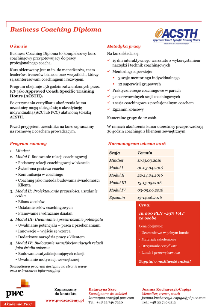 Business Coaching Diploma O kursie Metodyka pracy Business Coaching Diploma to kompleksowy kurs coachingowy przygotowujący do pracy profesjonalnego coacha. Na kurs składa się: Kurs skierowany jest m.in. do menedżerów, team leaderów, trenerów biznesu oraz wszystkich, którzy są zainteresowani coachingiem i rozwojem. Mentoring/superwizje: Program obejmuje 156 godzin zatwierdzonych przez ICF jako Approved Coach Specific Training Hours (ACSTH). 15 dni interaktywnego warsztatu z wykorzystaniem narzędzi i technik coachingowych 3 sesje mentoringu indywidualnego 12 superwizji grupowych Praktyczne sesje coachingowe w parach 5 obserwowalnych sesji coachingowych Po otrzymaniu certyfikatu ukończenia kursu uczestnicy mogą ubiegać się o akredytację indywidualną (ACC lub PCC) ułatwioną ścieżką ACSTH. 1 sesja coachingowa z profesjonalnym coachem Przed przyjęciem uczestnika na kurs zapraszamy na rozmowę z coachem prowadzącym. W ramach ukończenia kursu uczestnicy przeprowadzają 36 godzin coachingu z klientem zewnętrznym. Program ramowy Harmonogram wiosna 2016 1. Mindset Egzamin końcowy Kameralne grupy do 12 osób. Sesja Termin Mindset 11-13.03.2016 • Świadoma postawa coacha Moduł I 01-03.04.2016 • Komunikacja w coachingu Moduł II 22-24.04.2016 • Coaching jako metoda budowania świadomości Klienta Moduł III 13-15.05.2016 Moduł IV 03-05.06.2016 Egzamin 13-14.06.2016 2. Moduł I: Budowanie relacji coachingowej • Podstawy relacji coachingowej w biznesie 3. Moduł II: Projektowanie przyszłości, ustalanie celów • Bilans zasobów Cena: • Ustalanie celów coachingowych • Planowanie i wdrażanie działań 4. Moduł III: Uwalnianie i przekraczanie potencjału 16.000 PLN +23% VAT za osobę • Uwalnianie potencjału – praca z przekonaniami Cena obejmuje: • Innowacje – wyjście ze wzorca - Uczestnictwo w pełnym kursie • Dodatkowe narzędzia pracy z klientem 5. Moduł IV: Budowanie satysfakcjonujących relacji jako źródło sukcesu - Materiały szkoleniowe - Otrzymanie certyfikatu - Lunch i przerwy kawowe • Budowanie satysfakcjonujących relacji • Uwalnianie motywacji wewnętrznej Zapytaj o możliwość zniżek! Szczegółowy program dostępny na stronie www oraz w broszurze informacyjnej Zapraszamy do kontaktu Akademia PwC www.pwcacademy.pl Katarzyna Szac Koordynator ds. szkoleń [email protected] Tel.: +48 22 746 7220 Joanna Kucharczyk-Capiga Menedżer, trener, coach [email protected] Tel.: +48 22 746 6212 Formularz zgłoszeniowy e-mail: [email protected] Business Coaching Diploma – Wiosna 2016 Firma NIP Imię i nazwisko Stanowisko Adres Miasto Kod Adres e-mail Tel Lokalizacja Warunki uczestnictwa Sesje odbywać się będą w siedzibie firmy: PwC Polska Sp. z o.o. Al. Armii Ludowej 14 00-638 Warszawa (metro Politechnika) Formularz zgłoszeniowy ma formę umowy pomiędzy powyższą firmą/osobą a PwC Polska Sp. z o.o., z siedzibą w Warszawie, przy Al. Armii Ludowej 14, wpisaną do rejestru przedsiębiorców przez Sąd Rejonowy dla m.st. Warszawy, XII Wydział Gospodarczy Krajowego Rejestru Sądowego, pod numerem KRS 0000120338, NIP 1132399979, kapitał zakładowy 25.633.200 złotych („PwC”). Opłata za uczestnictwo obejmuje koszty szkolenia, materiałów szkoleniowych, przerw kawowych oraz lunchu. Możliwa płatność w dwóch równych częściach, w odstępie jednego miesiąca. Płatność do 14 dni od wystawienia faktury VAT. Zgłoszenie Prosimy wypełnić formularz zgłoszeniowy i przesłać na poniższy adres e-mail: [email protected] Po otrzymaniu formularza prześlemy Państwu potwierdzenie uczestnictwa w szkoleniu. Masz pytania? PwC zastrzega sobie prawo do odwołania lub zmiany terminu szkolenia do 14 dni przed rozpoczęciem edycji Wiosna 2016. W takim przypadku uczestnicy, którzy zgłosili chęć udziału w programie będą mieli pierwszeństwo uczestnictwa w najbliższym wybranym przez siebie kursie. W przypadku skreślenia z listy uczestników kursu przez PwC z przyczyn leżących po stronie uczestnika wartość tej części kursu, w której uczestniczył nie podlega zwrotowi. W przypadku rezygnacji uczestnika w trakcie trwania kursu, całkowita wartość kursu nie podlega zwrotowi. Katarzyna Szac Koordynator ds. szkoleń, Akademia PwC Tel.: +48 22 746 7220 Kom.: +48 519 50 7220 [email protected] W trybie art. 10 ust. 2 ustawy z dnia 18 lipca 2002 roku o świadczeniu usług drogą elektroniczną (Dz. U. nr 144, poz. 1204), wyrażam zgodę na otrzymywanie od PwC drogą elektroniczną informacji na temat szkolenia oraz informacji o innych produktach szkoleniowych na wskazany wyżej formularzu adres e-mail. Wyrażam zgodę na przetwarzanie danych osobowych, zawartych w formularzu zgłoszeniowym, w zakresie, w jakim jest to niezbędne do właściwego wykonania niniejszej umowy, w tym w szczególności dla potrzeb niezbędnych do otrzymywania od PwC informacji handlowych, o których mowa powyżej (zgodnie z ustawą z 29 sierpnia 1997 r. o ochronie danych osobowych, Dz. U. 2002, nr 101, poz. 926, ze zm.). Równocześnie oświadczam, iż poinformowano mnie o przysługującym mi prawie do odwołania udzielonej zgody, co spowoduje niezwłoczne zaprzestanie przesyłania mi informacji handlowych. Data, podpis Akademia PwC Rezygnacja z uczestnictwa przyjmowana jest mailem, jednak nie później niż na 14 dni przed rozpoczęciem edycji Wiosna 2016. Rezygnacja po upływie ww. terminu skutkuje obowiązkiem uiszczenia pełnej opłaty za kurs na podstawie wystawionej faktury VAT. Możliwe jest zgłoszenie zastępstwa za pierwotnie zgłoszonego uczestnika szkolenia.