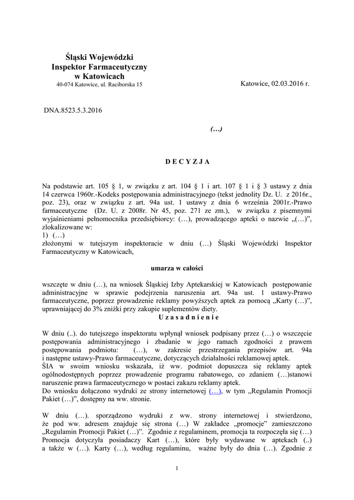Śląski Wojewódzki Inspektor Farmaceutyczny w Katowicach Katowice, 02.03.2016 r. 40-074 Katowice, ul. Raciborska 15 DNA.8523.5.3.2016 (…) DECYZJA Na podstawie art. 105 § 1, w związku z art. 104 § 1 i art. 107 § 1 i § 3 ustawy z dnia 14 czerwca 1960r.-Kodeks postępowania administracyjnego (tekst jednolity Dz. U. z 2016r., poz. 23), oraz w związku z art. 94a ust. 1 ustawy z dnia 6 września 2001r.-Prawo farmaceutyczne (Dz. U. z 2008r. Nr 45, poz. 271 ze zm.), w związku z pisemnymi wyjaśnieniami pełnomocnika przedsiębiorcy: (…), prowadzącego apteki o nazwie „(…)”, zlokalizowane w: 1) (…) złożonymi w tutejszym inspektoracie w dniu (…) Śląski Wojewódzki Inspektor Farmaceutyczny w Katowicach, umarza w całości wszczęte w dniu (…), na wniosek Śląskiej Izby Aptekarskiej w Katowicach postępowanie administracyjne w sprawie podejrzenia naruszenia art. 94a ust. 1 ustawy-Prawo farmaceutyczne, poprzez prowadzenie reklamy powyższych aptek za pomocą „Karty (…)”, uprawniającej do 3% zniżki przy zakupie suplementów diety. Uzasadnienie W dniu (..). do tutejszego inspektoratu wpłynął wniosek podpisany przez (…) o wszczęcie postępowania administracyjnego i zbadanie w jego ramach zgodności z prawem (…), w zakresie przestrzegania przepisów art. 94a postępowania podmiotu: i następne ustawy-Prawo farmaceutyczne, dotyczących działalności reklamowej aptek. ŚIA w swoim wniosku wskazała, iż ww. podmiot dopuszcza się reklamy aptek ogólnodostępnych poprzez prowadzenie programu rabatowego, co zdaniem (…)stanowi naruszenie prawa farmaceutycznego w postaci zakazu reklamy aptek. Do wniosku dołączono wydruki ze strony internetowej (…), w tym „Regulamin Promocji Pakiet (…)”, dostępny na ww. stronie. W dniu (…). sporządzono wydruki z ww. strony internetowej i stwierdzono, że pod ww. adresem znajduje się strona (…) W zakładce „promocje” zamieszczono „Regulamin Promocji Pakiet (…)”. Zgodnie z regulaminem, promocja ta rozpoczęła się (…) Promocja dotyczyła posiadaczy Kart (…), które były wydawane w aptekach (..) a także w (…). Karty (…), według regulaminu, ważne były do dnia (…). Zgodnie z 1 regulaminem, Karta (…) obejmowała 20% zniżkę na zabiegi i usługi w (…) (także zniżki specjalne do 70% na inne usługi centrum) oraz 3% zniżkę na suplementy diety w wybranych siedmiu aptekach (…) w tym w aptekach o nazwie „(…)” zlokalizowanych (…) prowadzonych przez spółkę (…) Rozpatrując wniosek ŚIA Śląski Wojewódzki Inspektor Farmaceutyczny stwierdził, że wyniki wstępnej analizy zebranego w sprawie materiału dowodowego, tj. „Regulaminu Promocji Pakiet (…)” i przedstawionych w nim zasad tego programu, wskazywały, że działania te mogły naruszyć zakaz prowadzenia reklamy aptek i ich działalności. Biorąc pod uwagę wyniki analizy przesłanego materiału dowodowego oraz uwzględniając stanowisko zawarte w wyrokach, między innymi, Wojewódzkiego Sądu Administracyjnego w Warszawie, dotyczące uprawnień samorządu aptekarskiego do inicjowania postępowań administracyjnych w sprawie naruszenia zakazu prowadzenia reklamy aptek i ich działalności, Śląski Wojewódzki Inspektor Farmaceutyczny, uznając za uzasadnione żądanie ŚIA wszczęcia postępowania administracyjnego w sprawie podejrzenia naruszenia zakazu prowadzenia reklamy aptek przez przedsiębiorcę (…), postanowieniem z dnia 22 stycznia 2016r. wszczął z wniosku ŚIA postępowanie administracyjne w powyższej sprawie. Pismem z dnia (…) Śląski Wojewódzki Inspektor Farmaceutyczny poinformował ww. przedsiębiorcę o wszczęciu powyższego postępowania. Jednocześnie strona została poinformowana o przysługującym jej prawie do czynnego udziału w postępowaniu. W dniu (…) Pani (…), posiadająca notarialne pełnomocnictwo przedsiębiorcy do reprezentowania go przed organami administracji rządowej, dokonała przeglądu akt sprawy. W dniu (…). do tutejszego inspektoratu wpłynęło pismo, w którym pełnomocnik strony oświadczył, iż nie istniała żadna umowa partnerska pomiędzy stroną a (…) a karty wymienione w „Regulaminie Pakietu (…)” nie były dystrybuowane przez apteki prowadzone przez stronę postępowania. Pełnomocnik strony oświadczył również, że żadna z aptek prowadzonych przez spółkę (…) nie udzielała rabatu klientom (…) Do pisma pełnomocnika dołączono kopię pisma z dnia (…)., w którym firma (…). oświadczyła, iż pomysł o stworzeniu „Pakietu (..)” oraz zarys regulaminu tej promocji powstał na podstawie rozmów, prowadzonych przez dział marketingu firmy (…) w (…)., z osobą, podającą się za reprezentanta firmy (..) W piśmie wskazano, iż nie doszło do podpisania żadnej umowy ani do zgody zarządów obu firm do prowadzenia działań w ramach „Pakietu (…)”. W piśmie zaznaczono, iż pomimo braku jakichkolwiek definitywnych ustaleń (np. podpisania umowy), regulamin został zamieszczony na stronie internetowej ww. (…) pod adresem (…)W piśmie wskazano również, że powyższy regulamin został z przedmiotowej strony internetowej usunięty w trybie natychmiastowym. Pismem z dnia (…) Śląski Wojewódzki Inspektor Farmaceutyczny poinformował pełnomocnika strony o przysługującym stronie przed wydaniem decyzji prawie do wypowiedzenia się, co do zebranych dowodów i materiałów oraz zgłoszonych żądań. Strona nie skorzystała z przysługującego jej prawa. Dokonując analizy materiału dowodowego zgromadzonego w postępowaniu, w tym wyjaśnień złożonych przez pełnomocnika, Śląski Wojewódzki Inspektor Farmaceutyczny uznał wyjaśnienia strony za przekonywujące i wiarygodne. Wziął także pod uwagę treść pisma z dnia (…). wystosowanego przez firmę (…). Ze zgodnych oświadczeń spółki będącej stroną niniejszego postępowania oraz powyższej firmy wynika, że oba 2 podmioty nie zawarły żadnej umowy part