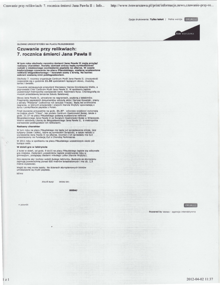 Carwanieprry relikwiach:7. rocmica śmierciJanaPawłaII :: Info.'. opq'edrukowan|a:Tylkotekst I PełnaWersja sffi GŁÓWNE uRocilsTośc| NA PLAoU P|ŁsuosK|EGo Czuwanie przy relikwiach: 7. rocznica śmierciJana Pawłall w tym roku obchody rocznlcy śmiercl Jana Prwła Il ma'ą przyJąć radoŚny charakter. Kwiaty zeml.3t znlczy będą 'Ymbollzow.ć radośćz niedawn.go wynieśl.n|a papleża na o|t'rze' w cz.3|e tradYcyjnego czuwania na p|acu P||gudrk|ego, zo3taną wygtlwlon€ rel|kwie błogostawionego - kawałGk sz.ty z krw|ą. Na kon|ec zebrani zostaną nImi pobłogosław|cni' obchody 7' rocznicyorganizujecentrum Myś|l Jana PawłaII' Uroeystość rozpoczniesię o godzinie21.oo spektak|emłączącymsłowo'murykę' taniec i światło' CzuwaniezainaugurujeprezydentWarszawy Hanna Gronklewicz-Waltz,a poprowadzichór centrum Myś|i Jana PawłaII. W sPotkaniubędzle uczestniŹyłmetropoIitawar9zawsk|kard, Kaz|m|enNyą' choreograflędo muzyki przedstaw|ątancerze szkoły Baletowej' popłynązte|ebhów. słowaJana PawłaII, utrwalonena nagran|ach. Fragmentypapiesk|chdokumentów odczytaaktor Darlusz Kowa|skl,znany ''P|ebania,. (odtwórca ro||JanuszaTracza). Będąteżarch|walne z seria|u nagrania,w których pr.yjacie|ei znajoml Karo|aWojtyłyopow|adaJąo pontyfikacie papieża i z Po|ski' łciu Rna| czuwaniaprzypadn|ena godz.2t.37 . wóWeas wojskowlwykonają na trąbc€ utwór ,.cisza',.Jak podałocentrum opatrznośc| BożeJ,takżeo godz.2l|37 na pIacuP|łsudsklego zostanąwystaw|one re||kWIe Błogosławionego Jana PawłaII ze ŚWiątyn|opatrznośc| BożeJW wilanow|e. Wierni odmówią Litaniędo Błogos,lawlonego Jana Pawłau, a metropo||t8 warszawskipobłogosławl ich re||kw|am|' Radosny chatal.t€ r W tym roku na placu P|łsudsk|ego n|e będąJużsprzedawanezn|ee, |ecz tu|ipany(białei Źófte), które są symbo|emśWlętośd, a takżeradośc| z wyniesieniaJana PawłaII na ołtaue' Dochód z |chspzedaży ma być pzeznaąonY na Fundacjęiyć z chorobą Park|nsona. W 2011 roku W spotkaniuna p|acuP|łsudsklego ueestn|cyło okołopół tysiącaosÓb. w dzień gra w |ablrync|e z ko|eiw dzień. od godz. 9 do15 na p|acuP|łsudskiego będz|es|ęodbywała gra miejska. zadan|emuczestnlkóWbędz|eprz€ t rwanle roku w gimna4um, podążającś|adamI młodegoLo|ka(Karo|aWojwv). Gra za@yna s|ę i kończy Wokołdużego|ab|ryntu.Budowlaze styroplanu zajmuję powierzchn|ęponad 600 metrów kwadratowychI ma ok. 1,5 metra wysokości. WeJść do niej możekażdy.Na śc|anach styroplanowychb|oków umieszczone są myślIpap|eża. bilmz zcŁos BtĄD < poułrót mDAJ Do: W Powered by Veneo - agencja interaktywna lzl 2012-04-0fll:37