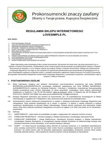REGULAMIN SKLEPU INTERNETOWEGO LOVESIMPLE.PL SPIS TREŚCI: POSTANOWIENIA OGÓLNE USŁUGI ELEKTRONICZNE W SKLEPIE INTERNETOWYM WARUNKI ZAWIERANIA UMOWY SPRZEDAŻY SPOSOBY I TERMINY PŁATNOŚCI ZA PRODUKT KOSZT, SPOSOBY I TERMIN DOSTAWY PRODUKTU REKLAMACJA PRODUKTU POZASĄDOWE SPOSOBY ROZPATRYWANIA REKLAMACJI I DOCHODZENIA ROSZCZEŃ ORAZ ZASADY DOSTĘPU DO TYCH PROCEDUR 8. PRAWO ODSTĄPIENIA OD UMOWY (DOTYCZY UMÓW SPRZEDAŻY ZAWARTYCH OD 25 GRUDNIA 2014 ROKU) 9. POSTANOWIENIA DOTYCZĄCE PRZEDSIĘBIORCÓW 10. POSTANOWIENIA KOŃCOWE 11. WZÓR FORMULARZA ODSTĄPIENIA OD UMOWY 1. 2. 3. 4. 5. 6. 7. Sklep Internetowy www.lovesimple.pl dba o prawa konsumenta. Konsument nie może zrzec się praw przyznanych mu w Ustawie o Prawach Konsumenta. Postanowienia umów mniej korzystne dla konsumenta niż postanowienia Ustawy o Prawach Konsumenta są nieważne, a w ich miejsce stosuje się przepisy Ustawy o Prawach Konsumenta. Dlatego też postanowienia niniejszego Regulaminu nie mają na celu wyłączać ani ograniczać jakichkolwiek praw konsumentów przysługujących im na mocy bezwzględnie wiążących przepisów prawa, a wszelkie ewentualne wątpliwości należy tłumaczyć na korzyść konsumenta. W przypadku ewentualnej niezgodności postanowień niniejszego Regulaminu z powyższymi przepisami, pierwszeństwo mają te przepisy i należy je stosować. 1. POSTANOWIENIA OGÓLNE 1.1. Sklep Internetowy dostępny pod adresem internetowym www.lovesimple.pl prowadzony jest przez MONIKĘ BACZEWSKĄ-ALEXANDROPOULOU prowadzącą działalność gospodarczą pod firmą MONIKA BACZEWSKAALEXANDROPOULOU wpisaną do Centralnej Ewidencji i Informacji o Działalności Gospodarczej Rzeczypospolitej Polskiej prowadzonej przez ministra właściwego do spraw gospodarki, posiadającą: adres miejsca wykonywania działalności: ul. Szafarnia 11 lok. F8, 80-755 Gdańsk i adres do doręczeń: Jantar, ul. Rybacka 23a, 82-103 Stegna, NIP: 5781010147, REGON: 222120962 oraz adres poczty elektronicznej: [email protected]. 1.2. Niniejszy Regulamin skierowany jest zarówno do konsumentów, jak i do przedsiębiorców korzystających ze Sklepu Internetowego (z wyjątkiem pkt. 9 Regulaminu, który skierowany jest wyłącznie do przedsiębiorców). 1.3. Administratorem danych osobowych przetwarzanych w związku z realizacją postanowień niniejszego Regulaminu jest Usługodawca. Dane osobowe przetwarzane są w celach, w zakresie i w oparciu o zasady wskazane w polityce prywatności opublikowanej na stronach Sklepu Internetowego. Podanie danych osobowych jest dobrowolne. Każda osoba, której dane osobowe przetwarza Usługodawca ma prawo do wglądu w ich treść oraz prawo do ich aktualizacji i poprawiania. 1.4. Definicje: 1.4.1. DZIEŃ ROBOCZY – jeden dzień od poniedziałku do piątku z wyłączeniem dni ustawowo wolnych od pracy. 1.4.2. FORMULARZ REJESTRACJI – formularz dostępny w Sklepie Internetowym umożliwiający utworzenie Konta. 1.4.3. FORMULARZ ZAMÓWIENIA – Usługa Elektroniczna, interaktywny formularz dostępny w Sklepie Internetowym umożliwiający złożenie Zamówienia, w szczególności poprzez dodanie Produktów do elektronicznego koszyka oraz określenie warunków Umowy Sprzedaży, w tym sposobu dostawy i płatności. 1.4.4. KLIENT – (1) osoba fizyczna posiadająca pełną zdolność do czynności prawnych, a w wypadkach przewidzianych przez przepisy powszechnie obowiązujące także osoba fizyczna posiadająca ograniczoną zdolność do czynności prawnych; (2) osoba prawna; albo (3) jednostka organizacyjna nieposiadająca osobowości prawnej, której ustawa przyznaje zdolność prawną; - która zawarła lub zamierza zawrzeć Umowę Sprzedaży ze Sprzedawcą. Strona 1 z 8 1.4.5. KODEKS CYWILNY – ustawa kodeks cywilny z dnia 23 kwietnia 1964 r. (Dz.U. 1964 nr 16, poz. 93 ze zm.). 1.4.6. KONTO – Usługa Elektroniczna, oznaczony indywidualną nazwą (loginem) i hasłem podanym przez Usługobiorcę zbiór zasobów w systemie teleinformatycznym Usługodawcy, w którym gromadzone są dane podane przez Usługobiorcę oraz informacje o złożonych przez niego Zamówieniach w Sklepie Internetowym. 1.4.7. NEWSLETTER – Usługa Elektroniczna, elektroniczna usługa dystrybucyjna świadczona przez Usługodawcę za pośrednictwem poczty elektronicznej e-mail, która umożliwia wszystkim korzystającym z niej Usługobiorcom automatyczne otrzymywanie od Usługodawcy cyklicznych treści kolejnych edycji newslettera zawierającego informacje o Produktach, nowościach i promocjach w Sklepie Internetowym. 1.4.8. PRODUKT – dostępna w Sklepie Internetowym rzecz ruchoma będąca przedmiotem Umowy Sprzedaży między Klientem a Sprzedawcą. 1.4.9. REGULAMIN – niniejszy regulamin Sklepu Internetowego. 1.4.10. SKLEP INTERNETOWY - sklep internetowy Usługodawcy dostępny pod adresem internetowym: www.lovesimple.pl. 1.4.11. SPRZEDAWCA; USŁUGODAWCA – MONIKA BACZEWSKA-ALEXANDROPOULOU prowadząca działalność gospodarczą pod firmą MONIKA BACZEWSKA-ALEXANDROPOULOU wpisana do Centralnej Ewidencji i Informacji o Działalności Gospodarczej Rzeczypospolitej Polskiej prowadzonej przez ministra właściwego do spraw gospodarki, posiadająca: adres miejsca wykonywania działalności: ul. Szafarnia 11 lok. F8, 80-755 Gdańsk i adres do doręczeń: Jantar, ul. Rybacka 23a, 82-103 Stegna, NIP: 5781010147, REGON: 222120962 oraz adres poczty elektronicznej: [email protected]. 1.4.12. UMOWA SPRZEDAŻY – umowa sprzedaży Produktu zawierana albo zawarta między Klientem a Sprzedawcą za pośrednictwem Sklepu Internetowego. 1.4.13. USŁUGA ELEKTRONICZNA – usługa świadczona drogą elektroniczną przez Usługodawcę na rzecz Usługobiorcy za pośrednictwem Sklepu Internetowego. 1.4.14. USŁUGOBIORCA – (1) osoba fizyczna posiadająca pełną zdolność do czynności prawnych, a w wypadkach przewidzianych przez przepisy powszechnie obowiązujące także osoba fizyczna posiadająca ograniczoną zdolność do czynności prawnych; (2) o