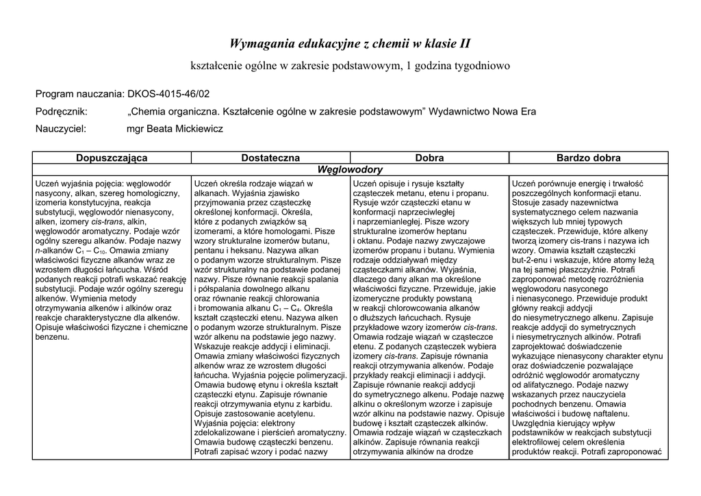 Wymagania edukacyjne z chemii w klasie II kształcenie ogólne w zakresie podstawowym, 1 godzina tygodniowo Program nauczania: DKOS-4015-46/02 Podręcznik: „Chemia organiczna. Kształcenie ogólne w zakresie podstawowym” Wydawnictwo Nowa Era Nauczyciel: mgr Beata Mickiewicz Dopuszczająca Dostateczna Dobra Bardzo dobra Uczeń opisuje i rysuje kształty cząsteczek metanu, etenu i propanu. Rysuje wzór cząsteczki etanu w konformacji naprzeciwległej i naprzemianległej. Pisze wzory strukturalne izomerów heptanu i oktanu. Podaje nazwy zwyczajowe izomerów propanu i butanu. Wymienia rodzaje oddziaływań między cząsteczkami alkanów. Wyjaśnia, dlaczego dany alkan ma określone właściwości fizyczne. Przewiduje, jakie izomeryczne produkty powstaną w reakcji chlorowcowania alkanów o dłuższych łańcuchach. Rysuje przykładowe wzory izomerów cis-trans. Omawia rodzaje wiązań w cząsteczce etenu. Z podanych cząsteczek wybiera izomery cis-trans. Zapisuje równania reakcji otrzymywania alkenów. Podaje przykłady reakcji eliminacji i addycji. Zapisuje równanie reakcji addycji do symetrycznego alkenu. Podaje nazwę alkinu o określonym wzorze i zapisuje wzór alkinu na podstawie nazwy. Opisuje budowę i kształt cząsteczek alkinów. Omawia rodzaje wiązań w cząsteczkach alkinów. Zapisuje równania reakcji otrzymywania alkinów na drodze Uczeń porównuje energię i trwałość poszczególnych konformacji etanu. Stosuje zasady nazewnictwa systematycznego celem nazwania większych lub mniej typowych cząsteczek. Przewiduje, które alkeny tworzą izomery cis-trans i nazywa ich wzory. Omawia kształt cząsteczki but-2-enu i wskazuje, które atomy leżą na tej samej płaszczyźnie. Potrafi zaproponować metodę rozróżnienia węglowodoru nasyconego i nienasyconego. Przewiduje produkt główny reakcji addycji do niesymetrycznego alkenu. Zapisuje reakcje addycji do symetrycznych i niesymetrycznych alkinów. Potrafi zaprojektować doświadczenie wykazujące nienasycony charakter etynu oraz doświadczenie pozwalające odróżnić węglowodór aromatyczny od alifatycznego. Podaje nazwy wskazanych przez nauczyciela pochodnych benzenu. Omawia właściwości i budowę naftalenu. Uwzględnia kierujący wpływ podstawników w reakcjach substytucji elektrofilowej celem określenia produktów reakcji. Potrafi zaproponować Węglowodory Uczeń wyjaśnia pojęcia: węglowodór nasycony, alkan, szereg homologiczny, izomeria konstytucyjna, reakcja substytucji, węglowodór nienasycony, alken, izomery cis-trans, alkin, węglowodór aromatyczny. Podaje wzór ogólny szeregu alkanów. Podaje nazwy n-alkanów C1 – C10. Omawia zmiany właściwości fizyczne alkanów wraz ze wzrostem długości łańcucha. Wśród podanych reakcji potrafi wskazać reakcję substytucji. Podaje wzór ogólny szeregu alkenów. Wymienia metody otrzymywania alkenów i alkinów oraz reakcje charakterystyczne dla alkenów. Opisuje właściwości fizyczne i chemiczne benzenu. Uczeń określa rodzaje wiązań w alkanach. Wyjaśnia zjawisko przyjmowania przez cząsteczkę określonej konformacji. Określa, które z podanych związków są izomerami, a które homologami. Pisze wzory strukturalne izomerów butanu, pentanu i heksanu. Nazywa alkan o podanym wzorze strukturalnym. Pisze wzór strukturalny na podstawie podanej nazwy. Pisze równanie reakcji spalania i półspalania dowolnego alkanu oraz równanie reakcji chlorowania i bromowania alkanu C1 – C4. Określa kształt cząsteczki etenu. Nazywa alken o podanym wzorze strukturalnym. Pisze wzór alkenu na podstawie jego nazwy. Wskazuje reakcje addycji i eliminacji. Omawia zmiany właściwości fizycznych alkenów wraz ze wzrostem długości łańcucha. Wyjaśnia pojęcie polimeryzacji. Omawia budowę etynu i określa kształt cząsteczki etynu. Zapisuje równanie reakcji otrzymywania etynu z karbidu. Opisuje zastosowanie acetylenu. Wyjaśnia pojęcia: elektrony zdelokalizowane i pierścień aromatyczny. Omawia budowę cząsteczki benzenu. Potrafi zapisać wzory i podać nazwy najbliższych homologów benzenu. eliminacji. Zapisuje równanie reakcji wieloetapową syntezę związku nitrowania i chlorowania benzenu aromatycznego. oraz spalania benzenu w powietrzu i tlenie. Uzasadnia aromatyczny charakter benzenu przez analizę struktury elektronowej cząsteczki. Wyjaśnia pojęcia: elektrofil, substytucja elektrofilowa. Umie zastosować w nazewnictwie przedrostki: orto-, meta-, para-. Zapisuje równania reakcji, którym ulega benzen i toluen. Nazywa wielopodstawione pochodne benzenu. Jednofunkcyjne pochodne węglowodorów Uczeń podaje nazwy prostych alkoholi jednowodorotlenowych. Określa rzędowość alkoholu jednowodorotlenowego. Wymienia metody otrzymywania alkoholi. Opisuje właściwości fizyczne metanolu, etanolu i butan-1-olu. Wymienia reakcje charakterystyczne dla alkoholi. Opisuje właściwości fizyczne glicerolu. Podaje nazwę systematyczną i zwyczajową glicerolu i glikolu etylenowego. Rozróżnia wzory alkoholi od fenoli. Opisuje właściwości fizyczne fenolu. Wymienia zastosowania etanolu, glikolu etylenowego, glicerolu i fenolu. Wyjaśnia pojęcia: związek karbonylowy, grupa karbonylowa, aldehyd i keton. Podaje nazwy prostych aldehydów i ketonów. Podaje sposób otrzymywania aldehydów i ketonów. Opisuje właściwości fizyczne metanalu i acetonu oraz ich zastosowanie. Podaje nazwy systematyczne i zwyczajowe prostych kwasów karboksylowych oraz kwasu palmitynowego, stearynowego i oleinowego. Określa typ reakcji otrzymywania kwasów karboksylowych. Opisuje właściwości fizyczne kwasu octowego i stearynowego. Podaje nazwy Uczeń potrafi napisać wzór alkoholu jednowodorotlenowego na podstawie jego nazwy. Umie napisać wzory izomerycznych alkoholi jednowodorotlenowych C1 – C4. Potrafi napisać równanie reakcji otrzymywania prostych alkoholi z alkenu i chlorowcopochodnej oraz równanie reakcji fermentacji alkoholowej glukozy. Zapisuje równania reakcj
