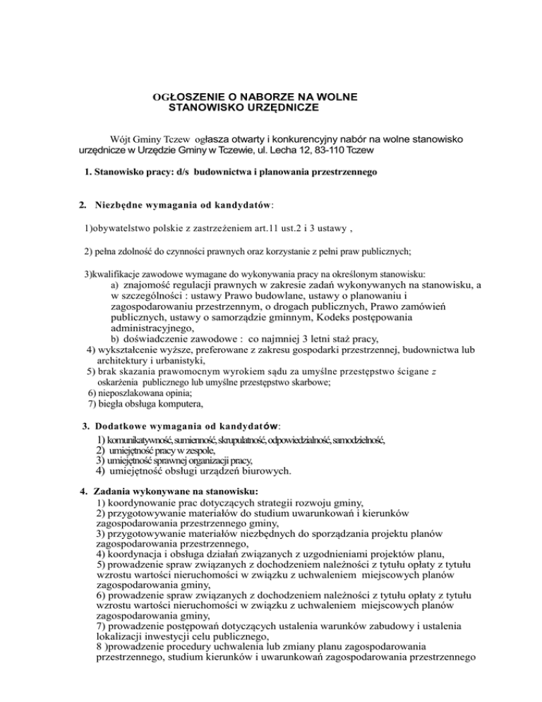 OGŁOSZENIE O NABORZE NA WOLNE STANOWISKO URZĘDNICZE Wójt Gminy Tczew ogłasza otwarty i konkurencyjny nabór na wolne stanowisko urzędnicze w Urzędzie Gminy w Tczewie, ul. Lecha 12, 83-110 Tczew 1. Stanowisko pracy: d/s budownictwa i planowania przestrzennego 2. Niezbędne wymagania od kandydatów: 1)obywatelstwo polskie z zastrzeżeniem art.11 ust.2 i 3 ustawy , 2) pełna zdolność do czynności prawnych oraz korzystanie z pełni praw publicznych; 3)kwalifikacje zawodowe wymagane do wykonywania pracy na określonym stanowisku: a) znajomość regulacji prawnych w zakresie zadań wykonywanych na stanowisku, a w szczególności : ustawy Prawo budowlane, ustawy o planowaniu i zagospodarowaniu przestrzennym, o drogach publicznych, Prawo zamówień publicznych, ustawy o samorządzie gminnym, Kodeks postępowania administracyjnego, b) doświadczenie zawodowe : co najmniej 3 letni staż pracy, 4) wykształcenie wyższe, preferowane z zakresu gospodarki przestrzennej, budownictwa lub architektury i urbanistyki, 5) brak skazania prawomocnym wyrokiem sądu za umyślne przestępstwo ścigane z oskarżenia publicznego lub umyślne przestępstwo skarbowe; 6) nieposzlakowana opinia; 7) biegła obsługa komputera, 3. Dodatkowe wymagania od kandydatów: 1) komunikatywność, sumienność, skrupulatność, odpowiedzialność, samodzielność, 2) umiejętność pracy w zespole, 3) umiejętność sprawnej organizacji pracy, 4) umiejętność obsługi urządzeń biurowych. 4. Zadania wykonywane na stanowisku: 1) koordynowanie prac dotyczących strategii rozwoju gminy, 2) przygotowywanie materiałów do studium uwarunkowań i kierunków zagospodarowania przestrzennego gminy, 3) przygotowywanie materiałów niezbędnych do sporządzania projektu planów zagospodarowania przestrzennego, 4) koordynacja i obsługa działań związanych z uzgodnieniami projektów planu, 5) prowadzenie spraw związanych z dochodzeniem należności z tytułu opłaty z tytułu wzrostu wartości nieruchomości w związku z uchwaleniem miejscowych planów zagospodarowania gminy, 6) prowadzenie spraw związanych z dochodzeniem należności z tytułu opłaty z tytułu wzrostu wartości nieruchomości w związku z uchwaleniem miejscowych planów zagospodarowania gminy, 7) prowadzenie postępowań dotyczących ustalenia warunków zabudowy i ustalenia lokalizacji inwestycji celu publicznego, 8 )prowadzenie procedury uchwalenia lub zmiany planu zagospodarowania przestrzennego, studium kierunków i uwarunkowań zagospodarowania przestrzennego gminy, 9) opracowywanie projektów aktów normatywnych dotyczących zatwierdzenia albo zmian planów zagospodarowania przestrzennego, 10) wydawanie wyrysów i wypisów z planu zagospodarowania przestrzennego, 11) wydawanie zaświadczeń o przeznaczeniu terenu w planach zagospodarowania przestrzennego. 5. Informacja o warunkach pracy na danym stanowisku a) miejsce pracy : Urząd Gminy w Tczewie ul. Lecha 12, b) zatrudnienie w pełnym wymiarze czasu pracy – 40 godz. tygodniowo, c) umowa o pracę na czas określony z możliwością przedłużenia na czas nieokreślony. 6. Wskaźnik zatrudnienia osób niepełnosprawnych W miesiącu poprzedzającym datę upublicznienia ogłoszenia wskaźnik zatrudnienia osób niepełnosprawnych w Urzędzie , w rozumieniu przepisów o rehabilitacji zawodowej i społecznej oraz zatrudnieniu osób niepełnosprawnych jest niższy niż 6 %. 7. Wymagane dokumenty: a) list motywacyjny i CV, b) kwestionariusz osobowy, c) kserokopia dokumentów potwierdzających posiadane wykształcenie i kwalifikacje dodatkowe oraz dokumenty potwierdzające posiadany staż pracy, d) kopia dokumentu potwierdzającego niepełnosprawność/ dotyczy kandydatów, którzy zamierzają skorzystać z uprawnienia, o którym mowa w art.13 a ust.2., e) oświadczenie kandydata o braku skazania prawomocnym wyrokiem sądu za umyślne przestępstwo ścigane z oskarżenia publicznego lub umyślne przestępstwo skarbowe , f) oświadczenie kandydata o pełnej zdolności do czynności prawnych oraz o korzystaniu z pełni praw publicznych, g) oświadczenie kandydata o wyrażeniu zgody na przetwarzanie danych osobowych do celów rekrutacji zgodnie z ustawą o ochronie danych osobowych( Dz.U. z 2002 roku Nr 101, poz.926 z póź.zm.), h) w przypadku obywateli UE udokumentowana znajomość języka polskiego. 8. Miejsce i termin złożenia dokumentów. Wymagane dokumenty aplikacyjne należy składać w sekretariacie Urzędu Gminy w Tczewie ( pokój nr 5 ) lub przesłać pocztą na adres : Urząd Gminy w Tczewie ul. Lecha 12, 83-110 Tczew w zamkniętej kopercie z dopiskiem '' Nabór na stanowisko ds. budownictwa i planowania przestrzennego '' w terminie do dnia 05.10.2015 roku. W razie złożenia dokumentów drogą pocztową , za datę ich złożenie uważa się datę wpływu do Sekretariatu Urzędu Gminy. Aplikacje, które wpłyną do urzędu po wyżej określonym terminie nie będą rozpatrywane. Wójt (-) Roman Rezmerowski