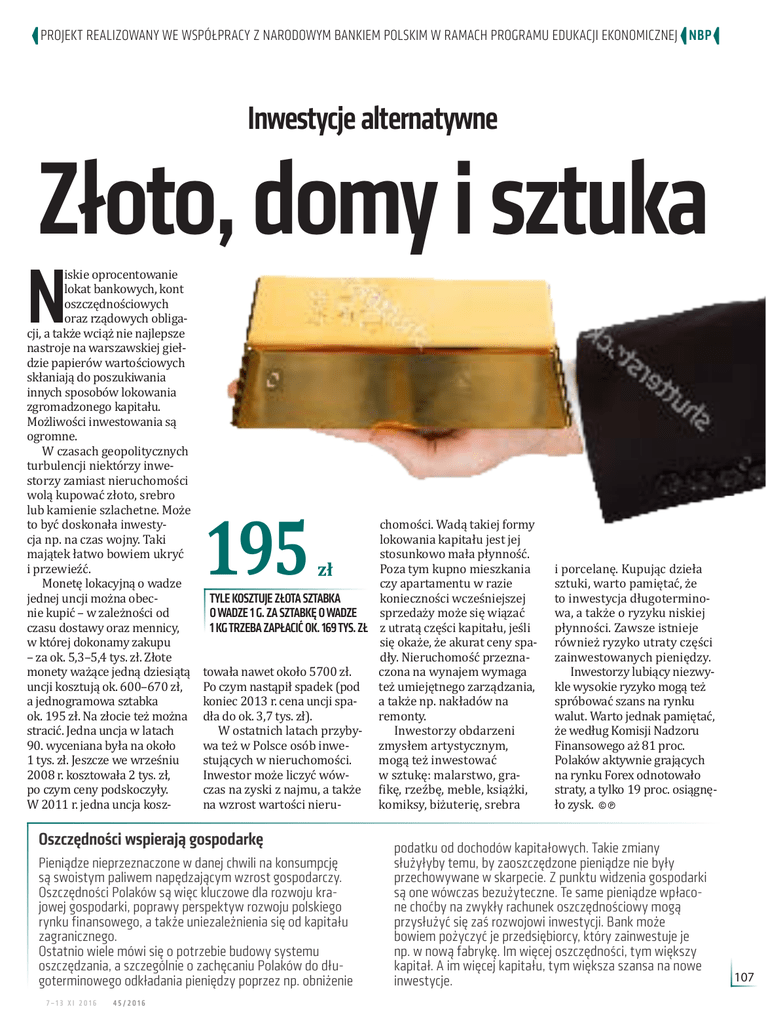 PROJEKT REALIZOWANY WE WSPÓŁPRACY Z NARODOWYM BANKIEM POLSKIM W RAMACH PROGRAMU EDUKACJI EKONOMICZNEJ NBP Inwestycje alternatywne Złoto, domy i sztuka N iskie oprocentowanie lokat bankowych, kont oszczędnościowych oraz rządowych obligacji, a także wciąż nie najlepsze nastroje na warszawskiej giełdzie papierów wartościowych skłaniają do poszukiwania innych sposobów lokowania zgromadzonego kapitału. Możliwości inwestowania są ogromne. W czasach geopolitycznych turbulencji niektórzy inwestorzy zamiast nieruchomości wolą kupować złoto, srebro lub kamienie szlachetne. Może to być doskonała inwestycja np. na czas wojny. Taki majątek łatwo bowiem ukryć i przewieźć. Monetę lokacyjną o wadze jednej uncji można obecnie kupić – w zależności od czasu dostawy oraz mennicy, w której dokonamy zakupu – za ok. 5,3–5,4 tys. zł. Złote monety ważące jedną dziesiątą uncji kosztują ok. 600–670 zł, a jednogramowa sztabka ok. 195 zł. Na złocie też można stracić. Jedna uncja w latach 90. wyceniana była na około 1 tys. zł. Jeszcze we wrześniu 2008 r. kosztowała 2 tys. zł, po czym ceny podskoczyły. W 2011 r. jedna uncja kosz- 195 chomości. Wadą takiej formy lokowania kapitału jest jej stosunkowo mała płynność. Poza tym kupno mieszkania zł czy apartamentu w razie konieczności wcześniejszej tyle kosztuje złota sztabka sprzedaży może się wiązać o wadze 1 g. za sztabkę o wadze 1 kg trzeba zapłacić ok. 169 tys. zł z utratą części kapitału, jeśli się okaże, że akurat ceny spadły. Nieruchomość przeznatowała nawet około 5700 zł. czona na wynajem wymaga Po czym nastąpił spadek (pod też umiejętnego zarządzania, koniec 2013 r. cena uncji spaa także np. nakładów na remonty. dła do ok. 3,7 tys. zł). Inwestorzy obdarzeni W ostatnich latach przybyzmysłem artystycznym, wa też w Polsce osób inwemogą też inwestować stujących w nieruchomości. w sztukę: malarstwo, graInwestor może liczyć wówczas na zyski z najmu, a także fikę, rzeźbę, meble, książki, na wzrost wartości nierukomiksy, biżuterię, srebra Oszczędności wspierają gospodarkę Pieniądze nieprzeznaczone w danej chwili na konsumpcję są swoistym paliwem napędzającym wzrost gospodarczy. Oszczędności Polaków są więc kluczowe dla rozwoju krajowej gospodarki, poprawy perspektyw rozwoju polskiego rynku finansowego, a także uniezależnienia się od kapitału zagranicznego. Ostatnio wiele mówi się o potrzebie budowy systemu oszczędzania, a szczególnie o zachęcaniu Polaków do długoterminowego odkładania pieniędzy poprzez np. obniżenie 7–13 XI 2016 45/2016 i porcelanę. Kupując dzieła sztuki, warto pamiętać, że to inwestycja długoterminowa, a także o ryzyku niskiej płynności. Zawsze istnieje również ryzyko utraty części zainwestowanych pieniędzy. Inwestorzy lubiący niezwykle wysokie ryzyko mogą też spróbować szans na rynku walut. Warto jednak pamiętać, że według Komisji Nadzoru Finansowego aż 81 proc. Polaków aktywnie grających na rynku Forex odnotowało straty, a tylko 19 proc. osiągnęło zysk. © ℗ podatku od dochodów kapitałowych. Takie zmiany służyłyby temu, by zaoszczędzone pieniądze nie były przechowywane w skarpecie. Z punktu widzenia gospodarki są one wówczas bezużyteczne. Te same pieniądze wpłacone choćby na zwykły rachunek oszczędnościowy mogą przysłużyć się zaś rozwojowi inwestycji. Bank może bowiem pożyczyć je przedsiębiorcy, który zainwestuje je np. w nową fabrykę. Im więcej oszczędności, tym większy kapitał. A im więcej kapitału, tym większa szansa na nowe inwestycje. 107