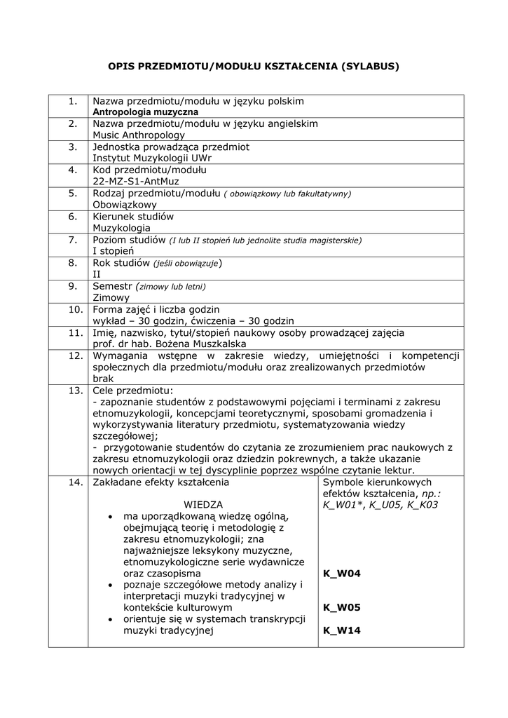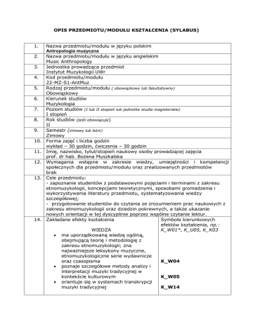 OPIS PRZEDMIOTU/MODUŁU KSZTAŁCENIA (SYLABUS) 1. 2. 3. 4. 5. 6. 7. 8. 9. 10. 11. 12. 13. 14. Nazwa przedmiotu/modułu w języku polskim Antropologia muzyczna Nazwa przedmiotu/modułu w języku angielskim Music Anthropology Jednostka prowadząca przedmiot Instytut Muzykologii UWr Kod przedmiotu/modułu 22-MZ-S1-AntMuz Rodzaj przedmiotu/modułu ( obowiązkowy lub fakultatywny) Obowiązkowy Kierunek studiów Muzykologia Poziom studiów (I lub II stopień lub jednolite studia magisterskie) I stopień Rok studiów (jeśli obowiązuje) II Semestr (zimowy lub letni) Zimowy Forma zajęć i liczba godzin wykład – 30 godzin, ćwiczenia – 30 godzin Imię, nazwisko, tytuł/stopień naukowy osoby prowadzącej zajęcia prof. dr hab. Bożena Muszkalska Wymagania wstępne w zakresie wiedzy, umiejętności i kompetencji społecznych dla przedmiotu/modułu oraz zrealizowanych przedmiotów brak Cele przedmiotu: - zapoznanie studentów z podstawowymi pojęciami i terminami z zakresu etnomuzykologii, koncepcjami teoretycznymi, sposobami gromadzenia i wykorzystywania literatury przedmiotu, systematyzowania wiedzy szczegółowej; - przygotowanie studentów do czytania ze zrozumieniem prac naukowych z zakresu etnomuzykologii oraz dziedzin pokrewnych, a także ukazanie nowych orientacji w tej dyscyplinie poprzez wspólne czytanie lektur. Zakładane efekty kształcenia Symbole kierunkowych efektów kształcenia, np.: WIEDZA K_W01*, K_U05, K_K03 ma uporządkowaną wiedzę ogólną, obejmującą teorię i metodologię z zakresu etnomuzykologii; zna najważniejsze leksykony muzyczne, etnomuzykologiczne serie wydawnicze oraz czasopisma K_W04 poznaje szczegółowe metody analizy i interpretacji muzyki tradycyjnej w kontekście kulturowym K_W05 orientuje się w systemach transkrypcji muzyki tradycyjnej K_W14 UMIEJĘTNOŚCI potrafi wyszukiwać, analizować, oceniać, selekcjonować i użytkować informacje z wykorzystaniem różnych źródeł - materiały nutowe (transkrypcje muzyczne), źródła fonograficzne, instrumenty, materiały archiwalne posiada umiejętność charakteryzowania muzyki tradycyjnej różnych kontynentów oraz polskiej kultury ludowej, potrafi stosować zasady poprawnej dokumentacji muzycznej i opisu etnograficznego w teorii i praktyce potrafi używać języka specjalistycznego i porozumiewać się w sposób precyzyjny i spójny przy użyciu różnych kanałów i technik komunikacyjnych ze specjalistami w zakresie muzykologii, jak i z odbiorcami spoza grona specjalistów, w języku polskim i obcym posiada umiejętność przygotowania prac pisemnych w języku polskim, dotyczących tradycyjnych kultur muzycznych z wykorzystaniem podstawowych pojęć teoretycznych, a także różnych źródeł posiada umiejętność przygotowania wystąpień ustnych w języku polskim, dotyczących tradycyjnych kultur muzycznych z wykorzystaniem podstawowych pojęć teoretycznych, a także różnych źródeł K_UO1 K_UO8 K_U14 K_U15 K_U16 KOMPETENCJE SPOŁECZNE ma pogłębioną świadomość poziomu swojej wiedzy i umiejętności, rozumie potrzebę ciągłego rozwoju osobistego i zawodowego K_K01 uczestniczy w koncertach muzyki tradycyjnej K_K06 15. Treści programowe Historia dyscypliny, jej przedmiot badań i metody; kolejne etapy badań etnomuzykologicznych, od eksploracji terenowej poprzez transkrypcję muzyczną po analizę muzyki w powiązaniu z kontekstem kulturowym; nowe kierunki badań w etnomuzykologii. 16. Zalecana literatura (podręczniki) Merriam Alan P., The Anthropology of Music. Bloomington 1964; Blacking John, How Musical is Man? Seattle 1973; Żerańska-Kominek Sławomira, Muzyka w kulturze. Warszawa 1995; Barz Gregory F. & Cooley Timothy J. (red.), Shadows in the Field. Oxford 2008; Feld Steven, Sound and Sentiment: Birds, Weeping, Poetics, and Song in Kaluli Expression, 3rd edition. Durham, London 2012; Tia de Nora, Music in Everyday Life. Cambridge 2004; Clarke Eric, Cook Nicolas, Empirical Musicology.Oxford 2004; artykuły wybrane przez studentów do zreferowania. 17. Forma zaliczenia poszczególnych komponentów przedmiotu/modułu, sposób sprawdzenia osiągnięcia zamierzonych efektów kształcenia: wykład: egzamin (obowiązuje materiał z wykładów i ćwiczeń) ćwiczenia: warunkiem zaliczenia – aktywne uczestnictwo zajęciach oraz zreferowanie wybranej lektury; zaliczenie na stopień. seminarium: laboratorium: konwersatorium: 18. Język wykładowy Polski 19. Obciążenie pracą studenta Forma aktywności studenta Godziny zajęć (wg planu studiów) z nauczycielem: - wykład: - ćwiczenia: - laboratorium: - konwersatorium: Praca własna studenta, np.: - przygotowanie do zajęć: - opracowanie wyników: - czytanie wskazanej literatury: - napisanie raportu z zajęć: - przygotowanie do egzaminu: Suma godzin Liczba punktów ECTS *objaśnienie symboli: K (przed podkreślnikiem)- kierunkowe efekty kształcenia W - kategoria wiedzy U - kategoria umiejętności K (po podkreślniku) - kategoria kompetencji społecznych 01, 02, 03 i kolejne - numer efektu kształcenia Średnia liczba godzin na zrealizowanie aktywności 30 30 30 30 120 4