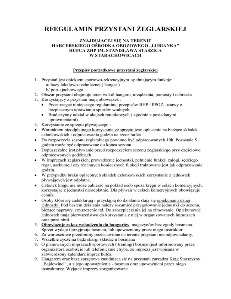 RFEGULAMIN PRZYSTANI ŻEGLARSKIEJ ZNAJDUJACEJ SIĘ NA TERENIE HARCERSKIEGO OŚRODKA OBOZOWEGO „LUBIANKA” HUFCA ZHP IM. STANISŁAWA STASZICA W STARACHOWICACH Przepisy porządkowe przystani żeglarskiej 1. Przystań jest obiektem sportowo-rekreacyjnym spełniającym funkcje: a/ bazy lokalowo-technicznej ( hangar ) b/ portu jachtowego 2. Obszar przystani obejmuje teren wokół hangaru, urządzenia, pomosty i nabrzeża 3. Korzystający z przystani mają obowiązek : Przestrzegać niniejszego regulaminu, przepisów BHP i PPOŻ, ustawy o bezpiecznym uprawianiu sportów wodnych, Brać czynny udział w akcjach ratunkowych ( zgodnie z posiadanymi uprawnieniami) 4. Korzystanie ze sprzętu pływającego : Warunkiem nieodpłatnego korzystania ze sprzętu jest: opłacenie na bieżąco składek członkowskich i odpracowania godzin na rzecz hufca Do rozpoczęcia sezonu żeglarskiego powinno być odpracowanych 10h. Pozostałe 5 godzin może być odpracowane do końca sezonu. Dopuszczalne jest pływanie przed rozpoczęciem sezonu żeglarskiego przy częściowo odpracowanych godzinach . W imprezach żeglarskich, prowadzenie jednostki, pełnienie funkcji załogi, sędziego regat, asekuracji czy tez innych koniecznych funkcji traktowane jest jak odpracowanie godzin. W przypadku braku opłaconych składek członkowskich korzystanie z jednostek pływających jest odpłatne. Członek kręgu nie może zabierać na pokład osób spoza kręgu w celach komercyjnych, korzystając z jednostki nieodpłatnie. Dla pływań w celach komercyjnych obowiązuje cennik. Osoby które się zadeklarują i przystąpią do działania stają się opiekunami danej jednostki. Pod hasłem działania należy rozumieć przygotowanie jednostki do sezonu, bieżące naprawy, czyszczenie itd. Do zabezpieczenia jej na zimowanie. Opiekunowie jednostek mają pierwszeństwo do korzystania z niej w organizowanych imprezach oraz poza nimi. 5. Obowiązuje zakaz wchodzenia do hangarów, magazynów bez zgody bosmana. Sprzęt wydaje i przyjmuje bosman, lub upoważniony przez niego instruktor. 6. Za wartościowe przedmioty pozostawione na terenie przystani nie odpowiadamy. 7. Wszelkie życzenia bądź skargi składać u bosmana 8. O planowanych imprezach sportowych ( treningi) bosman jest informowany przez organizatora osobiście lub telefonicznie chyba, że impreza jest wpisana w zatwierdzony kalendarz imprez hufca. 9. Hangarem oraz bazą sprzętową znajdującą się na przystani zarządza Krąg Starszyzny „Bajdewind” , a z jego upoważnienia - bosman oraz upoważnieni przez niego instruktorzy. Wyjątek imprezy zorganizowane 10. W przypadku planowanych imprez z udziałem gości należy powiadomić o tym fakcie komendanta kręgu lub bosmana. 11. Na przystani obowiązuje zakaz spożywania napojów alkoholowych, środków odurzających i palenia tytoniu. Przepisy dotyczące żeglugi 1. Prowadzący jacht przed rozpoczęciem żeglugi jest obowiązany odnotować w książce pływań : nazwę i numer jachtu, nazwisko prowadzącego, liczbę członków załogi, datę i godzinę rozpoczęcia rejsu, przypuszczalny termin powrotu oraz po zakończeniu rejsu odnotować datę i godzinę powrotu, jak i uwagi o zdarzeniach lub wypadkach w trakcie rejsu, jeśli takie miały miejsce. 2. Wszelkie uszkodzenia sprzętu należy zgłaszać do bosmana. Koszty naprawy pokrywa winny uszkodzenia. 3. Za porządek oraz sprawność techniczna urządzeń, jednostek pływających odpowiada w kolejności : opiekun jachtu, bosman. 4. Wszelkie naprawy sprzętu muszą odbywać się w konsultacji z komendantem kręgu lub bosmanem. Zabrania się dokonywania samodzielnych napraw bez ich zgody . (Należy uzgodnić zakres prac, technikę wykonania, rodzaj materiałów, sposób finansowania ) 5. Do samodzielnego prowadzenia jachtu uprawnieni są żeglarze posiadający kwalifikacje potwierdzone właściwym patentem. 6. Osoby , które nie ukończyły 18 roku życia , a posiadają uprawnienia żeglarskie mogą uprawiać żeglarstwo w wyznaczonym akwenie pod nadzorem pełnoletniego żeglarza jachtowego bądź sternika motorowodnego. 7. Podczas pływań, przy pomoście powinna być przygotowana jednostka ratownicza, wyposażona w koło ratownicze, rzutkę, wiadra oraz dodatkowe kamizelki ratownicze. Jednostka ta nie może być wykorzystywana w tym czasie do innych celów. 8. W czasie obozów , pływań treningowych, regat odpowiedzialność za akcję ratowniczą przenosi się na organizatora imprezy. 9. Wszystkie jednostki pływające są zobligowane udzielić pomocy w wodzie potrzebującym. 10. Samowolne wyjście z przystani na wodę jest zabronione. 11. W czasie pływań obowiązuje nakaz stosowania środków bezpieczeństwa (np. kamizelka asekuracyjna bądź ratunkowa), chyba że kapitan jednostki na swoją odpowiedzialność zarządzi inaczej. 12. Bosman lub upoważniony przez niego instruktor może odmówić pozwolenia na wyjście na wodę jednostce w przypadku, gdy; Warunki atmosferyczne przekraczają dopuszczalne możliwości żeglugowe jednostki. Gdy prowadzący lub załoga nie spełnia wymagań określonych w wymaganiach dotyczących bezpiecznego uprawniania sportów wodnych. Brak pisemnej zgody rodziców na uprawianie żeglarstwa i samodzielnego prowadzenia jednostek ( zgodnie z posiadanymi uprawnieniami) dotyczy osób niepełnoletnich nie będących członkami ZHP. Bosman lub inna osoba posiadająca odpowiednią wiedzę stwierdziła niesprawność techniczną danej jednostki. Po powrocie z pływania osoby korzystające ze sprzętu zobowiązane są do sklarowania łodzi oraz zdania sprzętu bosmanowi.. Każda jednostka posiada swój komplet wyposażenia. Zakazuje się używać osprzętu z innych jednostek., Postanowienia końcowe 1. Za pilnowanie przestrzegania regulaminu odpowiada bosman przystani oraz wszyscy członkowie kręgu ( z wyjątkiem imprez zorganizowanych, gdzie odpowiedzialność spada na osobę odpowiedzialną za organizację imprezy) 2. Na przystani obowiązuje z