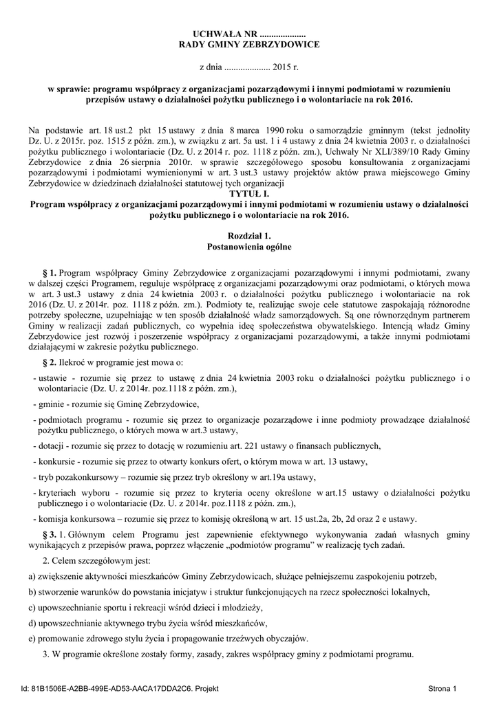 UCHWAŁA NR .................... RADY GMINY ZEBRZYDOWICE z dnia .................... 2015 r. w sprawie: programu współpracy z organizacjami pozarządowymi i innymi podmiotami w rozumieniu przepisów ustawy o działalności pożytku publicznego i o wolontariacie na rok 2016. Na podstawie art. 18 ust.2 pkt 15 ustawy z dnia 8 marca 1990 roku o samorządzie gminnym (tekst jednolity Dz. U. z 2015r. poz. 1515 z późn. zm.), w związku z art. 5a ust. 1 i 4 ustawy z dnia 24 kwietnia 2003 r. o działalności pożytku publicznego i wolontariacie (Dz. U. z 2014 r. poz. 1118 z późn. zm.), Uchwały Nr XLI/389/10 Rady Gminy Zebrzydowice z dnia 26 sierpnia 2010r. w sprawie szczegółowego sposobu konsultowania z organizacjami pozarządowymi i podmiotami wymienionymi w art. 3 ust.3 ustawy projektów aktów prawa miejscowego Gminy Zebrzydowice w dziedzinach działalności statutowej tych organizacji TYTUŁ I. Program współpracy z organizacjami pozarządowymi i innymi podmiotami w rozumieniu ustawy o działalności pożytku publicznego i o wolontariacie na rok 2016. Rozdział 1. Postanowienia ogólne § 1. Program współpracy Gminy Zebrzydowice z organizacjami pozarządowymi i innymi podmiotami, zwany w dalszej części Programem, reguluje współpracę z organizacjami pozarządowymi oraz podmiotami, o których mowa w art. 3 ust.3 ustawy z dnia 24 kwietnia 2003 r. o działalności pożytku publicznego i wolontariacie na rok 2016 (Dz. U. z 2014r. poz. 1118 z późn. zm.). Podmioty te, realizując swoje cele statutowe zaspokajają różnorodne potrzeby społeczne, uzupełniając w ten sposób działalność władz samorządowych. Są one równorzędnym partnerem Gminy w realizacji zadań publicznych, co wypełnia ideę społeczeństwa obywatelskiego. Intencją władz Gminy Zebrzydowice jest rozwój i poszerzenie współpracy z organizacjami pozarządowymi, a także innymi podmiotami działającymi w zakresie pożytku publicznego. § 2. Ilekroć w programie jest mowa o: - ustawie - rozumie się przez to ustawę z dnia 24 kwietnia 2003 roku o działalności pożytku publicznego i o wolontariacie (Dz. U. z 2014r. poz.1118 z późn. zm.), - gminie - rozumie się Gminę Zebrzydowice, - podmiotach programu - rozumie się przez to organizacje pozarządowe i inne podmioty prowadzące działalność pożytku publicznego, o których mowa w art.3 ustawy, - dotacji - rozumie się przez to dotację w rozumieniu art. 221 ustawy o finansach publicznych, - konkursie - rozumie się przez to otwarty konkurs ofert, o którym mowa w art. 13 ustawy, - tryb pozakonkursowy – rozumie się przez tryb określony w art.19a ustawy, - kryteriach wyboru - rozumie się przez to kryteria oceny określone w art.15 ustawy o działalności pożytku publicznego i o wolontariacie (Dz. U. z 2014r. poz.1118 z późn. zm.), - komisja konkursowa – rozumie się przez to komisję określoną w art. 15 ust.2a, 2b, 2d oraz 2 e ustawy. § 3. 1. Głównym celem Programu jest zapewnienie efektywnego wykonywania zadań własnych gminy wynikających z przepisów prawa, poprzez włączenie „podmiotów programu” w realizację tych zadań. 2. Celem szczegółowym jest: a) zwiększenie aktywności mieszkańców Gminy Zebrzydowicach, służące pełniejszemu zaspokojeniu potrzeb, b) stworzenie warunków do powstania inicjatyw i struktur funkcjonujących na rzecz społeczności lokalnych, c) upowszechnianie sportu i rekreacji wśród dzieci i młodzieży, d) upowszechnianie aktywnego trybu życia wśród mieszkańców, e) promowanie zdrowego stylu życia i propagowanie trzeźwych obyczajów. 3. W programie określone zostały formy, zasady, zakres współpracy gminy z podmiotami programu. Id: 81B1506E-A2BB-499E-AD53-AACA17DDA2C6. Projekt Strona 1 Rozdział 2. Zakres przedmiotowy § 4. Zakres przedmiotowy Gminy Zebrzydowice z podmiotami programu będzie obejmować w szczególności zadania publiczne z następujących sfer: a) ochrony i promocji zdrowia; b) wspierania i upowszechniania kultury fizycznej i sportu; c) wypoczynku dzieci i młodzieży; d) edukacji, oświaty i wychowania; e) wspomagania rozwoju wspólnot i społeczności lokalnych; f) działalności na rzecz osób w wieku emerytalnym. Rozdział 3. Priorytetowe zadania publiczne § 5. Priorytetowymi grupami zadań przewidzianymi do realizacji w 2016 roku są: 1. Zadania z zakresu kultury fizycznej, sportu oraz wypoczynku dzieci i młodzieży obejmujące: a) szkolenie sportowe, w tym wsparcie dyscyplin olimpijskich, b) realizacja projektów związanych z zapobieganiem i zwalczaniem narkomanii i alkoholizmu, c) poszerzenie oferty aktywnego wypoczynku dzieci i młodzieży – realizacja programów sportowych o charakterze edukacyjno – wychowawczym, przeciwdziałanie wykluczeniu społecznemu, d) promocja sportu i wykorzystywanie funkcji integracyjno -społecznych kultury fizycznej, sport jako czynnik tworzący poczucie przynależności do wspólnoty lokalnej, e) wspieranie organizacji pozarządowych, działających w sferze kultury fizycznej. 2. Zadania z zakresu ochrony i promocji zdrowia: a) podnoszenie świadomości zdrowotnej mieszkańców gminy, b) działania wspierające i promujące zdrowy styl życia, adresowane w szczególności do dzieci i młodzieży, osób starszych i przewlekle chorych. 3. Zadania z zakresu edukacji, oświaty i wychowania: a) udzielanie szeroko rozumianej pomocy w zakresie dostępu do nauki i edukacji osób niepełnosprawnych. 4. Zadania z zakresu działalności na rzecz osób w wieku emerytalnym: a) działania wspierające i promujące aktywność osób w wieku emerytalnym w miejscu zamieszkania, b) działania wspomagające integrację osób w wieku emerytalnym w miejscu zamieszkania. Rozdział 4. Zasady współpracy § 6. 1. Współpraca samorządu gminnego z organizacjami pozarządowymi jest realizowana na zasadach określonych w art.5 ust.5 pkt 3 ustawy (obejmujących pomocniczość, suwerenność stron, efektywność, uczciwą konkurencję, jawność i pa