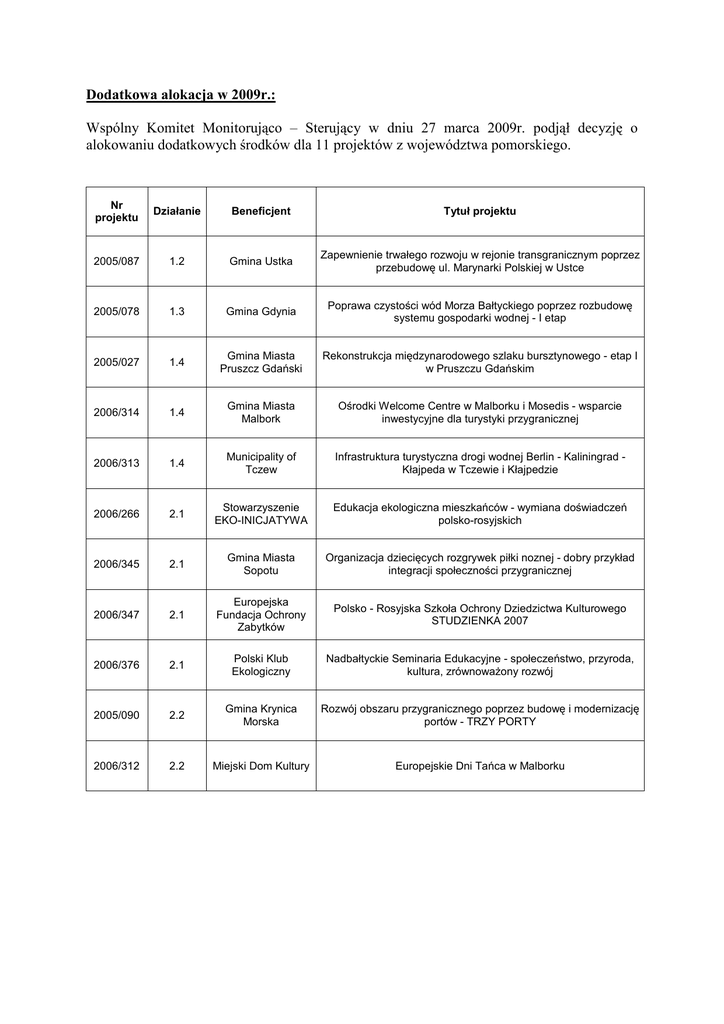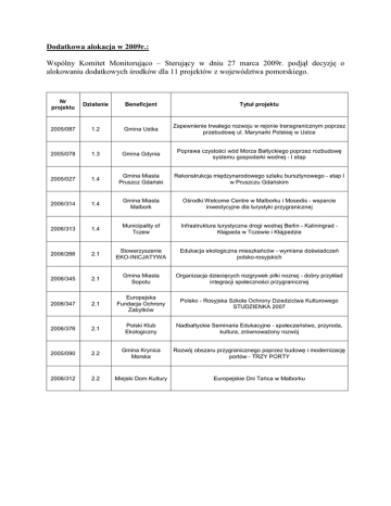 Dodatkowa alokacja w 2009r.: Wspólny Komitet Monitorująco – Sterujący w dniu 27 marca 2009r. podjął decyzję o alokowaniu dodatkowych środków dla 11 projektów z województwa pomorskiego. Nr projektu Działanie Beneficjent Tytuł projektu 2005/087 1.2 Gmina Ustka Zapewnienie trwałego rozwoju w rejonie transgranicznym poprzez przebudowę ul. Marynarki Polskiej w Ustce 2005/078 1.3 Gmina Gdynia Poprawa czystości wód Morza Bałtyckiego poprzez rozbudowę systemu gospodarki wodnej - I etap 2005/027 1.4 Gmina Miasta Pruszcz Gdański Rekonstrukcja międzynarodowego szlaku bursztynowego - etap I w Pruszczu Gdańskim 2006/314 1.4 Gmina Miasta Malbork Ośrodki Welcome Centre w Malborku i Mosedis - wsparcie inwestycyjne dla turystyki przygranicznej 2006/313 1.4 Municipality of Tczew Infrastruktura turystyczna drogi wodnej Berlin - Kaliningrad Kłajpeda w Tczewie i Kłajpedzie 2006/266 2.1 Stowarzyszenie EKO-INICJATYWA Edukacja ekologiczna mieszkańców - wymiana doświadczeń polsko-rosyjskich 2006/345 2.1 Gmina Miasta Sopotu Organizacja dziecięcych rozgrywek piłki noznej - dobry przykład integracji społeczności przygranicznej 2006/347 2.1 Europejska Fundacja Ochrony Zabytków Polsko - Rosyjska Szkoła Ochrony Dziedzictwa Kulturowego STUDZIENKA 2007 2006/376 2.1 Polski Klub Ekologiczny Nadbałtyckie Seminaria Edukacyjne - społeczeństwo, przyroda, kultura, zrównowaŜony rozwój 2005/090 2.2 Gmina Krynica Morska Rozwój obszaru przygranicznego poprzez budowę i modernizację portów - TRZY PORTY 2006/312 2.2 Miejski Dom Kultury Europejskie Dni Tańca w Malborku