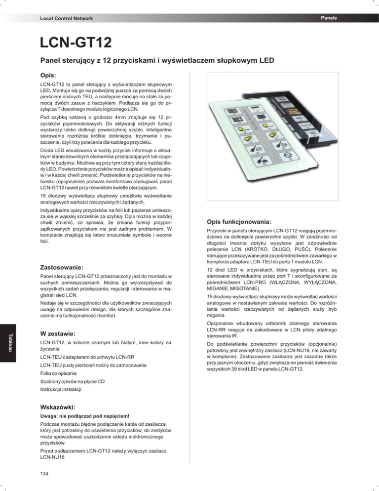 Panele Local Control Network LCN-GT12 Panel steruj¹cy z 12 przyciskami i wyœwietlaczem s³upkowym LED Opis: LCN-GT12 to panel steruj¹cy z wyœwietlaczem s³upkowym LED. Montuje siê go na podwójnej puszce za pomoc¹ dwóch pierœcieni noœnych TEU, a nastêpnie mocuje na sta³e za pomoc¹ dwóch zasuw z haczykiem. Pod³¹cza siê go do przy³¹cza T dowolnego modu³u logicznego LCN. Pod szybk¹ szklan¹ o gruboœci 4mm znajduje siê 12 przycisków pojemnoœciowych. Do aktywacji ró¿nych funkcji wystarczy lekko dotkn¹æ powierzchniê szybki. Inteligentne sterowanie rozró¿nia krótkie dotkniêcie, trzymanie i puszczenie, czyli trzy polecenia dla ka¿dego przycisku. Dioda LED wbudowana w ka¿dy przycisk informuje o aktualnym stanie dowolnych elementów prze³¹czaj¹cych lub czujników w budynku. Mo¿liwe s¹ przy tym cztery stany ka¿dej diody LED. Powierzchnie przycisków mo¿na opisaæ indywidualnie i w ka¿dej chwili zmieniæ. Podœwietlenie przycisków na niebiesko (opcjonalnie) pozwala komfortowo obs³ugiwaæ panel LCN-GT12 nawet przy niewielkim œwietle otaczaj¹cym. 15 diodowy wyœwietlacz s³upkowy umo¿liwia wyœwietlanie analogowych wartoœci rzeczywistych i ¿¹danych. Indywidualne opisy przycisków na folii lub papierze umieszcza siê w w¹skiej szczelinie za szybk¹. Opis mo¿na w ka¿dej chwili zmieniæ, co sprawia, ¿e zmiana funkcji przyporz¹dkowanych przyciskom nie jest ¿adnym problemem. W komplecie znajduj¹ siê ³atwo zrozumia³e symbole i wzorce folii. Zastosowanie: Panel steruj¹cy LCN-GT12 przeznaczony jest do monta¿u w suchych pomieszczeniach. Mo¿na go wykorzystywaæ do wszystkich zadañ prze³¹czania, regulacji i sterowania w magistrali sieci LCN. Opis funkcjonowania: Przyciski w panelu steruj¹cym LCN-GT12 reaguj¹ pojemnoœciowo na dotkniêcie powierzchni szybki. W zale¿noœci od d³ugoœci trwania dotyku wysy³ane jest odpowiednie polecenie LCN (KRÓTKO, D£UGO, PUŒÆ). Polecenie steruj¹ce przekazywane jest za poœrednictwem zawartego w komplecie adaptera LCN-TEU do portu T modu³u LCN. 12 diod LED w przyciskach, które sygnalizuj¹ stan, s¹ sterowane indywidualnie przez port T i skonfigurowane za poœrednictwem LCN-PRO (W£¥CZONA, WY£¥CZONA, MIGANIE, MIGOTANIE). Tableau Nadaje siê w szczególnoœci dla u¿ytkowników zwracaj¹cych uwagê na odpowiedni design, dla których szczególne znaczenie ma funkcjonalnoœæ i komfort. 15 diodowy wyœwietlacz s³upkowy mo¿e wyœwietlaæ wartoœci analogowe w nastawianym zakresie wartoœci. Do rozró¿niania wartoœci rzeczywistych od ¿¹danych s³u¿y tryb migania. W zestawie: Opcjonalnie wbudowany odbiornik zdalnego sterowania LCN-RR reaguje na zakodowane w LCN piloty zdalnego sterowania IR. LCN-GT12, w kolorze czarnym lub bia³ym, inne kolory na ¿yczenie LCN-TEU z adapterem do uchwytu LCN-RR LCN-TEU pusty pierœcieñ noœny do zamocowania Folia do opisania Szablony opisów na p³ycie CD Instrukcja instalacji Wskazówki: Uwaga: nie pod³¹czaæ pod napiêciem! Podczas monta¿u b³êdne pod³¹czenie kabla od zasilacza, który jest potrzebny do oœwietlenia przycisków, do zestyków mo¿e spowodowaæ uszkodzenie uk³adu elektronicznego przycisków. Przed pod³¹czeniem LCN-GT12 nale¿y wy³¹czyæ zasilacz LCN-NU16 134 Do podœwietlenia powierzchni przycisków (opcjonalnie) potrzebny jest zewnêtrzny zasilacz (LCN-NU16, nie zawarty w komplecie). Zastosowanie zasilacza jest zasadne tak¿e przy jasnym otoczeniu, gdy¿ zwiêksza on jasnoœæ œwiecenia wszystkich 39 diod LED w panelu LCN-GT12. Panele Local Control Network LCN-GT12 Panel steruj¹cy z 12 przyciskami i wyœwietlaczem s³upkowym LED Dane techniczne Wymiary: Wymiary z ramk¹: Przyciski: Typ: 12 pojemnoœciowych powierzchni ze status. LED Funkcje: Lampki: Krótko / D£UGO / PUŒÆ Typ: 12 LED do wyœwietlania meldunków statusowych LCN Funkcje: W³ / WY£ / MIGAJ / MIGOTAJ 90 mm x 160 mm x 10 mm (Sz x D x W) 10mm 90mm poprzez modu³ LCN; podœwietlenie t³a (opcjonalnie) poprzez zewn. zasilacz LCN-NU16 160mm Zasilanie: 160mm Wyœw. wartoœci analogow.: 15 LED jako bargraph, wyœwietlacz wartoœci rzeczywistej/¿¹danej Dane ogólne: Temperatura pracy: -10°C do +40°C Warunki otoczenia: max. 80% wzgl. wilgotnoœci nie ulega obroszeniu Instalacja: do stosowania w sta³ej instalacji zgodnie z VDE 632, VDE 637 Stopieñ ochrony: Monta¿: Za pomoc¹ 2 LCN-TEU na puszce podtynkowej IP 20 Schemat po³¹czeñ L N D PE L N D PE Panele LCN-GT12 LCN-UPx LCN-NU16 T LCN-TEU optional opcjonalny zasilacz LCN-TEU + - 135