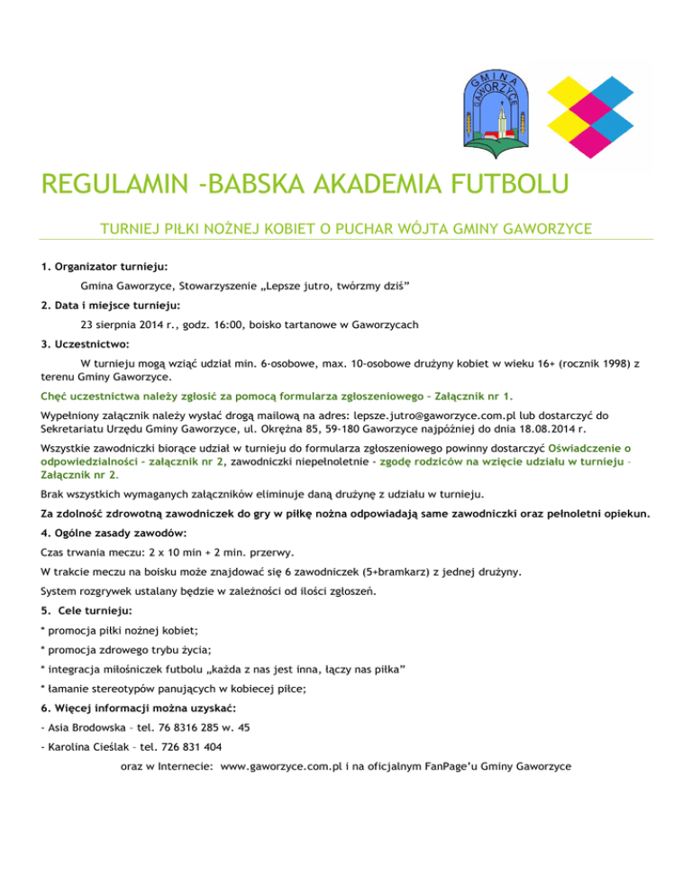 REGULAMIN -BABSKA AKADEMIA FUTBOLU TURNIEJ PIŁKI NOŻNEJ KOBIET O PUCHAR WÓJTA GMINY GAWORZYCE 1. Organizator turnieju: Gmina Gaworzyce, Stowarzyszenie „Lepsze jutro, twórzmy dziś” 2. Data i miejsce turnieju: 23 sierpnia 2014 r., godz. 16:00, boisko tartanowe w Gaworzycach 3. Uczestnictwo: W turnieju mogą wziąć udział min. 6-osobowe, max. 10-osobowe drużyny kobiet w wieku 16+ (rocznik 1998) z terenu Gminy Gaworzyce. Chęć uczestnictwa należy zgłosić za pomocą formularza zgłoszeniowego – Załącznik nr 1. Wypełniony załącznik należy wysłać drogą mailową na adres: [email protected] lub dostarczyć do Sekretariatu Urzędu Gminy Gaworzyce, ul. Okrężna 85, 59-180 Gaworzyce najpóźniej do dnia 18.08.2014 r. Wszystkie zawodniczki biorące udział w turnieju do formularza zgłoszeniowego powinny dostarczyć Oświadczenie o odpowiedzialności – załącznik nr 2, zawodniczki niepełnoletnie - zgodę rodziców na wzięcie udziału w turnieju – Załącznik nr 2. Brak wszystkich wymaganych załączników eliminuje daną drużynę z udziału w turnieju. Za zdolność zdrowotną zawodniczek do gry w piłkę nożna odpowiadają same zawodniczki oraz pełnoletni opiekun. 4. Ogólne zasady zawodów: Czas trwania meczu: 2 x 10 min + 2 min. przerwy. W trakcie meczu na boisku może znajdować się 6 zawodniczek (5+bramkarz) z jednej drużyny. System rozgrywek ustalany będzie w zależności od ilości zgłoszeń. 5. Cele turnieju: * promocja piłki nożnej kobiet; * promocja zdrowego trybu życia; * integracja miłośniczek futbolu „każda z nas jest inna, łączy nas piłka” * łamanie stereotypów panujących w kobiecej piłce; 6. Więcej informacji można uzyskać: - Asia Brodowska – tel. 76 8316 285 w. 45 - Karolina Cieślak – tel. 726 831 404 oraz w Internecie: www.gaworzyce.com.pl i na oficjalnym FanPage’u Gminy Gaworzyce