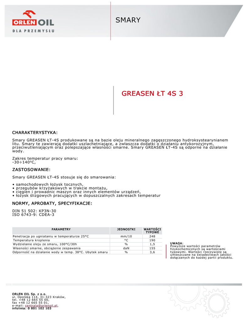 SMARY GREASEN ŁT 4S 3 CHARAKTERYSTYKA: Smary GREASEN ŁT4S produkowane są na bazie oleju mineralnego zagęszczonego hydroksystearynianem litu. Smary te zawierają dodatki uszlachetniające, a zwłaszcza dodatki o działaniu antykorozyjnym, przeciwutleniającym oraz polepszające własności smarne. Smary GREASEN ŁT4S są odporne na działanie wody. Zakres temperatur pracy smaru: 30÷140 o C, ZASTOSOWANIE: Smary GREASEN ŁT4S stosuje się do smarowania: • samochodowych łożysk tocznych, • przegubów krzyżakowych w trakcie montażu, • cięgien i prowadnic maszyn oraz innych elementów urządzeń, • łożysk ślizgowych pracujących w dopuszczalnych zakresach temperatur NORMY, APROBATY, SPECYFIKACJE: DIN 51 502: KP3N30 ISO 67439: CDEA3 PARAMETRY Penetracja po ugniataniu w temperaturze 25°C Temperatura kroplenia Wydzielanie oleju ze smaru, 100°C/30h Własności smarne, obciążenie zespawania Odporność na działanie wody w temp. 38°C. Ubytek smaru ORLEN OIL Sp. z o.o. ul. Opolska 114, 31323 Kraków, tel. +48 12 665 55 00, fax +48 12 665 55 01, email: [email protected], infolinia: 0 801 102 103 JEDNOSTKI mm/10 °C % daN % WARTOŚCI TYPOWE 248 190 1,5 155 3,6 UWAGA: Powyższe wartości parametrów fizykochemicznych są wartościami typowymi. Wartości rzeczywiste są umieszczane na świadectwach jakości dołączanych do każdej partii produktu.