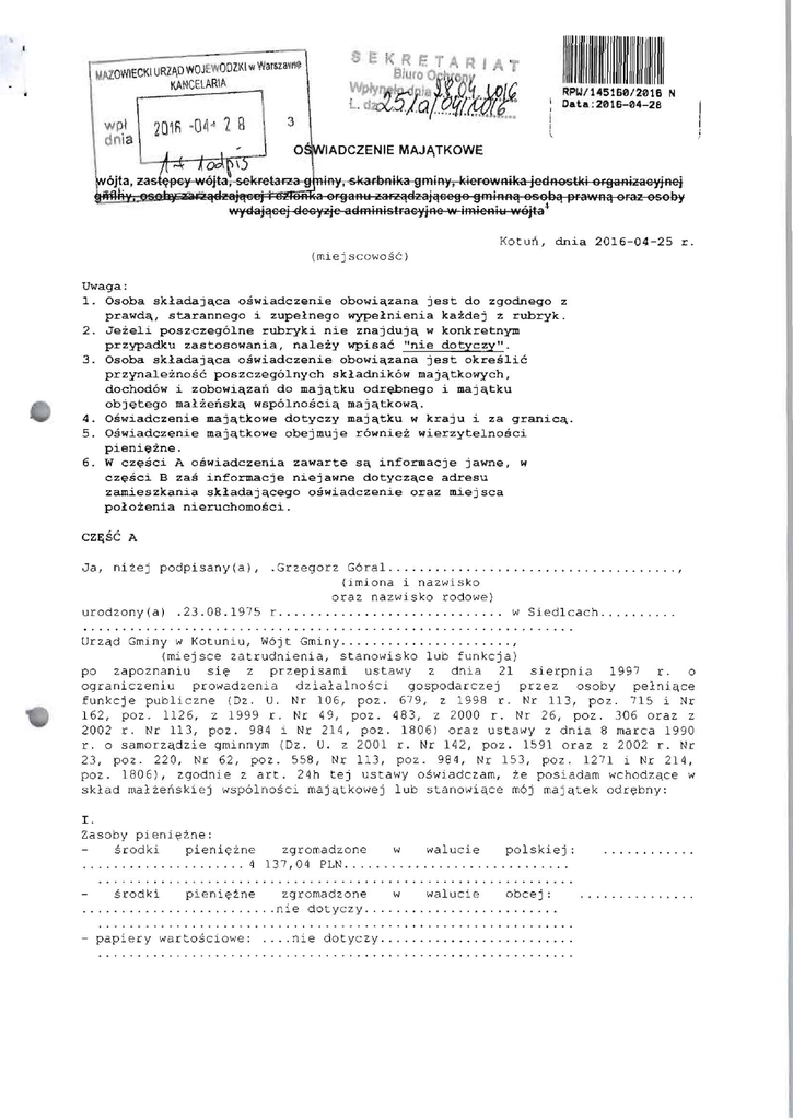 t.lA!OWIECKI uRZAOWOJEWOOZK1 wWars,",,\? KANCElARIA I wpl dnia 201R -04" 'Z 9 i l 3 o RPU/145160/201B N Data :2016-04-28 IADCZENIE MAJATKOWE ojta, 'lIyaaj~6ej aeGy~e aamiAislFasyjAe w imieRiw w9jta' Kot u n , dnia 2016-04-25 r . (miejscowosc) Uwaga: 1. Osoba oswiadczenie obowi~zana jest do zgodnego z starannego i zupelnego wypelnienia kazdej z rubryk. Jezeli poszczegolne rubryki nie znajduj~ w konkretnym przypadku zastoBowania, nalezy wpisac "nie dotyczy". Osoha skladaj~ca oswiadczenie obowi~zana jest okreslic przynaleznosc poszczeg61nych skladnik6 w maj~tkowych, dochod6 w i zobowi~zan do majqtku odr~nego i maj~tku objetego malzensk~ wsp61nosci~ majqtkowq. Oswiadczenie majqtkowe dotyczy majqtku w kraju i za granicq. Oswiadczenie majqtkowe obejmuje r6wniez wierzytelnosci pieniezne. W cz~sci A oswiadczenia zawarte s~ informacje jawne, w cz~sci B zas informacje niejawne dotycz&ce adresu zamieszkania skladaj~cego oswiadczenie oraz miejsca polozenia nieruchomosci. skladaj~ca prawd~, 2. 3. 4. 5. 6. CZE;SC: A Ja, nizej podpisany(a) , urodlony(a) .Grlego rl G6ral .... ....... ... . (im iona i n azw isko oraz nazwisko rodowe) .................. . . .. , . 23 . 08. 1 975 r. ...... ... ........ ..... ...... w S i edlcach ... ...... . Urza. d Gmin y w Kotu niu, W6 jt Gminy .. ., . . . . . . . . . . . . . . . . . . , ( miejsce zatr udn ie n ia, sta now is ko lub fu nk cja) po za poz na niu si~ z przepisami ust awy z d nia 2 1 sierpnia 1 997 r. 0 ogran iczeni u prowadzenia dz ialalno sci gospodarczej prze z osoby pe1niace funkcje publi c zne (D I. U. Nr 10 6, pOI. 679 , 11998 r. Nr 113 , poz. 715 i Nr 162 , pOI. 1126, • 199 9 r . Nr 49, pOI . 48 3, Z 2 000 r. Nr 2 6, pOI. 306 oral Z 200 2 r. Nr 113, pOI. 984 i Nr 21 4 , pOI. 180 6 ) ora. ustawy Z d nia 8 mar ca 19 90 r. 0 samorz adzi e gminnym ( Dz . U. z 200 1 r. Nr 142, poz. 1591 oraz z 2002 r. Nr 23, pOI. 220 , Nr 62 , pOI. 558, Nr 113, pOI. 984, Nr 153, poz. 12 7 1 i Nr 214 , p az. 1806), zgodnie z art. 24h tej ustawy os wiad czam, z e posi adam wchodzqce w sk l ad malzenski e j wsp61n osci majqtkowej lu b stanow i qce m6j majqtek odr~bny: I. Zaso by pi e ni~zne: srodk i pieni ~zne zgromad zone w walucie po ! s kiej: . . . . . . . . . . . . . . . . . . . . . 4 1 37,04 PLN ....... .. . . . . . . . . . . . . . . . . . . . . sro dki p ie n i~ zne zgro madzone w wa 1 uci e obcej: . . . . . . . . . . . .. .......... .. nie d otycz y . . . . . . . . . . . ..... . . . . . . . . . - papi e ry wa rtosciow e: . .. . nie dotyc zy ... , . . . . . . . . . . . . . . . .. na kwot~; II. 1. Dom 0 powierzchni: 180 m", 0 wartosci: 400 000 PLN . . . . . . . tytul prawny: wlasnos6, akt notarialny 1567/2000 . . . . . . . . . . . . . . 2. Hieszkanie 0 pOl"ierzchr:.i: nie dotyczy . . . . . . , f!'IL, 0 wartosci: nie dotyczy tytul prawny: " .. nie dotyczy . . . . . . . . . . . . . . . . . . . . . . . . . . . . . . . 3. Gospodarstwo rolne: rodzaj gospodarstwa: nie dotyczy, powierzchnia: nie dotyczy .. . o warto~ci: nie dotyczy . . . . . . . . . . . . . . . . . . . . . . . . . . . . . . . . . . . . . . . . . . . . . . . rodzaj zabudowy: nie dotyczy . . . . . . . . . . . . . . . . . . . . . . . . . . . . . . . . . . . . _.... . tytul prawny: nie dotyczy ..... " _., . . . . . . . . . . . . . . . . . . . . . . . . . " . . . . . . . . . Z tego tytulu osia,gna,lem($lam) w roku ubieglym przych6d i doch6d w wysokosci: . . . . . . . . . . . . . . . . . . . . . . . . . . . . , . . . . . . . . . . 4. Inne nieruchornosci; dzialka budow1ana na kt.6rej zloka1izowany jest dom mieszkalr.y wymieniony w pkt. 11.1 powierzchnia; 1340 rn 2 • • • • • • • • • • • • • • • • • • • , • • • • • • , • • • • • • • • , • • • • • • • • • o wartosci: 21 000 PLN (cena zakupu) ....... , .... , ......... ,., ........ . tytul prawny: wlasnosc, akt notarialny 1567!2000 .......... ,., ......... . III. Posiadarn udzialy w sp61kach handlowych - nale~y poda6 liczbe i emitenta udzia16w; ....... nie dotyczy ....................................................... . udzialy te stanowia pakiet wiekszy nit 10% udzia16w w sp61ce: ........ nie dotyczy ..... , ........................................... , .... . Z tego tytulu osia.gna.lern(elarn) w roku ubieglym doc hod w wysokosci: nie dotyczy ....................................... , ........... . IV. Posiadam akcje w sp61kach handlowych - nale±y poda6 liczbe i emitenta akcji: ., ....... nie dotyczy ..... , ............................. . akcje te stanowia pakiet wiekszy ni~ 10% akcji w sp61ce: ......... nie dotyczy ........................................... , ......... . Z tego tytu!u oSia.gna.lem(elam) w roku ubieglym doch6d w wysokosci: nie do:yczy ................................................... . V. Nabylerr.(am) (nabyl m6j rr.alzonek, z wy?".a.czeniem mienia przynalez,nego do jego maja.tku odrebnego) od Skarbu Panstwa , innej panstwowej osoby prawnej, jednostek samorza.du terytorialnego, ich zwiazk6w lub od komuna1nej osoby prawnej nastepujace mienie, kt6re podlega!o zbyciu w drodze przetargu nale~y podac opis mienia i date nabycia, cd kogo: ............ . nie dotyczy .............................................................. . VI. 1, Prowadze dzialalnosc gospodarcza.~ (na1eiy podac forme prawna i przedmiot dzialalnosci); nie do'cyczy - osobiscie .......................................... . - wsp61nie z innymi osobami ............ " ........ , ..... ". Z te go tyt u l u osiqgnqlem le lam ) w roku ubleglym p rzych6d i d oc h6d w wysokosci: ............. .. ...... . . . . . . . . . . . . . . . . . . . . . . ..... . 2. Zarza.dzam dzi al alnoscia. gos podarc zq lub jestem przedstawicielem pel nomocni ki e m ta kiej dz ialal n os c i (na lezy podac forme prawna. i przedmiot dz i alalnos ci): ............ . .. .. . . . ... . . .. nie doty c zy .. ........ ... . . . . . . . . . . . . . . . . . ........ ...... . - osobiseie .......... . . ... .......... .... , . , ....... . ....