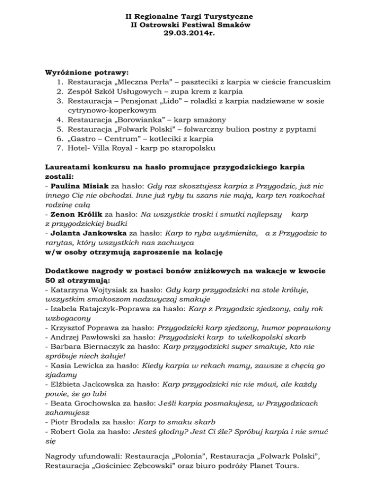 II Regionalne Targi Turystyczne II Ostrowski Festiwal Smaków 29.03.2014r. Wyróżnione potrawy: 1. Restauracja „Mleczna Perła” – paszteciki z karpia w cieście francuskim 2. Zespół Szkół Usługowych – zupa krem z karpia 3. Restauracja – Pensjonat „Lido” – roladki z karpia nadziewane w sosie cytrynowo-koperkowym 4. Restauracja „Borowianka” – karp smażony 5. Restauracja „Folwark Polski” – folwarczny bulion postny z pyptami 6. „Gastro – Centrum” – kotleciki z karpia 7. Hotel- Villa Royal - karp po staropolsku Laureatami konkursu na hasło promujące przygodzickiego karpia zostali: - Paulina Misiak za hasło: Gdy raz skosztujesz karpia z Przygodzic, już nic innego Cię nie obchodzi. Inne już ryby tu szans nie mają, karp ten rozkochał rodzinę całą - Zenon Królik za hasło: Na wszystkie troski i smutki najlepszy karp z przygodzickiej budki - Jolanta Jankowska za hasło: Karp to ryba wyśmienita, a z Przygodzic to rarytas, który wszystkich nas zachwyca w/w osoby otrzymują zaproszenie na kolację Dodatkowe nagrody w postaci bonów zniżkowych na wakacje w kwocie 50 zł otrzymują: - Katarzyna Wojtysiak za hasło: Gdy karp przygodzicki na stole króluje, wszystkim smakoszom nadzwyczaj smakuje - Izabela Ratajczyk-Poprawa za hasło: Karp z Przygodzic zjedzony, cały rok wzbogacony - Krzysztof Poprawa za hasło: Przygodzicki karp zjedzony, humor poprawiony - Andrzej Pawłowski za hasło: Przygodzicki karp to wielkopolski skarb - Barbara Biernaczyk za hasło: Karp przygodzicki super smakuje, kto nie spróbuje niech żałuje! - Kasia Lewicka za hasło: Kiedy karpia w rekach mamy, zawsze z chęcią go zjadamy - Elżbieta Jackowska za hasło: Karp przygodzicki nic nie mówi, ale każdy powie, że go lubi - Beata Grochowska za hasło: Jeśli karpia posmakujesz, w Przygodzicach zahamujesz - Piotr Brodala za hasło: Karp to smaku skarb - Robert Gola za hasło: Jesteś głodny? Jest Ci źle? Spróbuj karpia i nie smuć się Nagrody ufundowali: Restauracja „Polonia”, Restauracja „Folwark Polski”, Restauracja „Gościniec Zębcowski” oraz biuro podróży Planet Tours. Po odbiór nagród zapraszamy do sekretariatu Zespołu Szkół Usługowych w Ostrowie Wielkopolskim ul. Wolności 12 w dniach od 1 do 4 kwietnia 2014 r. w godz. 8.00-15.00.