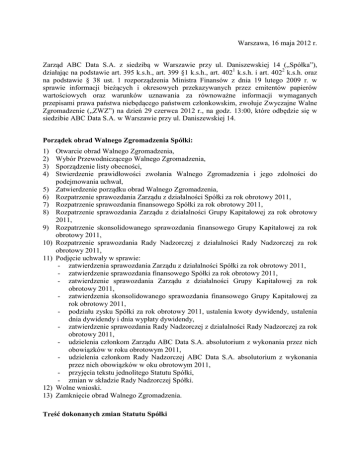 Warszawa, 16 maja 2012 r. Zarząd ABC Data S.A. z siedzibą w Warszawie przy ul. Daniszewskiej 14 („Spółka”), działając na podstawie art. 395 k.s.h., art. 399 §1 k.s.h., art. 4021 k.s.h. i art. 4022 k.s.h. oraz na podstawie § 38 ust. 1 rozporządzenia Ministra Finansów z dnia 19 lutego 2009 r. w sprawie informacji bieżących i okresowych przekazywanych przez emitentów papierów wartościowych oraz warunków uznawania za równoważne informacji wymaganych przepisami prawa państwa niebędącego państwem członkowskim, zwołuje Zwyczajne Walne Zgromadzenie („ZWZ”) na dzień 29 czerwca 2012 r., na godz. 13:00, które odbędzie się w siedzibie ABC Data S.A. w Warszawie przy ul. Daniszewskiej 14. Porządek obrad Walnego Zgromadzenia Spółki: 1) 2) 3) 4) 5) 6) 7) 8) 9) 10) 11) 12) 13) Otwarcie obrad Walnego Zgromadzenia, Wybór Przewodniczącego Walnego Zgromadzenia, Sporządzenie listy obecności, Stwierdzenie prawidłowości zwołania Walnego Zgromadzenia i jego zdolności do podejmowania uchwał, Zatwierdzenie porządku obrad Walnego Zgromadzenia, Rozpatrzenie sprawozdania Zarządu z działalności Spółki za rok obrotowy 2011, Rozpatrzenie sprawozdania finansowego Spółki za rok obrotowy 2011, Rozpatrzenie sprawozdania Zarządu z działalności Grupy Kapitałowej za rok obrotowy 2011, Rozpatrzenie skonsolidowanego sprawozdania finansowego Grupy Kapitałowej za rok obrotowy 2011, Rozpatrzenie sprawozdania Rady Nadzorczej z działalności Rady Nadzorczej za rok obrotowy 2011, Podjęcie uchwały w sprawie: - zatwierdzenia sprawozdania Zarządu z działalności Spółki za rok obrotowy 2011, - zatwierdzenie sprawozdania finansowego Spółki za rok obrotowy 2011, - zatwierdzenie sprawozdania Zarządu z działalności Grupy Kapitałowej za rok obrotowy 2011, - zatwierdzenia skonsolidowanego sprawozdania finansowego Grupy Kapitałowej za rok obrotowy 2011, - podziału zysku Spółki za rok obrotowy 2011, ustalenia kwoty dywidendy, ustalenia dnia dywidendy i dnia wypłaty dywidendy, - zatwierdzenie sprawozdania Rady Nadzorczej z działalności Rady Nadzorczej za rok obrotowy 2011, - udzielenia członkom Zarządu ABC Data S.A. absolutorium z wykonania przez nich obowiązków w roku obrotowym 2011, - udzielenia członkom Rady Nadzorczej ABC Data S.A. absolutorium z wykonania przez nich obowiązków w oku obrotowym 2011, - przyjęcia tekstu jednolitego Statutu Spółki, - zmian w składzie Rady Nadzorczej Spółki. Wolne wnioski. Zamknięcie obrad Walnego Zgromadzenia. Treść dokonanych zmian Statutu Spółki Z uwagi na dokonane zmiany wysokości kapitału zakładowego (§ 7 ust. 1 Statutu Spółki) wprowadzone w drodze dookreślenia wysokości kapitału zakładowego w Statucie Spółki przez Zarząd ABC Data S.A. w dniu 6 grudnia 2011 r. i w dniu 31 stycznia 2012 r., Zarząd niniejszym przedstawia dotychczas obowiązujące postanowienia § 7 ust. 1 Statutu, jak również treść dokonanych zmian § 7 ust. 1 Statutu: 1) dotychczasowy § 7 ust. 1 Statutu w treści: „Kapitał zakładowy Spółki wynosi 121.757.404,00 (sto dwadzieścia jeden milionów siedemset pięćdziesiąt siedem tysięcy czterysta cztery) złote i dzieli się na 121.757.404 (sto dwadzieścia jeden milionów siedemset pięćdziesiąt siedem tysięcy czterysta cztery) równe i niepodzielne akcje o wartości nominalnej po 1,- (jeden) złoty każda. Kwota wpłacona przed zarejestrowaniem na pokrycie kapitału zakładowego wynosi 125.000 (sto dwadzieścia pięć tysięcy) złotych. Akcje Spółki dzielą się na następujące serie: a) 500.000 (pięćset tysięcy) akcji zwykłych na okaziciela serii A, o kolejnych numerach od 000 001 (jeden) do 500 000 (pięćset tysięcy); b) 54.972.000 (pięćdziesiąt cztery miliony dziewięćset siedemdziesiąt dwa tysiące) akcji zwykłych na okaziciela serii B, o kolejnych numerach od B 00 000 001 do B 54 972 000; c) 44.000.000 (czterdzieści cztery miliony) akcji zwykłych na okaziciela serii C, o kolejnych numerach od C 00 000 001 do C 44 000 000; d) 22.000.000 (dwadzieścia dwa miliony) akcji zwykłych na okaziciela serii H, o kolejnych numerach od H 00 000 001 do H 22 000 000; e) 285.404 (dwieście osiemdziesiąt pięć tysięcy czterysta cztery) akcji zwykłych na okaziciela serii E, o kolejnych numerach od E 000 001 do E 285 404.” na skutek dokonanych zmian § 7 ust. 1 Statutu otrzymał nową następującą treść: „1. Kapitał zakładowy Spółki wynosi 124.728.308,00 (sto dwadzieścia cztery miliony siedemset dwadzieścia osiem tysięcy trzysta osiem) złoty i dzieli się na 124.728.308 (sto dwadzieścia cztery miliony siedemset dwadzieścia osiem tysięcy trzysta osiem) równe i niepodzielne akcje o wartości nominalnej po 1,- (jeden) złoty każda. Kwota wpłacona przed zarejestrowaniem na pokrycie kapitału zakładowego wynosi 125.000 (sto dwadzieścia pięć tysięcy) złotych. Akcje Spółki dzielą się na następujące serie: a) 500.000 (pięćset tysięcy) akcji zwykłych na okaziciela serii A, o kolejnych numerach od 000 001 (jeden) do 500 000 (pięćset tysięcy); b) 54.972.000 (pięćdziesiąt cztery miliony dziewięćset siedemdziesiąt dwa tysiące) akcji zwykłych na okaziciela serii B, o kolejnych numerach od B 00 000 001 do B 54 972 000; c) 44.000.000 (czterdzieści cztery miliony) akcji zwykłych na okaziciela serii C, o kolejnych numerach od C 00 000 001 do C 44 000 000; d) 2.878.869,00 (dwa miliony osiemset siedemdziesiąt osiem tysięcy osiemset sześćdziesiąt dziewięć) akcji zwykłych na okaziciela serii D, o kolejnych numerach od D 0 000 001 do D 2 878 869; e) 285.404 (dwieście osiemdziesiąt pięć tysięcy czterysta cztery) akcji zwykłych na okaziciela serii E, o kolejnych numerach od E 000 001 do E 285 404; f) 92.035 (dziewięćdziesiąt dwa tysiące trzydzieści pięć) akcji zwykłych na okaziciela serii F, o kolejnych numerach od F 000 001 do F 092 035; g) 22.000.000 (dwadzieścia dwa miliony) akcji zwykłych na okaziciela ser