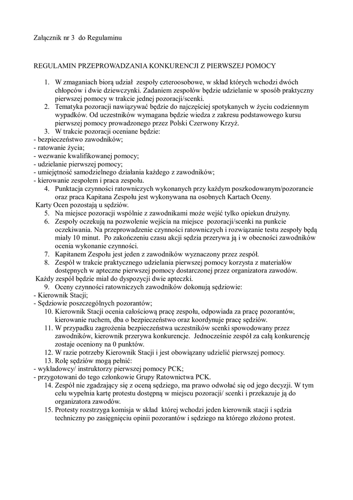 Załącznik nr 3 do Regulaminu REGULAMIN PRZEPROWADZANIA KONKURENCJI Z PIERWSZEJ POMOCY 1. W zmaganiach biorą udział zespoły czteroosobowe, w skład których wchodzi dwóch chłopców i dwie dziewczynki. Zadaniem zespołów będzie udzielanie w sposób praktyczny pierwszej pomocy w trakcie jednej pozoracji/scenki. 2. Tematyka pozoracji nawiązywać będzie do najczęściej spotykanych w życiu codziennym wypadków. Od uczestników wymagana będzie wiedza z zakresu podstawowego kursu pierwszej pomocy prowadzonego przez Polski Czerwony Krzyż. 3. W trakcie pozoracji oceniane będzie: - bezpieczeństwo zawodników; - ratowanie życia; - wezwanie kwalifikowanej pomocy; - udzielanie pierwszej pomocy; - umiejętność samodzielnego działania każdego z zawodników; - kierowanie zespołem i praca zespołu. 4. Punktacja czynności ratowniczych wykonanych przy każdym poszkodowanym/pozorancie oraz praca Kapitana Zespołu jest wykonywana na osobnych Kartach Oceny. Karty Ocen pozostają u sędziów. 5. Na miejsce pozoracji wspólnie z zawodnikami może wejść tylko opiekun drużyny. 6. Zespoły oczekują na pozwolenie wejścia na miejsce pozoracji/scenki na punkcie oczekiwania. Na przeprowadzenie czynności ratowniczych i rozwiązanie testu zespoły będą miały 10 minut. Po zakończeniu czasu akcji sędzia przerywa ją i w obecności zawodników ocenia wykonanie czynności. 7. Kapitanem Zespołu jest jeden z zawodników wyznaczony przez zespół. 8. Zespół w trakcie praktycznego udzielania pierwszej pomocy korzysta z materiałów dostępnych w apteczne pierwszej pomocy dostarczonej przez organizatora zawodów. Każdy zespół będzie miał do dyspozycji dwie apteczki. 9. Oceny czynności ratowniczych zawodników dokonują sędziowie: - Kierownik Stacji; - Sędziowie poszczególnych pozorantów; 10. Kierownik Stacji ocenia całościową pracę zespołu, odpowiada za pracę pozorantów, kierowanie ruchem, dba o bezpieczeństwo oraz koordynuje pracę sędziów. 11. W przypadku zagrożenia bezpieczeństwa uczestników scenki spowodowany przez zawodników, kierownik przerywa konkurencje. Jednocześnie zespół za całą konkurencję zostaje oceniony na 0 punktów. 12. W razie potrzeby Kierownik Stacji i jest obowiązany udzielić pierwszej pomocy. 13. Rolę sędziów mogą pełnić: - wykładowcy/ instruktorzy pierwszej pomocy PCK; - przygotowani do tego członkowie Grupy Ratownictwa PCK. 14. Zespół nie zgadzający się z oceną sędziego, ma prawo odwołać się od jego decyzji. W tym celu wypełnia kartę protestu dostępną w miejscu pozoracji/ scenki i przekazuje ją do organizatora zawodów. 15. Protesty rozstrzyga komisja w skład której wchodzi jeden kierownik stacji i sędzia techniczny po zasięgnięciu opinii pozorantów i sędziego na którego złożono protest.