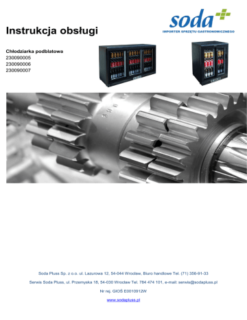 Instrukcja obsługi Chłodziarka podblatowa 230090005 230090006 230090007 Soda Pluss Sp. z o.o. ul. Lazurowa 12, 54-044 Wrocław, Biuro handlowe Tel. (71) 356-91-33 Serwis Soda Pluss, ul. Przemyska 18, 54-030 Wrocław Tel. 784 474 101, e-mail: [email protected] Nr rej. GIOŚ E0010912W www.sodapluss.pl Instrukcja obsługi PROSIMY ZAPOZNAĆ SIĘ Z INSTRUKCJĄ PRZED URUCHOMIENIEM URZĄDZENIA Zasady bezpieczeństwa: W celu zapewnienia prawidłowego użytkowania urządzenia należy uważnie przeczytać poniższe zalecenia. Uwagi zawarte w tym rozdziale mają na celu zapewnienie bezpieczeństwa użytkowników oraz uniknięcia przypadkowego uszkodzenia urządzenia. UWAGA! NIEPRAWIDŁOWE UŻYTKOWANIE CHŁODZIARKI MOŻE SPOWODOWAĆ POWAŻNE USZKODZENIA CIAŁA LUB W SKRAJNYCH PRZYPADKACH DOPROWADZIĆ DO SMIERCI UŻYTKOWNIKA. UWAGA! NIEPRAWIDŁOWE UŻYTKOWANIE CHŁODZIARKI MOŻE SPOWODOWAĆ POWAŻNE SZKODY, W ZALEŻNOŚCI OD OKOLICZNOŚCI. Niniejsza instrukcja, po zapoznaniu się z nią przez użytkowników, powinna być przechowywana w łatwo dostępnym miejscu. UWAGA! PODŁĄCZENIE URZĄDZENIA POWINNO ZOSTAĆ WYKONANE PRZEZ WYKWALIFIKOWANEGO SERWISANTA. SAMODZIELNE INSTALOWANIE CHŁODZIARKI MOŻE SPOWODOWAĆ WYCIEK WODY, CHŁODZIWA LUB NAWET PORAŻENIE PRĄDEM. Zasady ogólne: - Wszelkie naprawy muszą być wykonywane przez wykwalifikowany personel techniczny. Nie zastosowanie się do niniejszego zalecenia może wywołać pożar, spowodować uszkodzenie urządzenia lub porażenie prądem. - Zabrania się umieszczania substancji łatwopalnych w chodziarce. Może to doprowadzić do wybuchu i pożaru. - Należy unikać stosowania przedłużaczy. Przegrzany przedłużacz może wywołać pożar. - Nie wolno myć urządzenia w wodzie ponieważ działanie takie grozi porażeniem prądem. - Należy odpowiednio zabezpieczyć przewód zasilający. Nie wolno stawiać na przewodzie żadnych przedmiotów bądź umieszczać go w ciągach komunikacyjnych. Uszkodzenie przewodu może spowodować poważne uszkodzenie ciała, porażenie prądem lub wywołać pożar. - Zabrania się używania łatwopalnych substancji w sprayu w pobliżu urządzenia. Iskry z elektrycznych elementów urządzenia mogą spowodować wybuch i pożar. - Chłodziarka przeznaczona jest do przechowywania napojów. Urządzenie powinno być użytkowane zgodnie z jego przeznaczeniem. - Urządzenie przeznaczone do użytku wewnątrz pomieszczeń. Soda Pluss Sp. z o.o. ul. Lazurowa 12, 54-044 Wrocław, Biuro handlowe Tel. (71) 356-91-33 Serwis Soda Pluss, ul. Przemyska 18, 54-030 Wrocław Tel. 784 474 101, e-mail: [email protected] Nr rej. GIOŚ E0010912W www.sodapluss.pl Instrukcja obsługi - Urządzenie należy ustawić na suchym, płaskim i stabilnym podłożu. - Zabrania się wkładania palców, patyczków czy innych elementów do komory wentylatora. Takie działanie może doprowadzić do uszkodzenia urządzenia lub porażenia prądem. - Zabrania się stawiania ciężkich przedmiotów lub pojemników z wodą na chłodziarce. - W przypadku stwierdzenia ulatniania się gazu w pomieszczeniu, w którym umieszczona jest chłodziarka należy niezwłocznie zamknąć zawór dopływu gazu, otworzyć okno i dokładnie wywietrzyć pomieszczenie. - Urządzenie nie powinno stać w pobliżu źródeł ciepła. Takie ustawienie znacznie utrudnia pracę urządzenia. - Plecy chłodziarki powinny stać w min. odległości ok. 10 cm od ściany. Mniejsza odległość znacznie ograniczy sprawność chłodzenia urządzenia. - W celu odłączenia urządzenia od źródła zasilania należy wyciągnąć wtyczkę z gniazdka. Zabrania się ciągnięcia za przewód zasilający! - Nie wolno przeciążać półek chłodziarki. Dopuszczalne obciążenie półki wynosi 30kg. - Urządzenie powinno być podłączone do instalacji elektrycznej wyposażonej w wyłącznik różnicowoprądowy. - Należy sprawdzać poprawność montażu półek. Nieprawidłowe ich zamocowanie może spowodować zsunięcie się butelek i uszkodzenie chłodziarki. 1. Użytkowanie 1.1 Przed użyciem - Należy usunąć opakowanie i otworzyć drzwiczki na min. 1 min. w celu przewietrzenia komory chłodzącej. - Za pomocą wilgotnej ściereczki należy umyć wnętrze komory chłodzenia oraz obudowę chłodziarki. Wytrzeć do sucha. - Podłączyć wtyczkę do instalacji elektrycznej, o napięciu zgodnym z tabliczką znamionową, umieszczoną na urządzeniu. - Pozostawić włączone urządzenie na ok. 1 godzinę aby komora chłodzenia osiągnęła wymaganą temperaturę, przed umieszczeniem w niej butelek. Okapnik. - Proces rozmrażania następuje automatycznie a skropliny zbierają się w okapniku. - Skropliny z okapnika powinny odparowywać automatycznie. W przypadku dużej wilgotności powietrza, skropliny mogą gromadzić się w okapniku. Należy dbać aby okapnik był zawsze suchy. Efektywne użytkowanie Stosując się do poniższych zaleceń oszczędza się energię: - Aby zapobiec zbędnemu podniesieniu temperatury w komorze chłodniczej należy drzwi chłodziarki pozostawiać otwarte na jak najkrótszy czas. - Urządzenie należy ustawić w dobrze wentylowanym miejscu Soda Pluss Sp. z o.o. ul. Lazurowa 12, 54-044 Wrocław, Biuro handlowe Tel. (71) 356-91-33 Serwis Soda Pluss, ul. Przemyska 18, 54-030 Wrocław Tel. 784 474 101, e-mail: [email protected] Nr rej. GIOŚ E0010912W www.sodapluss.pl Instrukcja obsługi Umieszczanie butelek w chłodziarce Urządzenie chłodzi ustawione w nim butelki za pomocą cyrkulacji zimnego powietrza. Jeżeli cyrkulacja zimnego powietrza jest zaburzona, chłodzenie zawartości może być niewystarczające. Aby uniknąć w/w sytuacji należy stosować się do poniższych wskazówek: - urządzenie powinno stać w dobrze wentylowanym miejscu. - butelki w komorze chłodzącej nie powinny opierać się o szybę drzwi. Przestrzeń pomiędzy szybą o półką służy dobrej cyrkulacji powietrza i sprawnemu chłodzeniu komory chłodziarki. - butelki powinny być ustawione na pó