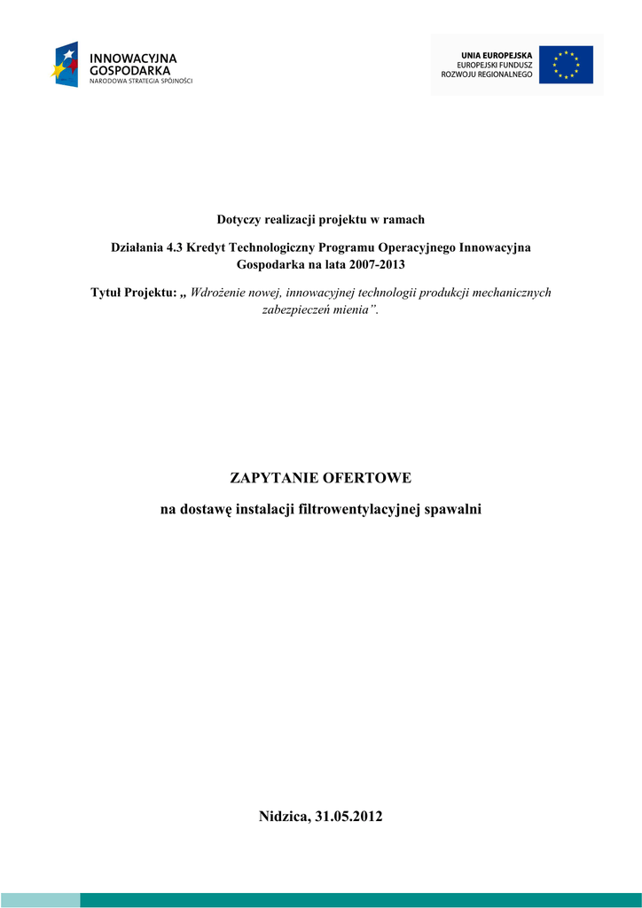 Dotyczy realizacji projektu w ramach Działania 4.3 Kredyt Technologiczny Programu Operacyjnego Innowacyjna Gospodarka na lata 2007-2013 Tytuł Projektu: ,, Wdrożenie nowej, innowacyjnej technologii produkcji mechanicznych zabezpieczeń mienia”. ZAPYTANIE OFERTOWE na dostawę instalacji filtrowentylacyjnej spawalni Nidzica, 31.05.2012 I. ZAMAWIAJACY KAMET Sp. z o.o. Piątki 48 13-100 Nidzica NIP: 7451003145, REGON: 510519842 Tel: +48 89 6254742 Fax: +48 89 6254023 e-mail: [email protected] II. POSTANOWIENIA OGÓLNE 1. 2. 3. 4. Zamawiający udziela zamówienia w trybie zapytania ofertowego. Zamawiający nie dopuszcza możliwości składania ofert częściowych. Zamawiający nie dopuszcza możliwości składania ofert wariantowych. Zamawiający nie przewiduje rozliczeń między zamawiającym a sprzedawcą w walutach obcych. 5. Zamawiający nie przewiduje zwrotu kosztów udziału w postępowaniu. III. PRZEDMIOT ZAMÓWIENIA Przedmiotem zamówienia jest dostarczenie fabrycznie nowej instalacji filtrowentylacyjnej spawalni, zgodnie ze specyfikacją zawartą w Załączniku nr 1. IV. OPIS SPOSOBU PRZYGOTOWANIA OFERTY Przygotowanie oferty: 1. Oferent może złożyć jedną ofertę, w formie pisemnej, w języku polskim. 2. Oferta powinna zawierać: • Nazwę i adres oferenta, telefon kontaktowy • Datę sporządzenia oferty • Cenę całkowitą netto i brutto • Warunki i terminy płatności • Warunki i terminy gwarancji • Maksymalny czas realizacji • Opis i specyfikację proponowanych urządzeń, parametrów technicznych, rozwiązań konstrukcyjnych, schemat instalacji, foldery, zdjęcia. • Listę referencyjną instalacji odpylających wykonanych od 2009 roku do chwili obecnej V. MIEJSCE ORAZ TERMIN SKŁADANIA OFERT 1. Ofertę należy złożyć do dnia 11.06.2012 r. do godz. 15.00. 2. Oferty można składać za pośrednictwem poczty elektronicznej na adres: [email protected] (scany dokumentów z podpisem i pieczęcią), faksem na nr: +48 89 6254023, pocztą lub osobiście na adres: KAMET Sp. z o.o., Piątki 48, 13-100 Nidzica. 3. Oferty dostarczone po terminie nie będą rozpatrywane. 4. W toku badania i oceny ofert Zamawiający może żądać od Oferentów wyjaśnień dotyczących treści złożonych ofert. 5. W szczególnie uzasadnionych przypadkach Zamawiający może, w każdym czasie, przed upływem terminu złożenia ofert, zmodyfikować treść zapytania ofertowego. VI. OCENA OFERT 1. Cena oferty uwzględniająca wszystkie zobowiązania, musi być podana w PLN z wyodrębnieniem należnego podatku VAT – jeśli występuje. 2. Rozliczenia między Zamawiającym a Oferentem prowadzone będą wyłącznie w PLN. 3. Cena podana w ofercie powinna obejmować wszystkie koszty i składniki związane z wykonaniem zamówienia (np. dostawą, montażem, instalacją, rozruchem). 4. Oferty spełniające warunki formalne zawarte w pkt IV zostaną ocenione na podstawie kryterium: 50% - cena 25% - parametry techniczne 25% - doświadczenie w realizacji podobnych zleceń Metodologia oceny ofert od 1 – 100 punktów przy założeniach: 1. Kryterium ceny: można uzyskać 50 punktów. Punktacja zależy od zaoferowanej ceny, najniższa oferta uzyska 50 punktów, pozostałe oferty otrzymają mniejszą ilość punktów. 2. Kryterium parametrów technicznych: maksymalnie 25 punktów. 3. Kryterium doświadczenia w realizacji podobnych zleceń: maksymalnie 25 punktów. Zamawiający wybierze najkorzystniejszą ofertę, która uzyska najwyższą ilość punktów w oparciu o ustalone wyżej kryteria. VII. TERMIN ZWIĄZANIA OFERTĄ Termin związania ofertą wynosi 90 dni od daty upływu terminu składania ofert. VIII. POZOSTAŁE INFORMACJE 1. Postępowanie prowadzone jest zgodnie z zasadą konkurencyjności bez zastosowania przepisów ustawy z dnia 29 stycznia 2004 r. Prawo zamówień publicznych. 2. W związku z sytuacją określoną w pkt. VI ppkt.4 oferentowi nie przysługują żadne środki odwoławcze przewidziane w cytowanej ustawie. 3. Zamawiający zastrzega sobie prawo do unieważnienia postępowania, na każdym jego etapie bez podania przyczyny. 4. Dodatkowych informacji można uzyskać pisząc na adres e-mailowy [email protected], lub pod numerem telefonicznym: +48 89 6254742 Załącznik nr 1. Specyfikacja instalacji filtrowentylacyjnej spawalni. Instalacja służyć będzie do odciągu pyłów spawalniczych ze stanowisk spawalniczych za pomocą ramion odciągowych. 1. Jednoczesna praca na 15 stanowiskach spawalniczych. 2. Elastyczne ramiona odciągowe o średnicy wewnętrznej 160 mm i długości 3 m – 15 sztuk. 3. Ramiona wyposażone w przepustnicę zamykająco – regulacyjną w ssawce oraz we wsporniki do montażu. 4. Centralna jednostka filtracyjna z kompletem wkładów filtracyjnych ustawiona na zewnątrz budynku. 5. Nominalna wydajność odciąganego powietrza dla instalacji - 12.000 m3/h przy sprężu wentylatora 3500 Pa. Wydajność mierzona po 500 roboczogodzinach pracy wkładów filtracyjnych. 6. Łączna powierzchnia czynna wkładów filtracyjnych – minimum 200 m2. Proszę określić rodzaj proponowanych filtrów. 7. Skuteczność filtracji > 99% dla cząsteczek = 0,5µm. Skuteczność potwierdzona certyfikatem niezależnej instytucji certyfikującej. 8. Czyszczenie wkładów filtracyjnych za pomocą automatycznie generowanych impulsów sprężonego powietrza w trakcie pracy urządzenia. Wskazać zużycie sprężonego powietrza. 9. Żywotność wkładów filtracyjnych – minimum 4000 godzin pracy. 10. Zawracanie przefiltrowanego powietrza z powrotem na halę dzięki zastosowaniu przepustnicy lato/zima. 11. Separator wstępny z wlotem stycznym zabezpieczający jednostkę filtracyjną przed ryzykiem przedostania się elementów palnych. 12. Zespół napylania półsyntetycznym węglanem wapnia zabezpieczający wkłady filtracyjne przed tłustymi dymami emitowanymi w momencie spawania elementów zaoliwionych. 13. Niezależny wentylator promieniowy z napędem bezpośrednim o mocy minimu