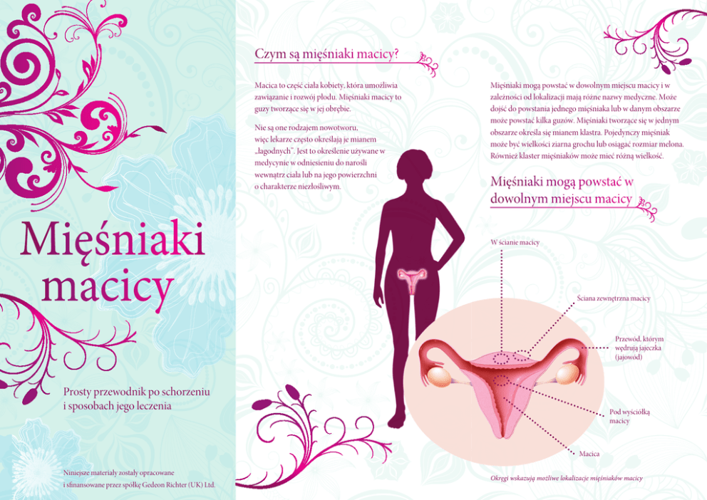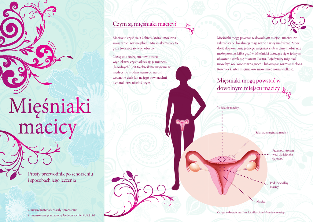 Czym są mięśniaki macicy? Macica to część ciała kobiety, która umożliwia zawiązanie i rozwój płodu. Mięśniaki macicy to guzy tworzące się w jej obrębie. Nie są one rodzajem nowotworu, więc lekarze często określają je mianem „łagodnych”. Jest to określenie używane w medycynie w odniesieniu do narośli wewnątrz ciała lub na jego powierzchni o charakterze niezłośliwym. Mięśniaki macicy Mięśniaki mogą powstać w dowolnym miejscu macicy i w zależności od lokalizacji mają różne nazwy medyczne. Może dojść do powstania jednego mięśniaka lub w danym obszarze może powstać kilka guzów. Mięśniaki tworzące się w jednym obszarze określa się mianem klastra. Pojedynczy mięśniak może być wielkości ziarna grochu lub osiągać rozmiar melona. Również klaster mięśniaków może mieć różną wielkość. Mięśniaki mogą powstać w dowolnym miejscu macicy W ścianie macicy Ściana zewnętrzna macicy Przewód, którym wędrują jajeczka (jajowód) Prosty przewodnik po schorzeniu i sposobach jego leczenia Pod wyściółką macicy Macica Niniejsze materiały zostały opracowane i sfinansowane przez spółkę Gedeon Richter (UK) Ltd. Okręgi wskazują możliwe lokalizacje mięśniaków macicy Jak powszechne są mięśniaki macicy i co je wywołuje? Czy niektóre kobiety są bardziej zagrożone mięśniakami macicy? Mięśniaki macicy są zjawiskiem powszechnym. Powstają u około 40 na 100 kobiet w różnym wieku. Mięśniaki macicy najczęściej występują u kobiet w wieku od 30 do 50 lat, ale zdarzają się także u kobiet młodszych lub starszych. (Patrz punkt „Jakie są objawy mięśniaków macicy?” na odwrocie). Uważa się, że mięśniaki macicy częściej powstają u kobiet pochodzenia afro-karaibskiego. W tej grupie mięśniaki powstaną u około 55 kobiet na 100. Mięśniaki macicy są częstsze również u kobiet o większej masie ciała, ponieważ ich poziom estrogenu jest wyższy niż u kobiet o mniejszej masie. Mięśniaki macicy powstają 40 100 u około na kobiet w różnym wieku Mięśniaki macicy najczęściej występują u kobiet w wieku od 30 50 do Mięśniaki powstaną 55 100 u około na lat Dokładna przyczyna mięśniaków macicy nie jest znana, ale ich powstanie wiąże się z hormonem zwanym estrogenem. Hormony to produkowane przez organizm chemiczne nośniki informacji, które wspomagają „komunikację” między różnymi częściami ciała, a tym samym ich współpracę. Estrogen przykładowo pomaga regulować menstruację. Przy wysokim poziomie estrogenu mięśniaki zwiększają swój rozmiar, na przykład w okresie ciąży. Menopauza, zwana czasem „przemianą”, to czas, kiedy kobieta przestaje miesiączkować. Dzieje się to zwykle około 50. roku życia. Wiadomo, że mięśniaki macicy kurczą się przy niskim poziomie estrogenu, jak na przykład po okresie menopauzy. kobiet pochodzenia afro-karaibskiego. Jakie są objawy mięśniaków macicy? Wiele kobiet nie wie, że ma mięśniaki macicy, ponieważ nie dają one żadnych objawów. Objawy występują u 1 na 3 kobiety. W jaki sposób diagnozuje się mięśniaki macicy? 13 na kobiety cierpiące na mięśniaki odczuwa jakiekolwiek objawy Kobiety posiadające mięśniaki macicy mogą odczuwać jeden lub większą liczbę poniższych objawów: • obfite, długie lub bolesne menstruacje; • krwawienie w środku cyklu; • zmęczenie lub zadyszka; • uczucie „pełności” w dole brzucha; • częste oddawanie moczu (tj. częściej niż zwykle); • zaparcia (tj. brak częstego oddawania stolca lub wysiłek podczas oddawania); • ból i obrzęk odbytu lub dolnej części odbytnicy (schorzenie zwane „hemoroidami”); • ból lub dyskomfort podczas seksu; • problemy z zajściem w ciążę; • poronienia (utrata dziecka lub dzieci przed terminem porodu). Wybór leków W procesie diagnozy lekarz będzie pytać o aktualne objawy lub stan zdrowia w przeszłości, a następnie przeprowadzi badanie fizykalne. Wiele kobiet cierpiących na mięśniaki macicy nie wie, że je posiada, ponieważ nie wywołują one żadnych objawów. W takich przypadkach mięśniaki dostrzega się przypadkiem podczas rutynowych badań, testów lub badań obrazowych macicy. W razie podejrzeń występowania mięśniaków lekarz zleci kolejne badania, jak badanie ultrasonograficzne, które potwierdzą ich istnienie i będą podstawą skierowania do specjalisty. W terapii mięśniaków macicy stosuje się kilka różnych leków. Konieczny jest ich właściwy dobór ze względu na różnice dotyczące: Leczenie • czasu działania; W przypadku zdiagnozowania mięśniaków macicy, których objawy są dla pacjentki problemem, lekarz zaproponuje możliwości leczenia. Najpierw podejmuje się próbę leczenia farmakologicznego, ale jeśli leki nie działają zgodnie z założeniami, lekarz powinien rozważyć zabieg chirurgiczny lub niechirurgiczny. Wybór leczenia zależy w znacznej mierze od konkretnego przypadku, z uwzględnieniem wieku, nasilenia objawów, wielkości, liczby i dokładnej lokalizacji guzów, a także planów dotyczących zajścia w ciążę. Gdy potrzebne będą leki na mięśniaki macicy, lekarz omówi wszystkie powyższe aspekty, by możliwe było rozpoczęcie terapii, która spełni oczekiwania zarówno pacjentki, jak i lekarza. • sposobu ich przyjmowania (tabletka, zastrzyk lub wyrób domaciczny); • częstotliwości przyjmowania; • komfortu stosowania; • czasu, w jakim wyeliminują poważne krwawienie; • czasu podawania; • ewentualnych skutków ubocznych. Jak działają leki do leczenia mięśniaków macicy? Wiele leków stosowanych do leczenia mięśniaków macicy zmienia ilość estrogenu i/lub progesteronu w organizmie. Estrogen i progesteron to hormony, czyli produkowane w organizmie chemiczne nośniki informacji. Wpływają one na obfitość krwawienia, więc zmiana ich poziomu w organizmie zmienia obfitość krwawienia macicznego. Niektóre leki