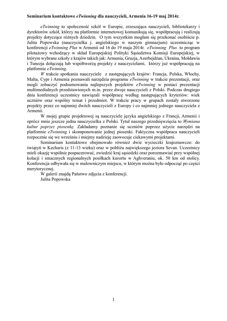 Seminarium kontaktowe eTwinning dla nauczycieli, Armenia 16-19 maj 2014r. eTwinning to społeczność szkół w Europie, zrzeszająca nauczycieli, bibliotekarzy i dyrektorów szkół, którzy na platformie internetowej komunikują się, współpracują i realizują projekty dotyczące różnych dziedzin. O tym wszystkim mogłam się przekonać osobiście p. Julita Popowska (nauczycielka j. angielskiego w naszym gimnazjum) uczestnicząc w konferencji eTwinning Plus w Armenii od 16 do 19 maja 2014r. eTwinning Plus to program pilotażowy wchodzący w skład Europejskiej Polityki Sąsiedztwa Komisji Europejskiej, w którym wybrane szkoły z krajów takich jak: Armenia, Gruzja, Azerbejdżan, Ukraina, Mołdawia i Tunezja dołączają lub współtworzą projekty z nauczycielami, którzy już współpracują na platformie eTwinning. W trakcie spotkania nauczyciele z następujących krajów: Francja, Polska, Włochy, Malta, Cypr i Armenia poznawali narzędzia programu eTwinning w trakcie prezentacji, oraz mogli zobaczyć podsumowania najlepszych projektów eTwinning w postaci prezentacji multimedialnych przedstawionych m.in. przez dwoje nauczycieli z Polski. Podczas drugiego dnia konferencji uczestnicy nawiązali współpracę według następujących kryteriów: wiek uczniów oraz wspólny temat i przedmiot. W trakcie pracy w grupach zostały stworzone projekty przez co najmniej dwóch nauczycieli z Europy i co najmniej jednego nauczyciela z Armenii. W mojej grupie projektowej są nauczyciele języka angielskiego z Francji, Armenii i oprócz mnie jeszcze jedna nauczycielka z Polski. Tytuł naszego przedsięwzięcia to Wymiana kultur poprzez piosenkę. Zakładamy poznanie się uczniów poprzez użycie narzędzi na platformie eTwinning i skomponowanie jednej piosenki. Faktyczna współpraca nauczycieli rozpocznie się we wrześniu i miejmy nadzieję zaowocuje ciekawymi projektami. Seminarium kontaktowe obejmowało również dwie wycieczki krajoznawcze: do świątyń w Kecharis (z 11-13 wieku) oraz w pobliżu największego jeziora Sevan. Uczestnicy mieli okazję wspólnie pospacerować, zwiedzić kraj sąsiedzki oraz porozmawiać przy wspólnej kolacji i smacznych regionalnych posiłkach kurortu w Aghveraniu, ok. 50 km od stolicy. Konferencja odbywała się w malowniczym miejscu, w którym można było odpocząć po części merytorycznej. W galerii znajdą Państwo zdjęcia z konferencji. Julita Popowska 1