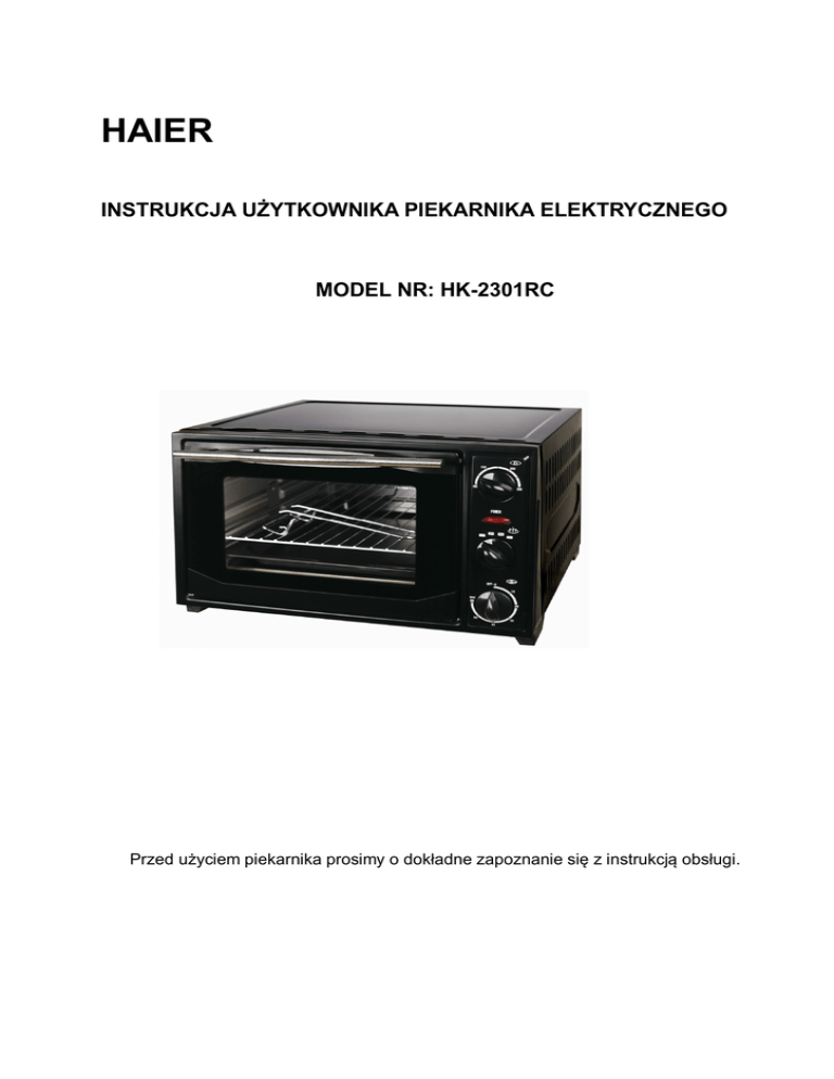 HAIER INSTRUKCJA UŻYTKOWNIKA PIEKARNIKA ELEKTRYCZNEGO MODEL NR: HK-2301RC Przed użyciem piekarnika prosimy o dokładne zapoznanie się z instrukcją obsługi. OPIS ELEMENTÓW: e f d g b c a a. Programator czasu h. Blacha do pieczenia b. Lampka sygnalizacyjna i. Ruszt c. Regulator pieczenia j. Szczypce d. Pokrętło termostatu k. Uchwyt rożna e. Obudowa l. Motylki f. Uchwyt drzwi m. Rożen g. Przeszklone drzwi n. Śruby motylkowe 1 Ważne wskazówki bezpieczeństwa: Podczas stosowania urządzeń elektrycznych należy zawsze przestrzegać podstawowych zasad bezpieczeństwa: 1. Przeczytać wszystkie instrukcje. 2. Nie dotykać gorących powierzchni, korzystać z uchwytów lub pokręteł. 3. Stały nadzór jest niezbędny, gdy urządzenie jest używane przez dzieci lub w pobliżu dzieci. 4. W celu ochrony przed porażeniem prądem elektrycznym nie należy zanurzać przewodu zasilającego, wtyczki ani elementów piekarnika w wodzie lub innej cieczy. 5. Przewód zasilający nie powinien zwisać na krawędzi stołu lub lady, ani dotykać gorących powierzchni. 6. Nie używać urządzenia z uszkodzonym przewodem zasilającym lub wtyczką ani urządzenia niesprawnego bądź w jakikolwiek sposób uszkodzonego. Urządzenie należy oddać do najbliższego autoryzowanego punktu serwisowego w celu sprawdzenia, naprawy lub regulacji. 7. Stosowanie osprzętu niezalecanego przez producenta urządzenia może spowodować urazy ciała lub stanowić zagrożenie. 8. Urządzenia nie należy stawiać w nagrzanym piekarniku lub na gorącym palniku gazowym ani kuchence mikrofalowej. 9. Podczas korzystania z piekarnika należy zachować odstęp bezpieczeństwa przynajmniej 13 cm (5 cali) z każdej strony, aby zapewnić właściwą cyrkulację powietrza. 10. Urządzenie należy odłączyć od zasilania, gdy nie jest używane oraz przed czyszczeniem. Przed czyszczeniem, założeniem lub zdjęciem części urządzenia należy odczekać na ochłodzenie urządzenia. 11. Aby odłączyć urządzenie, pokrętło należy ustawić w położeniu wyłączonym (OFF), a następnie wyjąć wtyczkę z gniazdka wtykowego. Zawsze należy ciągnąć za wtyczkę, nie za przewód. 12. Należy zachować szczególną ostrożność podczas przemieszczania urządzenia zawierającego gorący olej lub inne gorące ciecze. 13. Nie należy zakrywać żadnej części piekarnika folią metalową. 14. Nie należy czyścić piekarnika metalowymi czyścikami, ponieważ ich części mogą się odłamać i zetknąć z elementami elektrycznymi powodując ryzyko porażenia prądem elektrycznym. 15. Podczas gotowania lub pieczenia nie należy nigdy pozostawiać urządzenia bez nadzoru. 16. W piekarniku nie należy umieszczać żywności o dużych wymiarach lub opakowań z folii metalowej, ponieważ może to spowodować niebezpieczeństwo pożaru lub porażenia prądem elektrycznym. 17. Do zapłonu ognia może dojść, gdy piekarnik zostanie przykryty lub nastąpi zetknięcie uruchomionego urządzenia z łatwopalnym materiałem, np. zasłonami, draperiami, ścianami itp. Podczas pracy urządzenia nie należy umieszczać na nim żadnych przedmiotów. 18. Należy zachować szczególną ostrożność podczas stosowania pojemników wykonanych z materiałów innych niż metal lub szkło. 19. W piekarniku nie należy umieszczać następujących materiałów: tektura, plastik, papier itp. 20. W piekarniku nie należy przechowywać niczego poza zalecanymi akcesoriami. 21. Zawsze należy zakładać ochronne, izolowane rękawice kuchenne podczas wkładania potraw z gorącego piekarnika lub wyjmowania. 22. Urządzenia nie należy stosować na wolnym powietrzu. 23. Urządzenia nie należy stosować niezgodnie z przeznaczeniem. 2 WSKAZÓWKI DOTYCZĄCE UŻYTKOWANIA PRZED UŻYCIEM PIEKARNIKA Przed pierwszym użyciem piekarnika Czynności, które należy wykonać: 1. Należy upewnić się, czy piekarnik jest niepodłączony i programator czasu (TIMER) znajduje się w położeniu wyłączonym (OFF). 2. Wyjąć wszystkie ruszty i blachy i umyć je w gorącej wodzie z płynem do naczyń lub w zmywarce do naczyń. 3. Dokładnie wysuszyć wszystkie akcesoria i ponownie włożyć do piekarnika. Podłączyć piekarnik do gniazda elektrycznego – urządzenie jest gotowe do użycia. 4. Po przygotowaniu piekarnika do pierwszego użycia zalecamy nastawienie maksymalnej temperatury na ok. 15 minut, aby wyeliminować wszelkie ślady oleju, które mogłyby pozostać po procesie produkcyjnym. PRZYDATNE WSKAZÓWKI Wydobywanie się niewielkiej ilości dymu podczas pierwszego uruchomienia jest zjawiskiem normalnym i problem zniknie w ciągu 20 minut. Zasadniczo nie ma konieczności podgrzewania piekarnika, jednak lepsze efekty kulinarne osiągnie się przez podgrzanie piekarnika przed pieczeniem delikatnych potraw, takich, jak średnio wypieczone mięso i ciasta. SPOSÓB UŻYCIA 1. Pokrętło termostatu należy ustawić w położeniu „Max”. 2. Ustawić regulator wyboru funkcji na rożen. Przełożyć zaostrzony koniec PRĘTA rożna przez motylek, zwracając uwagę, aby punkty na motylku były skierowane w tym samym kierunku, co zaostrzone końce pręta rożna. Przesunąć w kierunku kwadratowego końca pręta rożna i zabezpieczyć śrubami motylkowymi. 3. Nadziać produkt spożywczy, który ma zostać upieczony, na pręt rożna przebijając pręt bezpośrednio przez środek produktu spożywczego. 4. Umieścić drugi motylek na przeciwnym końcu rożna z nadzianym produktem spożywczym i zabezpieczyć śrubą motylkową. 5. Sprawdzić, czy produkt spożywczy jest umieszczony na środku pręta rożna. 6. Włożyć zaostrzony koniec pręta rożna do GNIAZDA NAPĘDU i sprawdzić, czy kwadratowy koniec pręta spoczywa we wsporniku pręta. 7. Obrócić programator czasu na pożądany czas pieczenia. 8. Po upieczeniu obrócić programator czasu do pozycji wyłączonej (OFF). 9. Wyjąć pręt rożna umieszczając haczyki uchwytu rożna pod rowkami z obu stron pręta rożna. Unieść le