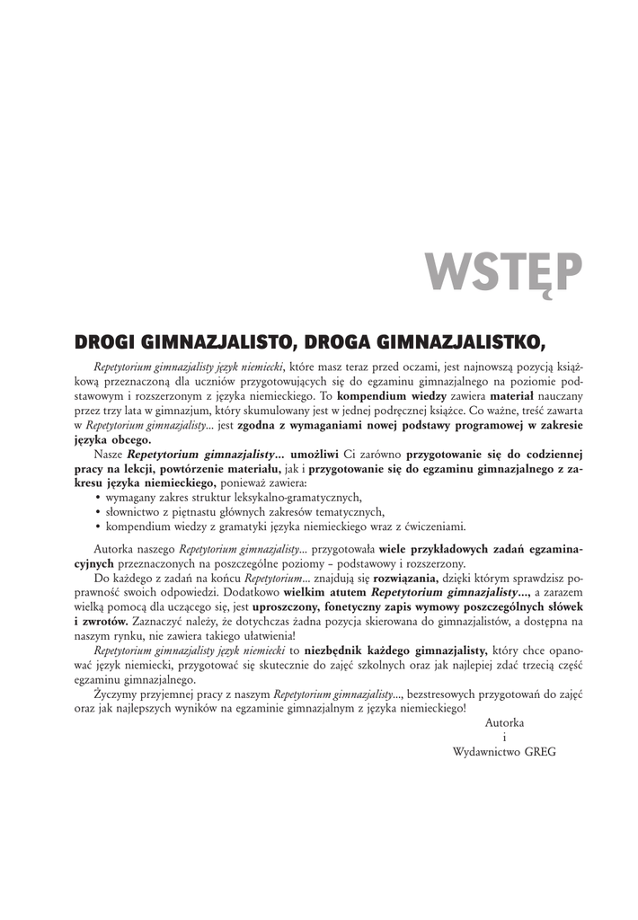 Wstęp Drogi GIMNAZJALISTO, Droga GIMNAZJALISTKO, Repetytorium gimnazjalisty język niemiecki, które masz teraz przed oczami, jest najnowszą pozycją książkową przeznaczoną dla uczniów przygotowujących się do egzaminu gimnazjalnego na poziomie podstawowym i rozszerzonym z języka niemieckiego. To kompendium wiedzy zawiera materiał nauczany przez trzy lata w gimnazjum, który skumulowany jest w jednej podręcznej książce. Co ważne, treść zawarta w Repetytorium gimnazjalisty… jest zgodna z wymaganiami nowej podstawy programowej w zakresie języka obcego. Nasze Repetytorium gimnazjalisty… umożliwi Ci zarówno przygotowanie się do codziennej pracy na lekcji, powtórzenie materiału, jak i przygotowanie się do egzaminu gimnazjalnego z zakresu języka niemieckiego, ponieważ zawiera: • wymagany zakres struktur leksykalno-gramatycznych, • słownictwo z piętnastu głównych zakresów tematycznych, • kompendium wiedzy z gramatyki języka niemieckiego wraz z ćwiczeniami. Autorka naszego Repetytorium gimnazjalisty… przygotowała wiele przykładowych zadań egzaminacyjnych przeznaczonych na poszczególne poziomy – podstawowy i rozszerzony. Do każdego z zadań na końcu Repetytorium… znajdują się rozwiązania, dzięki którym sprawdzisz poprawność swoich odpowiedzi. Dodatkowo wielkim atutem Repetytorium gimnazjalisty…, a zarazem wielką pomocą dla uczącego się, jest uproszczony, fonetyczny zapis wymowy poszczególnych słówek i zwrotów. Zaznaczyć należy, że dotychczas żadna pozycja skierowana do gimnazjalistów, a dostępna na naszym rynku, nie zawiera takiego ułatwienia! Repetytorium gimnazjalisty język niemiecki to niezbędnik każdego gimnazjalisty, który chce opanować język niemiecki, przygotować się skutecznie do zajęć szkolnych oraz jak najlepiej zdać trzecią część egzaminu gimnazjalnego. Życzymy przyjemnej pracy z naszym Repetytorium gimnazjalisty…, bezstresowych przygotowań do zajęć oraz jak najlepszych wyników na egzaminie gimnazjalnym z języka niemieckiego! Autorka i Wydawnictwo GREG SPIS TREŚCI Wstęp.............................................................................................................................................................................. 3 Opis egzaminu gimnazjalnego................................................................................................................................... 9 INFORMACJA Identyfikacja i lokalizacja osoby lub przedmiotu................................................................................................12 Pytanie i prośba o informację.................................................................................................................................. 14 Opis............................................................................................................................................................................... 19 Opis postaci.........................................................................................................................................................19 Opis stanu emocjonalnego................................................................................................................................22 Opis miejsca i przedmiotu................................................................................................................................24 Opis czynności zwyczajowych i odbywających się w momencie mówienia............................................25 Opis planów i zamierzeń...................................................................................................................................27 Określenie czasu, odległości, miary, wagi, ceny....................................................................................................28 Określanie czasu..................................................................................................................................................28 Określanie odległości..........................................................................................................................................30 Określanie ceny....................................................................................................................................................31 Określanie miary, wagi........................................................................................................................................31 Porównanie cech osób, przedmiotów, miejsc, sytuacji, czynności....................................................................32 Informacja o czynnościach i sytuacjach w przeszłości........................................................................................33 Przekazanie informacji podanej przez osobę trzecią...........................................................................................36 Wyrażanie przyczyny, skutku, warunku, celu; powiązanie informacji..............................................................37 OPINIA Wyrażanie własnej opinii, np. na temat osoby, przedmiotu, sytuacji..............................................................39 Prośba o opinię, np. na temat osoby, przedmiotu, sytuacji..............................................................................43 Wyrażenie zgody lub sprzeciwu............................................................................................................................... 44 Potwierdzenie i zaprzeczenie zasłyszanej opinii....................................................................................................46 Przedstawienie odmiennego punktu widzenia......................................................................................................47 Przekazanie opinii osób trzecich............................................................................................................................. 49 ZNAJOMOŚĆ PRZEDM
