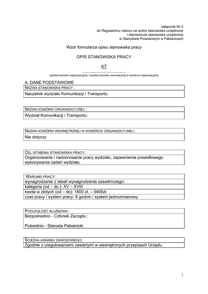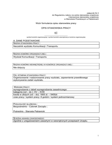 załącznik Nr 2 do Regulaminu naboru na wolne stanowiska urzędnicze i kierownicze stanowiska urzędnicze w Starostwie Powiatowym w Pabianicach Wzór formularza opisu stanowiska pracy OPIS STANOWISKA PRACY KT ............................................. symbol komórki organizacyjnej / symbol komórki wewnętrznej w komórce organizacyjnej A. DANE PODSTAWOWE NAZWA STANOWISKA PRACY : Naczelnik wydziału Komunikacji i Transportu NAZWA KOMÓRKI ORGANIZACYJNEJ : Wydział Komunikacji i Transportu NAZWA KOMÓRKI WEWNĘTRZNEJ W KOMÓRCE ORGANIZACYJNEJ : Nie dotyczy CEL ISTNIENIA STANOWISKA PRACY: Organizowanie i nadzorowanie pracy wydziału, zapewnienie prawidłowego wykonywania zadań wydziału. WARUNKI PRACY: wynagrodzenie z tabeli wynagrodzenia zasadniczego: kategoria (od – do ): XV – XVIII kwota w złotych (od – do): 1800 zł. – 5400zł. czas pracy / system pracy: 8 godzin / system jednozmianowy PODLEGŁOŚĆ SŁUŻBOWA : Bezpośrednio - Członek Zarządu ; Pośrednio - Starosta Pabianicki ŚCIEŻKA AWANSU ZAWODOWEGO: Zgodnie z uregulowaniami zawartymi w wewnętrznych przepisach Urzędu. 1 B. ZAKRES OBOWIĄZKÓW, UPRAWNIEŃ I ODPOWIEDZIALNOŚCI ZAKRES OBOWIĄZKÓW ORAZ CZYNNOŚCI : 1.WYKONYWANIE ZADAŃ NALEŻĄCYCH DO NACZELNIKÓW WYDZIAŁÓW OKREŚLONYCH W REGULAMINIE ORGANIZACYJNYM STAROSTWA. 2.ORGANIZOWANIE I NADZOROWANIE PRACY, ZAPEWNIENIE PRAWIDŁOWEGO WYKONANIA ZADAŃ W WYDZIALE KOMUNIKACJI I TRANSPORTU. 3.NADZOROWANIE I ZAPEWNIENIE PRAWIDŁOWEGO WYKONYWANIA ZADAŃ PRZEZ PRACOWNIKÓW WYDZIAŁU W TYM : A)WYDAWANIE POLECEŃ SŁUŻBOWYCH I KONTROLOWANIE ICH WYKONANIA, B)USPRAWNIANIE ORGANIZACJI, METOD I FORM PRACY WYDZIAŁU, C)ORGANIZOWANIE WSPÓŁDZIAŁANIA PRACOWNIKÓW WEWNĄTRZ WYDZIAŁU ORAZ Z INNYMI KOMÓRKAMI ORGANIZACYJNYMI STAROSTWA. 4.PRZYGOTOWYWANIE PROJEKTÓW UCHWAŁ RADY I ZARZĄDU POWIATU W SPRAWACH DOTYCZĄCYCH KOMUNIKACJI I TRANSPORTU. 5.NADZÓR NAD TERMINOWOŚCIĄ I PRAWIDŁOWOŚCIĄ ZAŁATWIANIA SPRAW. 6.NADZÓR NAD PRAWIDŁOWYM PROWADZENIEM I PRZECHOWYWANIEM WYTWARZANEJ W WYDZIALE DOKUMENTACJI. 7.PRZYGOTOWYWANIE MATERIAŁÓW W TOKU ROZPATRYWANIA SKARG I WNIOSKÓW. ZAKRES UPRAWNIEŃ SŁUŻBOWYCH I UPRAWNIEŃ ZWIĄZANYCH Z DANYM STANOWISKIEM : 1. SPRAWOWANIE FUNKCJI KIEROWNICZEJ W STOSUNKU DO PRACOWNIKÓW WYDZIAŁU KOMUNIKACJI I TRANSPORTU. 2. PRZYJMOWANIE INTERESANTÓW, UDZIELANIE IM WYJAŚNIEŃ, ZAŁATWIANIE W IMIENIU STAROSTY INDYWIDUALNYCH SPRAW Z ZAKRESU ADMINISTRACJI PUBLICZNEJ, WYDAWANIE DECYZJI ADMINISTRACYJNYCH, POSTANOWIEŃ I ZAŚWIADCZEŃ. 3.WYRAŻANIE ZGODY NA UDZIELANIE URLOPÓW I ZWOLNIEŃ Z PRACY PRACOWNIKÓW WYDZIAŁU. 4.WNIOSKOWANIE O PRZESZEREGOWANIA, NAGRODY LUB AWANSE PRACOWNIKÓW WYDZIAŁU. 5.WSPÓŁDZIAŁANIE Z WŁAŚCIWYMI INSTYTUCJAMI I JEDNOSTKAMI DZIAŁAJĄCYMI W ZAKRESIE PROWADZONYCH I NADZOROWANYCH SPRAW. 6.PEŁNIĄCY OBOWIĄZKI NACZELNIKA WYDZIAŁU KOMUNIKACJI I TRANSPORTU UPOWAŻNIONY JEST DO: NADZORU NAD STACJAMI KONTROLI POJAZDÓW, NADZORU NAD OŚRODKAMI SZKOLENIA KIEROWCÓW, WYDAWANIE ZAŚWIADCZEŃ NA PRZEWOZY DROGOWE NA POTRZEBY WŁASNE, WYDAWANIE LICENCJI NA WYKONYWANIE KRAJOWEGO TRANSPORTU DROGOWEGO OSÓB I RZECZY, UDZIELENIA, ODMOWY UDZIELENIA, COFANIA, ZMIANY LUB STWIERDZENIA WYGAŚNIĘCIA ZEZWOLENIA NA PRZEWOZY REGULARNE I NIEREGULARNE POJAZDAMI SAMOCHODOWYMI NIE BĘDĄCYMI TAKSÓWKAMI OBEJMUJĄCYMI ZASIĘGIEM POWIAT PABIANICKI LUB POWIATY SĄSIADUJĄCE Z POWIATEM PABIANICKIM DLA PRZEDSIĘBIORCÓW MAJĄCYCH SWA SIEDZIBĘ NA TERENIE POWIATU PABIANICKIEGO, PROWADZENIA SPRAW ZWIĄZANYCH Z WYZNACZANIEM JEDNOSTEK USUWAJĄCYCH POJAZDY Z DROGI ORAZ PROWADZĄCYCH PARKINGI STRZEŻONE DLA POJAZDÓW USUNIĘTYCH, g) NADZORU NAD PODMIOTAMI GOSPODARCZYMI WYKONUJĄCYMI ZADANIA USUWANIA POJAZDÓW Z DROGI I PRZECHOWUJĄCYCH JE NA PARKINGACH STRZEŻONYCH, W ZAKRESIE WYSOKOŚCI OPŁAT USTALONYCH PRZEZ 2 RADĘ POWIATU PABIANICKIEGO, h) SPORZĄDZANIA UMÓW NA DOSTAWĘ DOKUMENTÓW KOMUNIKACYJNYCH I TABLIC REJESTRACYJNYCH, i) OBSŁUGI EGZAMINU W ZAKRESIE TRANSPORTU DROGOWEGO TAKSÓWKĄ, j) PRZYGOTOWYWANIA PROJEKTU UCHWAŁY RADY POWIATU USTALAJĄCEJ WYSOKOŚĆ OPŁAT ZA USUWANIE I PARKOWANIE POJAZDÓW, k) WYDAWANIA DECYZJI NA NABICIE NUMERÓW IDENTYFIKACYJNYCH POJAZDÓW ORAZ TABLICZKI ZNAMIONOWEJ ZASTĘPCZEJ, l) UDZIELANIA ODPOWIEDZI DLA POLICJI, PROKURATURY I INNYCH ORGANÓW, m) SPORZĄDZANIA SPRAWOZDAŃ GUS, URZĘDU SKARBOWEGO I URZĘDÓW GMIN, n) PODEJMOWANIA DECYZJI ADMINISTRACYJNYCH W SPRAWACH NALEŻĄCYCH DO WŁAŚCIWOŚCI STAROSTY OKREŚLONYCH W USTAWIE Z DNIA 20 CZERWCA 1997 R. - PRAWO O RUCHU DROGOWYM, W USTAWIE Z DNIA 5 STYCZNIA 2011 R. - O KIERUJĄCYCH POJAZDAMI ORAZ PODPISYWANIA PISM W SPRAWACH NALEŻĄCYCH DO WŁAŚCIWOŚCI RZECZOWEJ WYDZIAŁU Z WYŁĄCZENIEM PISM ZASTRZEŻONYCH DLA STAROSTY, WICESTAROSTY I CZŁONKÓW ZARZĄDU. PRACOWNIK BĘDZIE PONOSIŁ ODPOWIEDZIALNOŚĆ ZA PRAWIDŁOWE, ZGODNE Z PRAWEM I TERMINOWE WYKONYWANIE ZADAŃ OKREŚLONYCH W ZAKRESIE OBOWIĄZKÓW OPISANYCH W PUNKCIE - SZCZEGÓŁOWY ZAKRES OBOWIĄZKÓW ORAZ CZYNNOŚCI ORAZ ZA PRZESTRZEGANIE OBOWIĄZKÓW WYNIKAJĄCYCH Z PRZEPISÓW KODEKSU PRACY, REGULAMINU ORGANIZACYJNEGO STAROSTWA POWIATOWEGO W PABIANICACH ORAZ UCHWAŁ I ZARZĄDZEŃ RADY POWIATU, ZARZĄDU POWIATU I STAROSTY PABIANICKIEGO. ZAKRES ODPOWIEDZIALNOŚCI : PROWADZENIE REJESTRU STACJI KONTROLI POJAZDÓW. PROWADZENIE EWIDENCJI INSTRUKTORÓW. PROWADZENIE REJESTRU SZKÓŁ NAUKI JAZDY. WYDAWANIE UPRAWNIEŃ DLA DIAGNOSTÓW. PRZEPROWADZANIE OCEN OKRESOWYCH PRACOWNIKÓW WYDZIAŁU PODEJMOWANIE DECYZJI ADMINISTRACYJNYCH W SPRAWACH NALEŻĄCYCH DO WŁAŚCIWOŚCI STAROSTY OKREŚLONYCH W USTAWIE Z DNIA 20 CZERWCA 1997 R. – PRAWO O RUCHU DROGOWYM I USTAWY Z DNIA 6 WRZEŚNIA 2001 R. O TRANSPORCIE DROGOWYM ORAZ PODPISYWANIA PISM W SPRAWACH NALEŻĄCYCH DO WŁAŚCIWOŚCI RZECZOWEJ WYDZIAŁU Z WYŁĄCZENIEM PISM ZASTRZEŻONYCH DLA STAROSTY, WICESTAROSTY I CZŁONKÓW ZARZĄDU POWIATU. DOSTĘP DO INFORMACJI NIEJAWNYCH : Zgodnie z uregulowaniami zawartymi w wewnętrznych przepisach Urzędu. DOSTĘP DO DANYCH OSOBOWYCH :