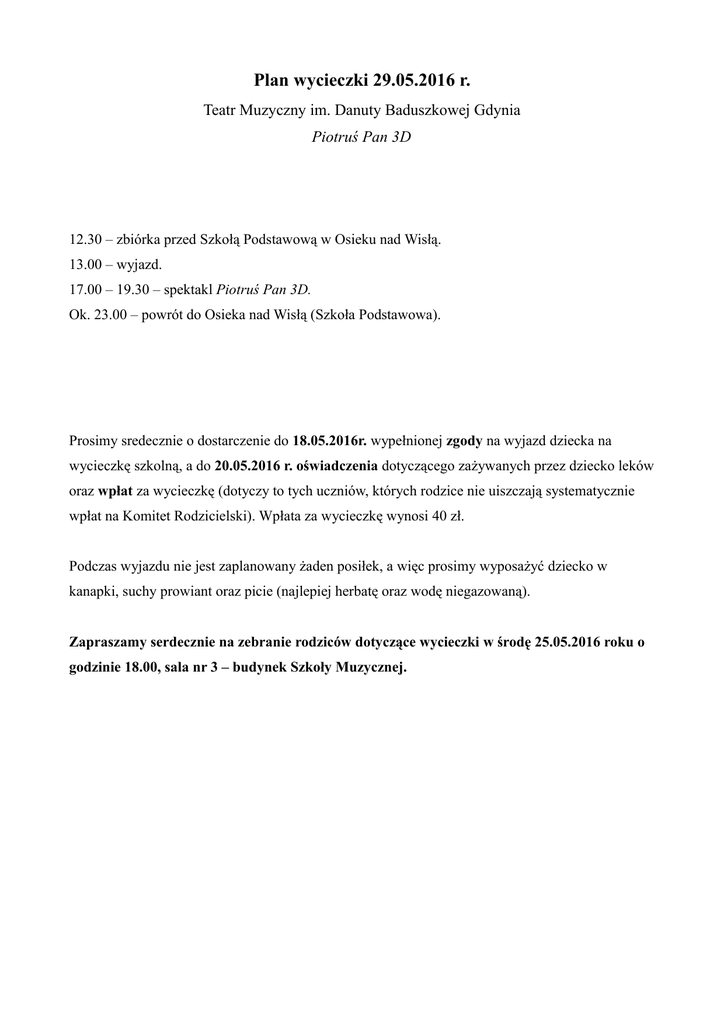 Plan wycieczki 29.05.2016 r. Teatr Muzyczny im. Danuty Baduszkowej Gdynia Piotruś Pan 3D 12.30 – zbiórka przed Szkołą Podstawową w Osieku nad Wisłą. 13.00 – wyjazd. 17.00 – 19.30 – spektakl Piotruś Pan 3D. Ok. 23.00 – powrót do Osieka nad Wisłą (Szkoła Podstawowa). Prosimy sredecznie o dostarczenie do 18.05.2016r. wypełnionej zgody na wyjazd dziecka na wycieczkę szkolną, a do 20.05.2016 r. oświadczenia dotyczącego zażywanych przez dziecko leków oraz wpłat za wycieczkę (dotyczy to tych uczniów, których rodzice nie uiszczają systematycznie wpłat na Komitet Rodzicielski). Wpłata za wycieczkę wynosi 40 zł. Podczas wyjazdu nie jest zaplanowany żaden posiłek, a więc prosimy wyposażyć dziecko w kanapki, suchy prowiant oraz picie (najlepiej herbatę oraz wodę niegazowaną). Zapraszamy serdecznie na zebranie rodziców dotyczące wycieczki w środę 25.05.2016 roku o godzinie 18.00, sala nr 3 – budynek Szkoły Muzycznej.
