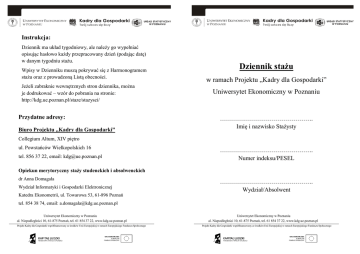 Instrukcja: Dziennik ma układ tygodniowy, ale należy go wypełniać opisując hasłowo każdy przepracowany dzień (podając datę) w danym tygodniu stażu. Wpisy w Dzienniku muszą pokrywać się z Harmonogramem stażu oraz z prowadzoną Listą obecności. Jeżeli zabraknie wewnętrznych stron dziennika, można je dodrukować – wzór do pobrania na stronie: http://kdg.ue.poznan.pl/staze/stazysci/ Przydatne adresy: Biuro Projektu „Kadry dla Gospodarki” Dziennik stażu w ramach Projektu „Kadry dla Gospodarki” Uniwersytet Ekonomiczny w Poznaniu ……………………………………….. Imię i nazwisko Stażysty Collegium Altum, XIV piętro ul. Powstańców Wielkopolskich 16 tel. 856 37 22, email: [email protected] ……………………………………….. Numer indeksu/PESEL Opiekun merytoryczny staży studenckich i absolwenckich dr Anna Domagała Wydział Informatyki i Gospodarki Elektronicznej Katedra Ekonometrii, ul. Towarowa 53, 61-896 Poznań ……………………………………….. Wydział/Absolwent tel. 854 38 74, email: [email protected] Uniwersytet Ekonomiczny w Poznaniu al. Niepodległości 10, 61-875 Poznań, tel. 61 854 37 22, www.kdg.ue.poznan.pl Projekt Kadry dla Gospodarki współfinansowany ze środków Unii Europejskiej w ramach Europejskiego Funduszu Społecznego Uniwersytet Ekonomiczny w Poznaniu al. Niepodległości 10, 61-875 Poznań, tel. 61 854 37 22, www.kdg.ue.poznan.pl Projekt Kadry dla Gospodarki współfinansowany ze środkówUnii Europejskiej w ramach Europejskiego Funduszu Społecznego Data ………………… Nazwa i adres miejsca odbywania stażu: (poniżej pieczęć i dane Pracodawcy) Wykonywane czynności w tygodniu od ……………… do ……………… ……………………………………………… …………………………………………………….. …………………………………………………….. …………………………………………………….. ……………………………………………… ……………………………………………… ……………………………………………… ……………………………………………… ……………………………………………… Okres odbywania stażu: od …………..…..… do ...….…………….. ……………………………………………… Uwagi: ……………………………………………… ……………………………………………… ……………………………………………… Uniwersytet Ekonomiczny w Poznaniu al. Niepodległości 10, 61-875 Poznań, tel. 61 854 37 22, www.kdg.ue.poznan.pl Projekt Kadry dla Gospodarki współfinansowany ze środków Unii Europejskiej w ramach Europejskiego Funduszu Społecznego …………… ……………… podpis Stażysty podpis Opiekuna Uniwersytet Ekonomiczny w Poznaniu al. Niepodległości 10, 61-875 Poznań, tel. 61 854 37 22, www.kdg.ue.poznan.pl Projekt Kadry dla Gospodarki współfinansowany ze środkówUnii Europejskiej w ramach Europejskiego Funduszu Społecznego Data ………………… Wykonywane czynności w tygodniu od ……………… do ……………… Dane Opiekuna Stażysty z ramienia Pracodawcy: ……………………………………………… ……………………………………………… ……………………………………………… …………………………………………………….. …………………………………………………….. ……………………………………………… ……………………………………………… …………………………………………………….. ……………………………………………… …………………………………………………….. ……………………………………………… Uwagi: ……………………………………………… ……………………………………………… ……………………………………………… …………… ……………… podpis Stażysty podpis Opiekuna Uniwersytet Ekonomiczny w Poznaniu al. Niepodległości 10, 61-875 Poznań, tel. 61 854 37 22, www.kdg.ue.poznan.pl Projekt Kadry dla Gospodarki współfinansowany ze środków Unii Europejskiej w ramach Europejskiego Funduszu Społecznego Uniwersytet Ekonomiczny w Poznaniu al. Niepodległości 10, 61-875 Poznań, tel. 61 854 37 22, www.kdg.ue.poznan.pl Projekt Kadry dla Gospodarki współfinansowany ze środkówUnii Europejskiej w ramach Europejskiego Funduszu Społecznego Data ………………… Data ………………… Wykonywane czynności Wykonywane czynności w tygodniu od dnia ……………… do dnia ……………… w tygodniu od ……………… do ……………… ……………………………………………… ……………………………………………… ……………………………………………… ……………………………………………… ……………………………………………… ……………………………………………… ……………………………………………… ……………………………………………… ……………………………………………… ……………………………………………… ……………………………………………… ……………………………………………… ……………………………………………… ……………………………………………… Uwagi: ……………………………………………… Uwagi: ……………………………………………… ……………………………………………… ……………………………………………… ……………………………………………… ……………………………………………… …………… ……………… 