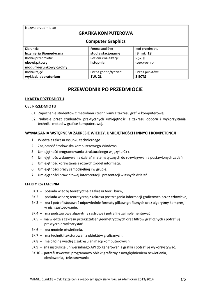 Nazwa przedmiotu: GRAFIKA KOMPUTEROWA Computer Graphics Kierunek: Forma studiów: Kod przedmiotu: Inżynieria Biomedyczna studia stacjonarne Rodzaj przedmiotu: Poziom kwalifikacji: obowiązkowy moduł kierunkowy ogólny I stopnia IB_mk_18 Rok: II Semestr: IV Rodzaj zajęć: Liczba godzin/tydzień: Liczba punktów: wykład, laboratorium 1W, 2L 3 ECTS PRZEWODNIK PO PRZEDMIOCIE I KARTA PRZEDMIOTU CEL PRZEDMIOTU C1. Zapoznanie studentów z metodami i technikami z zakresu grafiki komputerowej. C2. Nabycie przez studentów praktycznych umiejętności z zakresu doboru i wykorzystania technik i metod w grafice komputerowej. WYMAGANIA WSTĘPNE W ZAKRESIE WIEDZY, UMIEJĘTNOŚCI I INNYCH KOMPETENCJI 1. 2. 3. 4. 5. 6. 7. Wiedza z zakresu rysunku technicznego Znajomość środowiska komputerowego Windows. Umiejętność programowania strukturalnego w języku C++. Umiejętność wykonywania działań matematycznych do rozwiązywania postawionych zadań. Umiejętność korzystania z różnych źródeł informacji. Umiejętności pracy samodzielnej i w grupie. Umiejętności prawidłowej interpretacji i prezentacji własnych działań. EFEKTY KSZTAŁCENIA EK 1 – posiada wiedzę teoretyczną z zakresu teorii barw, EK 2 – posiada wiedzę teoretyczną z zakresu postrzegania informacji graficznych przez człowieka, EK 3 – zna i potrafi stosować odpowiednie formaty plików graficznych oraz algorytmy kompresji w nich zastosowanie, EK 4 – zna podstawowe algorytmy rastrowe i potrafi je zaimplementować EK 5 – ma wiedzę z zakresu przekształceń geometrycznych oraz filtrów graficznych i potrafi ją praktycznie wykorzystać EK 6 – zna modele oświetlenia, EK 7 – zna techniki teksturowania obiektów graficznych, EK 8 – ma ogólną wiedzę z zakresu animacji komputerowych EK 9 – zna instrukcje uniwersalnego API do generowania grafiki i potrafi je wykorzystywać. EK 10 – potrafi stworzyć programowo obiekt graficzny z uwzględnieniem oświetlenia, cieniowania, teksturowania WIMiI_IB_mk18 – Cykl kształcenia rozpoczynający się w roku akademickim 2013/2014 1/5 TREŚCI PROGRAMOWE Liczba godzin 2 Forma zajęć – WYKŁADY W 1,2 – Geneza i zarys rozwoju grafiki komputerowej. Zastosowania grafiki komputerowej. W 3,4 - Podstawy uniwersalnego API do generowania grafiki. W 5,6 – Barwa i światło w grafice komputerowej. W 7 – Grafika rastrowa i wektorowa - podstawowe pojęcia. W 8,9 – Przekształcenia geometryczne 2D i 3D, punktowe, morfologiczne. W 10 – Filtry graficzne. W 11 – Formaty plików graficznych, metody kompresji. W 12 – Modelowanie oświetlenia i cieniowania. W 13 – Oświetlenie globalne. W 14 – Tekstury i sposoby ich nakładania. W 15 – Podstawowe techniki animacji. suma Forma zajęć – LABORATORIUM L 1,2 – Grafika rastrowa na przykładzie programu GIMP lub Adobe Photoshop L 3,4 – Grafika wektorowa na podstawie programu Inkscape L 5,6 – Programowe tworzenie podstawowych obiektów graficznych z wykorzystaniem uniwersalnego API. L 7,8 – Podstawowe algorytmy rastrowe L 9 – Transformacje w grafice komputerowej L 10 – Wykorzystanie filtrów graficznych L 11 – Kompresja plików graficznych L 12,13 – Modelowanie oświetlenia L 14 – Teksturowane obiektów graficznych L 15 – Tworzenie animacji w uniwersalnym API suma 2 2 1 2 1 1 1 1 1 1 15 Liczba godzin 4 4 4 4 2 2 2 4 2 2 30 NARZĘDZIA DYDAKTYCZNE 1. – wykład z wykorzystaniem prezentacji multimedialnych 2. – instrukcje do wykonania ćwiczeń laboratoryjnych 3. – komputery z zainstalowanym oprogramowaniem do grafiki komputerowej 4. – środowisko programistyczne do języka C++ 5. – instrukcje i opis uniwersalnego API do tworzenia grafiki komputerowej WIMiI_IB_mk18 – Cykl kształcenia rozpoczynający się w roku akademickim 2013/2014 2/5 SPOSOBY OCENY ( F – FORMUJĄCA, P – PODSUMOWUJĄCA) F1. – ocena przygotowania do ćwiczeń laboratoryjnych F2. – ocena umiejętności stosowania zdobytej wiedzy podczas wykonywania ćwiczeń F3. – ocena efektu ćwiczenia otrzymanego na zakończenie danego tematu F4. – ocena aktywności podczas zajęć P1. – ocena umiejętności rozwiązywania postawionych problemów oraz uzyskanych wyników – zaliczenie na ocenę* P2. – ocena opanowania materiału nauczania będącego przedmiotem wykładu *) warunkiem uzyskania zaliczenia jest otrzymanie pozytywnych ocen ze wszystkich ćwiczeń laboratoryjnych, OBCIĄŻENIE PRACĄ STUDENTA Forma aktywności Godziny kontaktowe z prowadzącym Średnia liczba godzin na zrealizowanie aktywności 15W 30L 45 godz. Godziny konsultacji z prowadzącym 5 godz. Zapoznanie się ze wskazaną literaturą oraz przygotowanie do 25 godz. ćwiczeń laboratoryjnych Suma LICZBA PUNKTÓW ECTS DLA PRZEDMIOTU Liczba punktów ECTS, którą student uzyskuje na zajęciach wymagających bezpośredniego udziału prowadzącego Liczba punktów ECTS, którą student uzyskuje w ramach zajęć o charakterze praktycznym, w tym zajęć laboratoryjnych i projektowych 75 godz. 3 ECTS 2 ECTS 2,2 ECTS LITERATURA PODSTAWOWA I UZUPEŁNIAJĄCA 1. 2. 3. 4. 5. 6. R. S. Wright, Jr., N. Haemel, G. Sellers, B. Lipchak, OpenGL. Księga eksperta. Wydanie V, Helion 2011 P. Shirley, Fundamentals of Computer Graphics, sec. ed. A K Peters, 2005 J. Zabrodzki, Grafika Komputerowa, metody i narzędzia. WNT, 1994 M. Jankowski, Elementy grafiki komputerowej, WNT 1990 J. D. Foley, A. Van Dam , Wprowadzenie do grafiki komputerowej, WNT 2001 P. Kiciak, Podstawy modelowania krzywych i powierzchni, WNT, Warszawa 2004 PROWADZĄCY PRZEDMIOT ( IMIĘ, NAZWISKO, ADRES E-MAIL) 1. dr inż. Adam Kulawik [email protected] WIMiI_IB_mk18 – Cykl kształcenia rozpoczynający się w roku akademickim 2013/2014 3/5 MACIERZ REALIZACJI EFEKTÓW KSZTAŁCENIA EK1 Odniesienie danego efektu do efektów zdefiniowanych dla całego programu (PEK) K_W12 EK2 K_W12 C1 EK3 K_W12 K_U12 K_W12 K_U12 K_W12 K_U12 K_W12 K_W12 K_W12 K_W12 K_U12 K_U12 C1,C2 W11, L11 1,2,4 P1,P2,F1-F4 C1,C2 W6,W7, L7,L8 