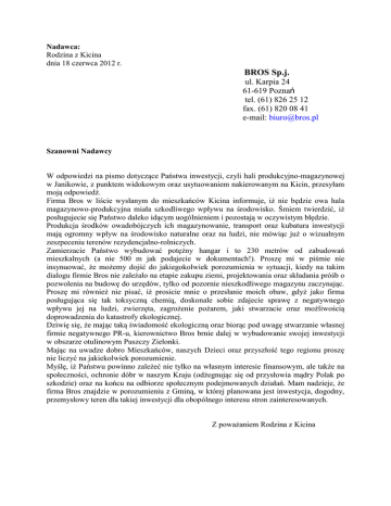 Nadawca: Rodzina z Kicina dnia 18 czerwca 2012 r. BROS Sp.j. ul. Karpia 24 61-619 Poznań tel. (61) 826 25 12 fax. (61) 820 08 41 e-mail: [email protected] Szanowni Nadawcy W odpowiedzi na pismo dotyczące Państwa inwestycji, czyli hali produkcyjno-magazynowej w Janikowie, z punktem widokowym oraz usytuowaniem nakierowanym na Kicin, przesyłam moją odpowiedź. Firma Bros w liście wysłanym do mieszkańców Kicina informuje, iż nie będzie owa hala magazynowo-produkcyjna miała szkodliwego wpływu na środowisko. Śmiem twierdzić, iż posługujecie się Państwo daleko idącym uogólnieniem i pozostają w oczywistym błędzie. Produkcja środków owadobójczych ich magazynowanie, transport oraz kubatura inwestycji mają ogromny wpływ na środowisko naturalne oraz na ludzi, nie mówiąc już o wizualnym zeszpeceniu terenów rezydencjalno-rolniczych. Zamierzacie Państwo wybudować potężny hangar i to 230 metrów od zabudowań mieszkalnych (a nie 500 m jak podajecie w dokumentach!). Proszę mi w piśmie nie insynuować, że możemy dojść do jakiegokolwiek porozumienia w sytuacji, kiedy na takim dialogu firmie Bros nie zależało na etapie zakupu ziemi, projektowania oraz składania próśb o pozwolenia na budowę do urzędów, tylko od pozornie nieszkodliwego magazynu zaczynając. Proszę mi również nie pisać, iż prosicie mnie o przesłanie moich obaw, gdyż jako firma posługująca się tak toksyczną chemią, doskonale sobie zdajecie sprawę z negatywnego wpływu jej na ludzi, zwierzęta, zagrożenie pożarem, jaki stwarzacie oraz możliwością doprowadzenia do katastrofy ekologicznej. Dziwię się, że mając taką świadomość ekologiczną oraz biorąc pod uwagę stwarzanie własnej firmie negatywnego PR-u, kierownictwo Bros brnie dalej w wybudowanie swojej inwestycji w obszarze otulinowym Puszczy Zielonki. Mając na uwadze dobro Mieszkańców, naszych Dzieci oraz przyszłość tego regionu proszę nie liczyć na jakiekolwiek porozumienie. Myślę, iż Państwu powinno zależeć nie tylko na własnym interesie finansowym, ale także na społeczności, ochronie dóbr w naszym Kraju (odżegnując się od przysłowia mądry Polak po szkodzie) oraz na końcu na odbiorze społecznym podejmowanych działań. Mam nadzieje, że firma Bros znajdzie w porozumieniu z Gminą, w której planowana jest inwestycja, dogodny, przemysłowy teren dla takiej inwestycji dla obopólnego interesu stron zainteresowanych. Z poważaniem Rodzina z Kicina