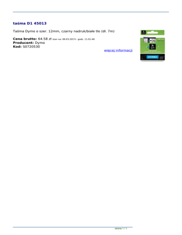 taśma D1 45013 Taśma Dymo o szer. 12mm, czarny nadruk/białe tło (dł. 7m) Cena brutto: 64.58 zł Producent: Dymo Kod: S0720530 stan na: 08-03-2017r. godz. 11:01:48 więcej informacji strona 1 / 1 Powered by TCPDF (www.tcpdf.org)