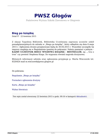 1 PWSZ Głogów Państwowa Wyższa Szkoła Zawodowa w Głogowie Bieg po książkę Dział IT · 22 kwietnia 2015 Z okazji Tygodnia Bibliotek, Biblioteka Uczelniana zaprasza uczniów szkół ponadgimnazjalnych do udziału w „Biegu po książkę”, który odbędzie się dnia 8 maja 2015 r. Zgłoszenia drużyn przyjmowane będą do 30.04.2015 r. Wszystkie szczegóły tej imprezy znajdują się w Regulaminie (poniżej do pobrania). Należy pamiętać o jednym – KAŻDY UCZESTNIK BIEGU WYGRYWA KSIĄŻKĘ – BESTSELLER, np. „ Gra o tron” czy powieść Stephena Kinga. Do wygrania również nagroda drużynowa. Bliższych informacji udziela oraz zgłoszenia przyjmuje p. Marta Wieczorek tel. 8320424 mail [email protected] Do pobrania: Regulamin „Biegu po książkę” Formularz zgłoszenia drużyny Karta „Biegu po książkę” Wykaz literatury Ten wpis został utworzony 22 kwietnia 2015 o godz. 09:16 w kategorii Aktualności. PWSZ Głogów -1/1- 17.04.2016