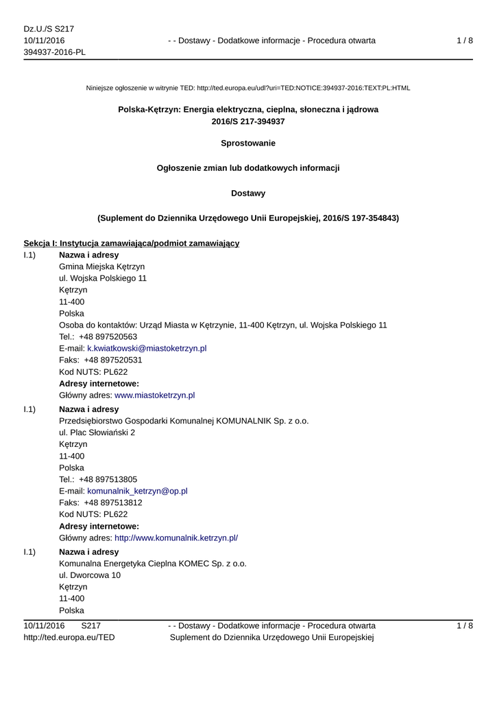 Dz.U./S S217 10/11/2016 394937-2016-PL - - Dostawy - Dodatkowe informacje - Procedura otwarta 1/8 Niniejsze ogłoszenie w witrynie TED: http://ted.europa.eu/udl?uri=TED:NOTICE:394937-2016:TEXT:PL:HTML Polska-Kętrzyn: Energia elektryczna, cieplna, słoneczna i jądrowa 2016/S 217-394937 Sprostowanie Ogłoszenie zmian lub dodatkowych informacji Dostawy (Suplement do Dziennika Urzędowego Unii Europejskiej, 2016/S 197-354843) Sekcja I: Instytucja zamawiająca/podmiot zamawiający I.1) Nazwa i adresy Gmina Miejska Kętrzyn ul. Wojska Polskiego 11 Kętrzyn 11-400 Polska Osoba do kontaktów: Urząd Miasta w Kętrzynie, 11-400 Kętrzyn, ul. Wojska Polskiego 11 Tel.: +48 897520563 E-mail: [email protected] Faks: +48 897520531 Kod NUTS: PL622 Adresy internetowe: Główny adres: www.miastoketrzyn.pl I.1) Nazwa i adresy Przedsiębiorstwo Gospodarki Komunalnej KOMUNALNIK Sp. z o.o. ul. Plac Słowiański 2 Kętrzyn 11-400 Polska Tel.: +48 897513805 E-mail: [email protected] Faks: +48 897513812 Kod NUTS: PL622 Adresy internetowe: Główny adres: http://www.komunalnik.ketrzyn.pl/ I.1) Nazwa i adresy Komunalna Energetyka Cieplna KOMEC Sp. z o.o. ul. Dworcowa 10 Kętrzyn 11-400 Polska 10/11/2016 S217 http://ted.europa.eu/TED - - Dostawy - Dodatkowe informacje - Procedura otwarta Suplement do Dziennika Urzędowego Unii Europejskiej 1/8 Dz.U./S S217 10/11/2016 394937-2016-PL - - Dostawy - Dodatkowe informacje - Procedura otwarta 2/8 Tel.: +48 897512989 E-mail: [email protected] Faks: +48 897513166 Kod NUTS: PL622 Adresy internetowe: Główny adres: http://www.komec.ketrzyn.pl/ I.1) Nazwa i adresy Miejskie Wodociągi i Kanalizacji Sp. z o.o. ul. Poznańska 6 Kętrzyn 11-400 Polska Tel.: +48 897514953 E-mail: [email protected] Faks: +48 897514953 Kod NUTS: PL622 Adresy internetowe: Główny adres: http://www.mwik.ketrzyn.pl I.1) Nazwa i adresy Kętrzyńskie Centrum Kultury ul. Gen. Sikorskiego 24A Kętrzyn 11-400 Polska Tel.: +48 897512553 E-mail: [email protected] Faks: +48 897512238 Kod NUTS: PL622 Adresy internetowe: Główny adres: http://kck.ketrzyn.pl/ I.1) Nazwa i adresy Miejska Biblioteka Publiczna w Kętrzynie ul. Pl. Zamkowy 1 Kętrzyn 11-400 Polska Tel.: +48 897523230 E-mail: [email protected] Faks: +48 897523230 Kod NUTS: PL622 Adresy internetowe: Główny adres: http://www.biblioteka.ketrzyn.pl/ I.1) Nazwa i adresy Muzeum im. Wojciecha Kętrzyńskiego w Kętrzynie ul. Pl. Zamkowy1 10/11/2016 S217 http://ted.europa.eu/TED - - Dostawy - Dodatkowe informacje - Procedura otwarta Suplement do Dziennika Urzędowego Unii Europejskiej 2/8 Dz.U./S S217 10/11/2016 394937-2016-PL - - Dostawy - Dodatkowe informacje - Procedura otwarta 3/8 Kętrzyn 11-400 Polska Tel.: +48 897523282 E-mail: [email protected] Faks: +48 897522965 Kod NUTS: PL622 Adresy internetowe: Główny adres: http://www.muzeum.ketrzyn.pl/ I.1) Nazwa i adresy Miejski Ośrodek Pomocy Społecznej ul. Pocztowa 11 Kętrzyn 11-400 Polska Tel.: +48 897512901 E-mail: [email protected] Faks: +48 897517411 Kod NUTS: PL622 Adresy internetowe: Główny adres: http://www.mopsketrzyn.pl/ I.1) Nazwa i adresy Miejski Ośrodek Sportu i Rekreacji ul. Kazimierza Wielkiego 12 Kętrzyn 11-400 Polska Tel.: +48 897526207 E-mail: [email protected] Faks: +48 897526207 Kod NUTS: PL622 Adresy internetowe: Główny adres: http://mosir-ketrzyn.pl/ I.1) Nazwa i adresy Szkoła Podstawowa nr 1 im. Feliksa Nowowiejskiego ul. Kopernika 12 Kętrzyn 11-400 Polska Tel.: +48 897515276 E-mail: [email protected] Faks: +48 897515276 Kod NUTS: PL622 Adresy internetowe: Główny adres: http://www.jedynka.webity.pl/ 10/11/2016 S217 http://ted.europa.eu/TED - - Dostawy - Dodatkowe informacje - Procedura otwarta Suplement do Dziennika Urzędowego Unii Europejskiej 3/8 Dz.U./S S217 10/11/2016 394937-2016-PL - - Dostawy - Dodatkowe informacje - Procedura otwarta I.1) Nazwa i adresy Szkoła Podstawowa nr 3 im. Marii Zientary Malewskiej ul. Bydgoska 1 Kętrzyn 11-400 Polska Tel.: +48 897524163 E-mail: [email protected] Faks: +48 897524163 Kod NUTS: PL622 Adresy internetowe: Główny adres: https://sp3ketrzyn.edupage.org/ I.1) Nazwa i adresy Szkoła Podstawowa nr 4 im. Stanisława Moniuszki ul. Moniuszki 1 Kętrzyn 11-400 Polska Tel.: +48 897512906 E-mail: [email protected] Faks: +48 897512906 Kod NUTS: PL622 Adresy internetowe: Główny adres: http://www.sp4ketrzyn.webity.pl/ I.1) Nazwa i adresy Zespół Szkół nr 1 wraz z Oddziałami Integracyjnymi im. Macieja Kalenkiewicza Kotwicza ul. Kazimierza Wielkiego 12 Kętrzyn 11-400 Polska Tel.: +48 897518171 E-mail: [email protected] Faks: +48 897518171 Kod NUTS: PL622 Adresy internetowe: Główny adres: https://zsketrzyn.edupage.org/ I.1) Nazwa i adresy Gimnazjum nr 2 im. Jana Pawła II ul. Wojska Polskiego 9 Kętrzyn 11-400 Polska Tel.: +48 897512309 E-mail: [email protected] Faks: +48 897512309 10/11/2016 S217 http://ted.europa.eu/TED - - Dostawy - Dodatkowe informacje - Procedura otwarta Suplement do Dziennika Urzędowego Unii Europejskiej 4/8 4/8 Dz.U./S S217 10/11/2016 394937-2016-PL - - Dostawy - Dodatkowe informacje - Procedura otwarta 5/8 Kod NUTS: PL622 Adresy internetowe: Główny adres: http://www.gimnazjumnr2.webity.pl/ I.1) Nazwa i adresy Miejskie Przedszkole Integracyjne MALINKA ul. Obrońców Westerplatte 16 Kętrzyn 11-400 Polska Tel.: +48 897512466 E-mail: [email protected] Faks: +48 897512466 Kod NUTS: PL622 Adresy internetowe: Główny adres: www.miastoketrzyn.pl I.1) Nazwa i adresy Żłobek Miejski w Kętrzynie ul. Obrońców Westerpalatte 16 Kętrzyn 11-400 Polska Tel.: +48 897512466 E-mail: [email protected] Faks: +48 897512466 Kod NUTS: PL622 Adresy internetowe: Główny adres: www.miastoketrzyn.pl I.1) Nazwa i adresy Środowiskowy Dom Samopomocy ul. Gen. Wł. Sikorskiego 76J Kętrzyn 11-400 Polska Tel.: +48 897510487 E-mail: [email protected] Faks: +48 897510487 Kod NUTS: PL622 Adresy internetowe: Główny adres: http://sds.ketrzyn.pl/ Sekcja II: Przedmiot II.1) Wielkość lub zakres zamówienia II.1.1) Nazwa: Dostaw