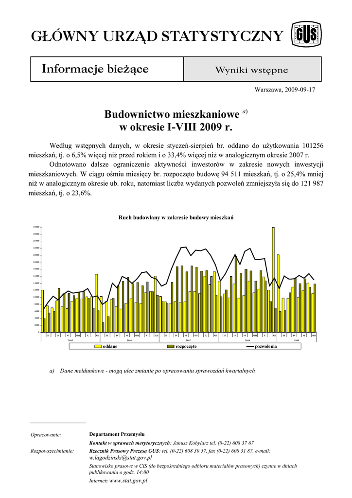 Warszawa, 2009-09-17 Budownictwo mieszkaniowe a) w okresie I-VIII 2009 r. Według wstępnych danych, w okresie styczeń-sierpień br. oddano do użytkowania 101256 mieszkań, tj. o 6,5% więcej niż przed rokiem i o 33,4% więcej niż w analogicznym okresie 2007 r. Odnotowano dalsze ograniczenie aktywności inwestorów w zakresie nowych inwestycji mieszkaniowych. W ciągu ośmiu miesięcy br. rozpoczęto budowę 94 511 mieszkań, tj. o 25,4% mniej niż w analogicznym okresie ub. roku, natomiast liczba wydanych pozwoleń zmniejszyła się do 121 987 mieszkań, tj. o 23,6%. Ruch budowlany w zakresie budowy mieszkań 30000 28000 26000 24000 22000 20000 18000 16000 14000 12000 10000 8000 6000 4000 2000 0 II IV VI VIII X XII II IV 2005 VI VIII X 2006 oddane XII II IV VI VIII 2007 X XII II IV VI VIII X XII 2008 rozpoczęte II IV 2009 pozwolenia a) Dane meldunkowe - mogą ulec zmianie po opracowaniu sprawozdań kwartalnych Opracowanie: Departament Przemysłu Kontakt w sprawach merytorycznych: Janusz Kobylarz tel. (0-22) 608 37 67 Rozpowszechnianie: Rzecznik Prasowy Prezesa GUS: tel. (0-22) 608 30 57, fax (0-22) 608 31 87, e-mail: [email protected] Stanowisko prasowe w CIS (do bezpośredniego odbioru materiałów prasowych) czynne w dniach publikowania o godz. 14:00 Internet: www.stat.gov.pl VI VIII Największy udział w przyroście nowych zasobów mieszkaniowych mieli deweloperzy, którzy w okresie styczeń-sierpień 2009 r. oddali 48 094 mieszkań, tj. o 19,4% więcej niż w ub. roku, co stanowiło 47,5% ogólnej liczby mieszkań oddanych do użytkowania. W ciągu ośmiu miesięcy br. inwestorzy ci rozpoczęli budowę 24 415 mieszkań, tj. o 49,1% mniej niż w 2008 r. Spadła również liczba mieszkań, na których budowę uzyskali oni pozwolenie - do 43 722, tj. o 38,2%. Inwestorzy indywidualni wybudowali 44 880 mieszkań (o 1,6% mniej niż przed rokiem). W tej grupie inwestorów spadek zainteresowania uzyskiwaniem pozwoleń i rozpoczynaniem nowych inwestycji mieszkaniowych był mniejszy niż wśród deweloperów. Inwestorzy indywidualni uzyskali pozwolenia na budowę 70 805 mieszkań i rozpoczęli budowę 64 868 mieszkań, tj. odpowiednio o 9,7% i o 8,8% mniej w stosunku do ośmiu miesięcy 2008 r. Spółdzielnie mieszkaniowe w okresie styczeń-sierpień 2009 r.oddały do użytkowania 4 279 mieszkań, tj. o 19,0% mniej niż przed rokiem. Liczba uzyskanych przez spółdzielnie mieszkaniowe pozwoleń i rozpoczynanych mieszkań była również mniejsza, tj. odpowiednio o 27,6% i o 25,5%. Pozostali inwestorzy (budownictwo komunalne, społeczne czynszowe i zakładowe) oddali do użytkowania w pierwszych ośmiu miesiącach 2009 r. łącznie 4 003 mieszkania, tj. o 1,8% więcej niż w ub. roku, a ich udział w ogólnej liczbie mieszkań oddanych do użytkowania był nieco mniejszy niż przed rokiem i wyniósł 4,0%. W tej grupie inwestorów lepsze wyniki osiągnięto w budownictwie komunalnym – 1 741 mieszkań, tj. o 7,1% więcej niż w ub. roku i w budownictwie zakładowym – 388 mieszkań, odpowiednio o 51,0% więcej. W budownictwie społecznym czynszowym oddano 1 874 mieszkania, tj. o 8,5% mniej niż w ub. roku. W okresie styczeń-sierpień br. wzrost liczby mieszkań oddanych do użytkowania odnotowano w dziewięciu województwach, największy w województwie dolnośląskim – o 30,2% i małopolskim – o 27,0%, a w województwie mazowieckim oddano 24 966 mieszkań, tj. o 4,4% więcej niż przed rokiem. W pozostałych województwach oddano do użytkowania mniej mieszkań niż w ciągu ośmiu miesięcy ub. roku, w tym w województwie warmińsko-mazurskim - o 25,2%, świętokrzyskim – o 14,7%, kujawsko-pomorskim – 6,8%. Mieszkania oddane do użytkowania (+4,4) 26000 I-VIII 2008 24000 I-VIII 2009 22000 20000 18000 16000 (+27,0) 14000 12000 (+30,2) 10000 (-3,8) (+17,9) (-4,5) 8000 (+10,6) 6000 (-6,8) (-4,5) (+7,9) 4000 (-25,2) (-5,0) (+7,3) (+3,0) 2000 (-14,7) (+16,3) po l sk ie e O ys ki ok rz ię t Św Po dl as ki e Lu bu sk ie rs ki e W ar m iń sk om az u rp a ck ie ki e Po dk a Łó dz lsk ie Lu be Po m or sk ch ie od ni op om or K sk uj ie aw sk opo m or sk ie Za sk ie Śl ą lk op ol sk ie W ie ol no ślą sk ie D ał op ol sk ie M M az ow ie c ki e 0 Zmiany do okresu I-VIII 2008 (w %) 2009 VIII Formy liczba mieszkań budownictwa VIII 2008=100 I–VIII VII 2009 = 100 liczba mieszkań I -VIII 2008= =100 Mieszkania oddane do użytkowania Ogółem ............................. 11076 99,0 79,0 101256 106,5 Spółdzielcze ...................... 490 87,3 79,0 4279 81,0 Indywidualne .................... 5248 97,1 96,2 44880 98,4 Przeznaczone na sprzedaż 4837 103,0 67,0 48094 119,4 Pozostałeb) ......................... 501 96,2 68,8 4003 101,8 Mieszkania, których budowę rozpoczęto Ogółem ............................. 13771 94,2 106,8 94511 74,6 Spółdzielcze ...................... 713 291,0 212,8 2937 74,5 Indywidualne .................... 9072 97,5 88,4 64868 91,2 Przeznaczone na sprzedaż 3612 78,4 181,9 24415 50,9 Pozostałeb) ......................... 374 79,9 116,5 2291 61,6 Mieszkania, na realizację których wydano pozwolenia Ogółem ............................. 14932 71,9 89,4 121987 76,4 Spółdzielcze ...................... 318 133,1 64,8 3025 72,4 Indywidualne .................... 8793 96,0 84,0 70805 90,3 Przeznaczone na sprzedaż 5339 50,8 98,5 43722 61,8 Pozostałeb) ......................... 482 55,7 154,0 4435 69,9 a) zakładowe, komunalne, społeczne czynszowe. Mieszkania oddane do użytkowania 30000 28000 26000 24000 22000 20000 18000 16000 14000 12000 10000 8000 6000 4000 2000 0 II IV VI VIII X XII II IV VI 2005 VIII X XII II IV 2006 Ogółem VI VIII X XII II IV 2007 Indywidualne VI VIII X XII II 2008 Sprzedaż lub wynajem IV VI VIII 2009 Spółdzielcze Mieszkania, których budowę rozpoczęto 22000 20000 18000 16000 14000 12000 10000 8000 6000 4000 2000 0 II IV VI VIII X XII II IV VI 2005 VIII X XII II IV 2006 Ogółem VI VIII X XII II IV 2007 Indywidualne VI VI