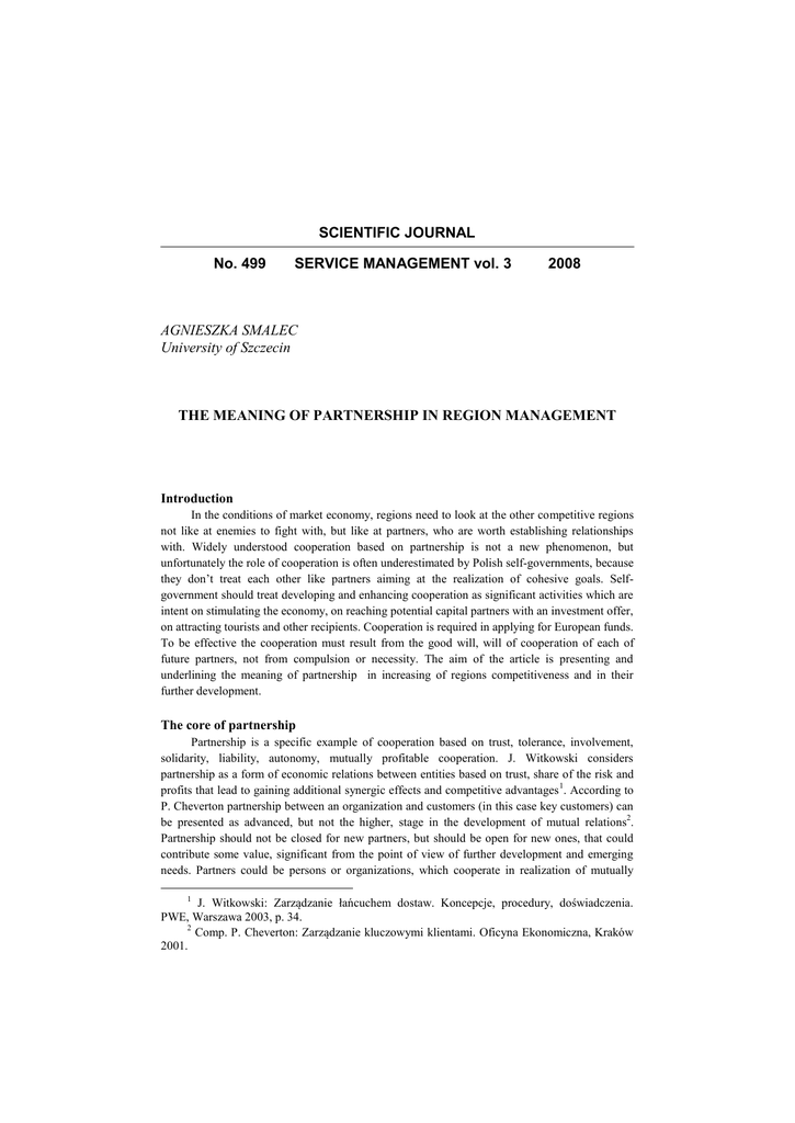 SCIENTIFIC JOURNAL No. 499 SERVICE MANAGEMENT vol. 3 2008 AGNIESZKA SMALEC University of Szczecin THE MEANING OF PARTNERSHIP IN REGION MANAGEMENT Introduction In the conditions of market economy, regions need to look at the other competitive regions not like at enemies to fight with, but like at partners, who are worth establishing relationships with. Widely understood cooperation based on partnership is not a new phenomenon, but unfortunately the role of cooperation is often underestimated by Polish self-governments, because they don’t treat each other like partners aiming at the realization of cohesive goals. Selfgovernment should treat developing and enhancing cooperation as significant activities which are intent on stimulating the economy, on reaching potential capital partners with an investment offer, on attracting tourists and other recipients. Cooperation is required in applying for European funds. To be effective the cooperation must result from the good will, will of cooperation of each of future partners, not from compulsion or necessity. The aim of the article is presenting and underlining the meaning of partnership in increasing of regions competitiveness and in their further development. The core of partnership Partnership is a specific example of cooperation based on trust, tolerance, involvement, solidarity, liability, autonomy, mutually profitable cooperation. J. Witkowski considers partnership as a form of economic relations between entities based on trust, share of the risk and profits that lead to gaining additional synergic effects and competitive advantages 1. According to P. Cheverton partnership between an organization and customers (in this case key customers) can be presented as advanced, but not the higher, stage in the development of mutual relations2. Partnership should not be closed for new partners, but should be open for new ones, that could contribute some value, significant from the point of view of further development and emerging needs. Partners could be persons or organizations, which cooperate in realization of mutually 1 J. Witkowski: Zarządzanie łańcuchem dostaw. Koncepcje, procedury, doświadczenia. PWE, Warszawa 2003, p. 34. 2 Comp. P. Cheverton: Zarządzanie kluczowymi klientami. Oficyna Ekonomiczna, Kraków 2001. 58 Agnieszka Smalec favorable enterprises, which in the long term lead to the success of all involved parties 3. The relationship between an organization and its associates is defined as chain of partnership. It is a tool of partner marketing used in full relation programs comprising: service, loyalty program, individualization, prize system and building the society of cooperants 4. The value chain is one of the main tools of the identification of the way of value increase for client. An organization concentrated on forming desirable relations creates a unique system of partnerships comprising clients, agents, service institutions (financial, consulting, etc.), namely entities which are specific, have different preferences, needs and goals. Such relations often constitute durable, long-term relationships between an organization and its clients (or other interested parties) based on the information exchange, mutual trust and sharing joint benefits5. Partnership is effective when all parties are involved. M. Saunders indicates that success of partnership requires: frequent communication, both formal and informal; will for cooperation; trust between parties; open information; multidisciplinary involvement6. It also requires imagination and empathy to understand what partner feels and needs at the particular moment. Partnership allows to change from thinking in the categories of competition and conflict to thinking in categories of mutual dependence and cooperation, through: - paying attention to the partners and clients rather than to products, - sustaining and developing clients rather than gaining new ones, - working in interfunctional teams rather than within particular departments 7. Considering motives of involving in partnerships, goals and time of their realization, there can be differed strategic and operational partnership. Strategic partnership means cooperation between two or more parties in order to use their best assets. Property is not assigned in this situation because synergy of assets and decrease in costs relate exclusively from cooperation. It is a form of inter-companies strategies realization for at least two partners, which keep an autonomy and stay independent within the scope of actions not covered by the cooperation agreement 8. Due to the partnership, the positions of both parties are strengthened in a long term. Relations based on strategic partnerships ensure their long time duration, involvement and supplementing each other, completing partner’s possibilities through adjusting abilities, resources, technologies and actions9. Trust is crucial here because a lack of trust of one party leads to the lack of trust of another what 3 A. Modrzejewska: W poszukiwaniu prawdziwego partnerstwa w relacjach z klientami. http://www.achieveglobal.com.pl. 4 Further reading: B. Tarczydło: Łańcuch partnerstwa w zarządzaniu relacjami z kooperantami. „Zagadnienia Techniczno-Ekonomiczne” 2003, tom 48, vol. 4, p. 1255, or Ph. Kotler, G. Armstrong, J. Saunders, V. Wong: Marketing. Podręcznik europejski. PWE, Warszawa 2002, pp. 525-526. 5 E. Rudawska: Lojalność klientów. PWE, Warszawa 2005, p. 168. 6 C. Black, A. Akintoye, E. Fitzgerald: An analysis of success factors and benefits of partnering in construction. „International Journal of Project Management” 2000, No. 18, p. 423. 7 Ph. Kotler: Marketing od A do Z. PWE, Warszawa 2004, pp. 105-106. 8 A. Sulejewicz: Partnerstwo strategiczne. Modelowanie współpracy przedsiębiorstw. Monografie i Opracowania nr 427, Wydawnictwo SGH, Warszawa 1997, p. 72. 9 A. Pluta-Zaremba: Wpływ handlu elektronicznego na budowanie długookresowych relacji partnerskich między podm