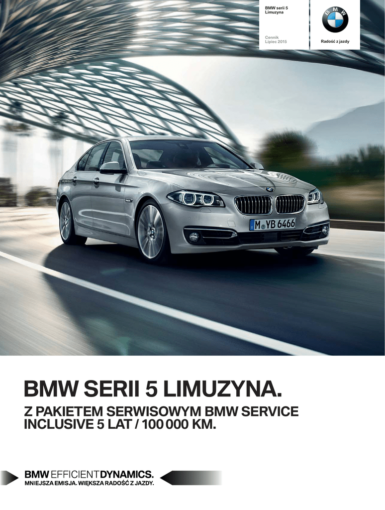 BMW serii Limuzyna Cennik Lipiec BMW SERII LIMUZYNA. Z PAKIETEM SERWISOWYM BMW SERVICE INCLUSIVE LAT / KM. Radość z jazdy SPIS TREŚCI Ceny BMW serii 5 Limuzyna . . . . . . . . . . . . . . . . . . . . . . . . . . . . . . . . . . 3 Wyposażenie standardowe . . . . . . . . . . . . . . . . . . . . . . . . . . . . . . . . . . . 4 Wyposażenie dodatkowe . . . . . . . . . . . . . . . . . . . . . . . . . . . . . . . . . . . . . 8 Bezpieczeństwo Lakier Stylistyka zewnętrzna Pakiety wyposażenia dodatkowego Koła / opony Tapicerki Stylistyka wnętrza Zawieszenie / układ jezdny Skrzynia biegów Systemy asystujące Światła i oświetlenie 8 8 9 10 13 15 16 18 19 20 21 Fotele / komfort siedzeń Kierownice Kontrola klimatu Funkcjonalne wyposażenie zewnętrzne i wewnętrzne Radio / nawigacja Komunikacja oraz informacja Systemy HiFi oraz zestawy rozrywki Serwis Kontrola wewnętrzna 22 23 24 24 25 26 27 28 28 BMW Service Inclusive . . . . . . . . . . . . . . . . . . . . . . . . . . . . . . . . . . . . . 29 BMW Financial Services . . . . . . . . . . . . . . . . . . . . . . . . . . . . . . . . . . . . 31 2 wyposażenie standardowe wyposażenie dodatkowe za dopłatą CENY BMW SERII 5 LIMUZYNA Model Układ skrzyni biegów Silnik Moc Układ /cylindry Pojemność Zużycie paliwa wg normy ECE Emisja CO2 Cena netto (bez VAT) Cena brutto cm3 kW (KM) cykl mieszany l / 100km g/km w PLN w PLN* 520i 6-man R4 / 1997 135 (184) 6,4 149 149 268 183 600 528i 6-man R4 / 1997 180 (245) 6,6 154 165 528 203 600 528i xDrive 8-aut R4 / 1997 180 (245) 6,4 149 181 788 223 600 535i 6-man R6 / 2979 225 (306) 8,0 186 201 301 247 600 535i xDrive 8-aut R6 / 2979 225 (306) 7,6 178 221 464 272 400 ActiveHybrid 5 8-aut R6 / 2979 250 (340) 6,4 149 244 797 301 100 550i 8-aut V8 / 4395 330 (450) 8,6 199 281 057 345 700 550i xDrive 8-aut V8 / 4395 330 (450) 9,2 214 292 439 359 700 518d 6-man R4 / 1995 110 (150) 4,3 114 146 016 179 600 520d 6-man R4 / 1995 140 (190) 4,3 114 154 146 189 600 520d xDrive 8-aut R4 / 1995 140 (190) 4,5 119 170 406 209 600 525d 6-man R4 / 1995 160 (218) 4,9 129 173 333 213 200 525d xDrive 8-aut R4 / 1995 160 (218) 5,1 133 189 593 233 200 530d 8-aut R6 / 2993 190 (258) 5,1 134 205 285 252 500 530d xDrive 8-aut R6 / 2993 190 (258) 5,4 142 216 667 266 500 535d 8-aut R6 / 2993 230 (313) 5,3 138 221 301 272 200 535d xDrive 8-aut R6 / 2993 230 (313) 5,6 147 232 439 285 900 M550d xDrive 8-aut R6 / 2993 280 (381) 6,2 162 309 756 381 000 M5 7-DKG V8 / 4395 412 (560) 9,9 231 411 545 506 200 Data wydania cennika: 01.07.2015. * Powyższe ceny zawierają pakiet serwisowy BMW Service Inclusive 5 lat / 100 000 km pokrywający koszty serwisowania samochodu oraz przeglądów, wliczając w to oryginalne części BMW, olej oraz robociznę. Pakiet obejmuje następujące czynności: wymiana oleju (bez uzupełniania), serwis/wymiana filtra powietrza, filtra przeciwpyłkowego, świec zapłonowych, płynu hamulcowego, kontrola pojazdu i przegląd standardowy zgodnie z książką serwisową. Więciej informacji na temat BMW Service Inclusive oraz dodatkowych pakietów znajdą Państwo u Dealera BMW. W przypadku rezygnacji z pakietu cena samochodu będzie niższa o 1 682 PLN brutto dla modeli z silnikiem 4-cylindrowym, 2 076 PLN brutto dla modeli z silnikiem 6-cylindrowym, 2 556 PLN brutto dla modeli z silnikiem 8-cylindrowym oraz o 2 857 PLN brutto dla ActiveHybrid 5, 2 769 PLN brutto dla M550d xDrive i 4 100 PLN brutto dla M5. Podane ceny są zalecanymi cenami detalicznymi, zawierającymi podatek VAT oraz podatek akcyzowy. Zalecane ceny detaliczne dotyczące wyposażenia dodatkowego są ważne jedynie, jeśli wyposażenie to zostanie zamówione jednocześnie z danym modelem pojazdu. Podane ceny samochodów obowiązują dla modeli w kolorach podstawowych, a lakiery metalizowane są dostępne za dopłatą. Powyższe ceny mogą ulec zmianom bez uprzedzenia w zależności od zmiany cen wprowadzonych przez producenta, jak również zmian w podatkach, opłatach i przepisach celnych. Przedstawione informacje są aktualne w chwili ukazania się niniejszej publikacji. BMW Vertriebs GmbH zastrzega sobie prawo do zmian w ofercie w każdej chwili i to zarówno w zakresie oferowanych modeli jak i ich budowy oraz wyposażenia. Niniejszy cennik nie stanowi oferty w rozumieniu prawa i publikowany jest jedynie dla celów informacyjnych bez żadnej odpowiedzialności. Informacji dotyczących dostępności prezentowanych modeli i wyposażenia, jak również aktualnych cen detalicznych prosimy zasięgnąć u Dealera BMW. 3 520i 528i 528i xDrive 535i 535i xDrive ActiveHybrid 5 550i 550i xDrive 518d 520d 520d xDrive 525d 525d xDrive 530d 530d xDrive 535d 535d xDrive M550d xDrive M5 WYPOSAŻENIE STANDARDOWE Pakiet serwisowy BMW Service Inclusive Pakiet serwisowy BMW Service Inclusive 5 lat / 100 000 km, pokrywa koszty serwisowania oraz robociznę Bezpieczeństwo Intelligent Emergency Calling (Inteligentne Połączenie Alarmowe) Poduszki powietrzne dla kierowcy i pasażera System zapobiegający blokowaniu się kół podczas hamowania (ABS) Asystent hamowania Czujnik kolizji Dwutonowy klakson Układ dynamicznej kontroli stabilności (DSC) z asystentem ruszania Poduszki powietrzne chroniące głowę z przodu i z tyłu Boczne poduszki powietrzne dla kierowcy i pasażera z przodu Wzmocnienia boczne Trójkąt ostrzegawczy i apteczka Czujnik ciśnienia powietrza w oponach Lakier i stylistyka zewnętrzna Lakier niemetalizowany (Czarny) Lakier niemetalizowany (Biel alpejska) Lakier metalizowany Lusterka zewnętrzne w kolorze karoserii Elementy zewnętrzne w kolorze karoserii Chromowane obramowania szyb Obramowania BMW Individual Shadow Line na wysoki połysk Atrapa chłodnicy z chromowanym grillem i chromowanym obramowaniem Atrapa chłodnicy z czarnym grillem Oznaczenie modelu Emblemat ActiveHybrid 5 Dolna obudowa lusterka w kolorze czarnym matowym Spojler tylny M Białe lampy kierunkowskazów Pakiety wyposażenia dodatkowego Pakiet sportowy M Koła / opony Opon