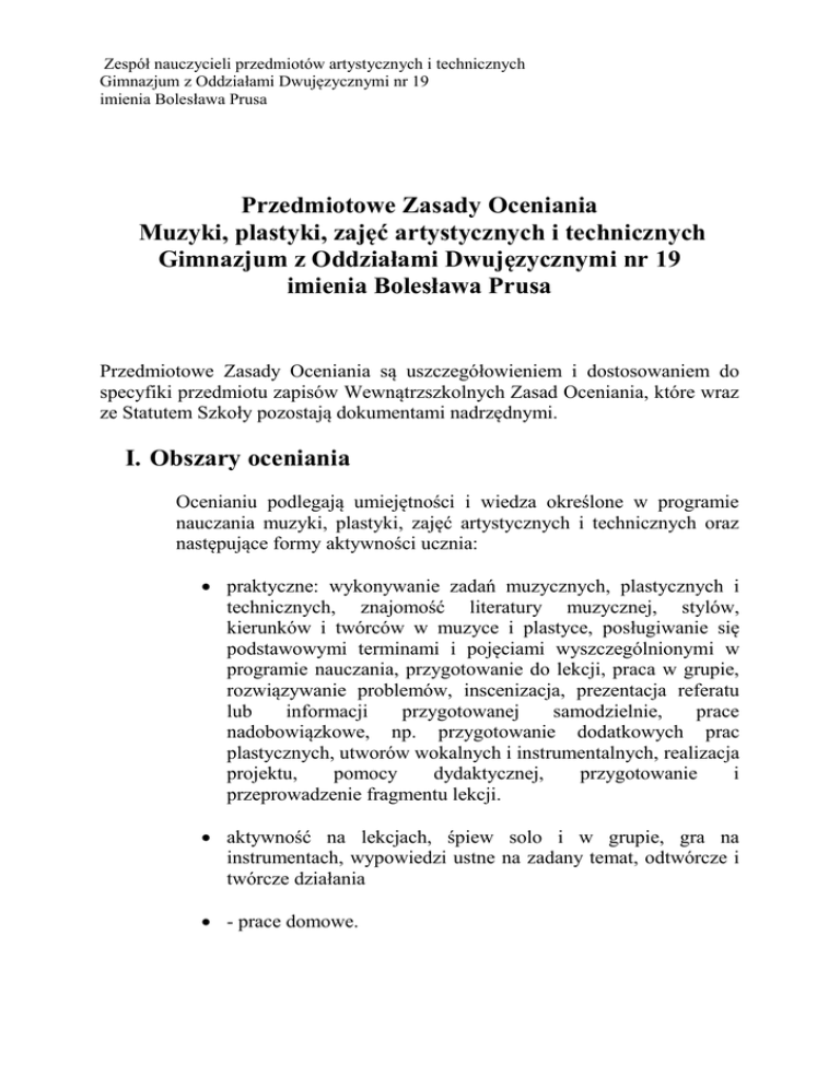 Zespół nauczycieli przedmiotów artystycznych i technicznych Gimnazjum z Oddziałami Dwujęzycznymi nr 19 imienia Bolesława Prusa Przedmiotowe Zasady Oceniania Muzyki, plastyki, zajęć artystycznych i technicznych Gimnazjum z Oddziałami Dwujęzycznymi nr 19 imienia Bolesława Prusa Przedmiotowe Zasady Oceniania są uszczegółowieniem i dostosowaniem do specyfiki przedmiotu zapisów Wewnątrzszkolnych Zasad Oceniania, które wraz ze Statutem Szkoły pozostają dokumentami nadrzędnymi. I. Obszary oceniania Ocenianiu podlegają umiejętności i wiedza określone w programie nauczania muzyki, plastyki, zajęć artystycznych i technicznych oraz następujące formy aktywności ucznia: praktyczne: wykonywanie zadań muzycznych, plastycznych i technicznych, znajomość literatury muzycznej, stylów, kierunków i twórców w muzyce i plastyce, posługiwanie się podstawowymi terminami i pojęciami wyszczególnionymi w programie nauczania, przygotowanie do lekcji, praca w grupie, rozwiązywanie problemów, inscenizacja, prezentacja referatu lub informacji przygotowanej samodzielnie, prace nadobowiązkowe, np. przygotowanie dodatkowych prac plastycznych, utworów wokalnych i instrumentalnych, realizacja projektu, pomocy dydaktycznej, przygotowanie i przeprowadzenie fragmentu lekcji. aktywność na lekcjach, śpiew solo i w grupie, gra na instrumentach, wypowiedzi ustne na zadany temat, odtwórcze i twórcze działania - prace domowe. II. Relacja nauczyciel – uczeń 1. Uczeń ma obowiązek prowadzić zeszyt ćwiczeń z przedmiotu muzyka i plastyka. 2. Każdy uczeń ma prawo do zdobycia dodatkowych ocen za prace nadobowiązkowe zlecone przez nauczyciela lub podjęte z własnej inicjatywy. 3. Uczeń dwukrotnie (zajęcia artystyczne i techniczne), jednokrotnie (muzyka, plastyka) w ciągu semestru może zgłosić nieprzygotowanie do zajęć. 4. Brak pracy domowej i/lub nieprzygotowanie do zajęć winny być zgłoszone nauczycielowi przed rozpoczęciem lekcji, w innym przypadku uczeń otrzymuje ocenę niedostateczną. 5. Aktywność ucznia na zajęciach może być oceniana w formie plusów, których określona liczba (np. 5) składa się na ocenę bardzo dobrą. Brak aktywności lub brak orientacji w zadaniach wykonywanych w czasie lekcji jest oceniany jako minusy, których określona liczba równa się ocenie niedostatecznej. 6. Oceny cząstkowe wyrażane są w stopniach: 1, 2, 2+, 3-, 3, 3+, 4-, 4, 4+, 5-, 5 ,5+ ,6. Nauczyciel ma prawo wystawienia oceny kształtującej. 7. Ocena semestralna i końcoworoczna ustalane są na podstawie średniej uzyskanych przez ucznia w ciągu semestru/roku ocen cząstkowych, których wagi wynoszą odpowiednio: 9 - oceny z prac i zadań wykonanych indywidualnie na lekcji, 5 – grupowe wykonywanie zadań, aktywność, 3 – ćwiczenia przedmiotowe, 2 – zadania i prace dodatkowe, 1 - prezentacje, organizacja pracy Wagi innych prac ustala nauczyciel stosownie do stopnia trudności zadania. Przedziały punktowe na poszczególne oceny semestralne i końcoworoczne: 0 -1,69 – niedostateczny 1,70 – 2,49 – dopuszczający 2,50 -3,49 – dostateczny 3,50 – 4,49 – dobry 4,50 – 5 lub więcej – bardzo dobry O ocenie celujący decyduje nauczyciel. 8. Nauczyciel może wystawić ocenę wyższą niż wynika to ze średniej ważonej jeżeli: uczeń jest uczestnikiem III etapu, finalistą lub laureatem konkursu przedmiotowego lub interdyscyplinarnego, konkursu tematycznego, uczeń posiada orzeczenie Poradni o specyficznych trudnościach w nauce utrudniających mu w znacznym stopniu opanowanie treści i umiejętności – biorąc pod uwagę wkład i systematyczność pracy oraz zaangażowanie ucznia, uczeń nie tylko nadrobił zaległości, ale poczynił znaczne postępy w nauce. W drugim i trzecim przypadku ocena powinna mieć motywację w ocenach kształtujących. 9. Uczniowie są informowani o kryteriach ocen prac klasowych i domowych. W przypadku oceniania prac pisemnych, nauczyciele mogą stosować kryteria ocen takie, jak na języku polskim. 10. Możliwe jest indywidualne dostosowanie wymagań w przypadku ucznia posiadającego stosowne orzeczenie Poradni. 11. Zagadnienia, które nie zostały ujęte w regulaminie, regulują zapisy WZO. III. Kryteria ocen z zajęć artystycznych, technicznych, muzyki i plastyki. Propozycje kryteriów osiągnięć ucznia: oceny i metod sprawdzania 1- czynne uczestnictwo w zajęciach, 2- wykazywanie pozytywnej motywacji podczas wykonywanych zadań, 3- organizowanie i przygotowanie niezbędnych materiałów do zajęć, 4- organizację pracy na lekcjach, 5- estetykę wykonanej pracy, 6- rozwijanie swoich zainteresowań, 7-wykonywanie prac dodatkowych, rozszerzających zakres omawianego zagadnienia, 8- aktywne uczestnictwo w życiu kulturalnym, 9- pomysłowość twórcza Przedmioty artystyczne i techniczne stanowią grupę przedmiotów, w których system oceniania stanowi problem złożony, trudny i często traktowany niejednoznacznie. Należy wyjść z założenia, że ocena powinna być elementem zachęty do działań twórczych. Docenić należy fakt, iż uczeń aktywnie uczestniczy w zajęciach. Oceniając uczniów, należy pamiętać, że poziom ich umiejętności praktycznych oraz wiedzy o sztuce może być bardzo zróżnicowany. Na zajęciach artystycznych i technicznych bieżącej ocenie podlega: przygotowanie do lekcji, aktywne uczestnictwo w zajęciach, twórcze i samodzielne rozwiązywanie problemów. Oceny wystawiane w trakcie roku szkolnego dotyczą następujących form : praktyczne ćwiczenia plastyczne, muzyczne, techniczne, motywacja do twórczej pracy, udział w konkursach, zadania domowe, rozwijanie zainteresowań i zdolności przedmiotowych. Kryteria oceny semestralnej i rocznej: Ocena celująca uczeń bardzo dobrze opanował zakres wiadomości i umiejętności przewidzianych programem, uczestniczył w konkursach przedmiotowych, twórczo posługiwał się zdobytą wiedzą, czynnie uczestniczył w artystycznym życi