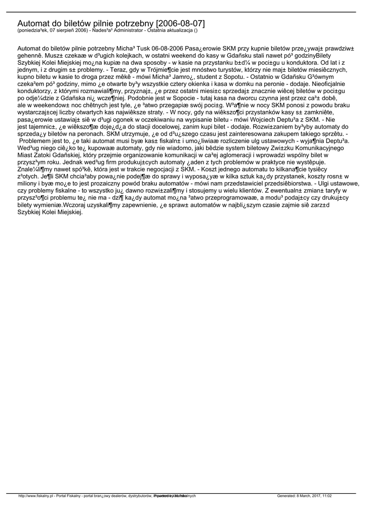 Automat do biletów pilnie potrzebny [2006-08-07] (poniedzia³ek, 07 sierpieñ 2006) - Nades³a³ Administrator - Ostatnia aktualizacja () Automat do biletów pilnie potrzebny Micha³ Tusk 06-08-2006 Pasa¿erowie SKM przy kupnie biletów prze¿ywaj± prawdziw± gehennê. Musz± czekaæ w d³ugich kolejkach, w ostatni weekend do kasy w Gdañsku stali nawet pó³ godzinyBilety Szybkiej Kolei Miejskiej mo¿na kupiæ na dwa sposoby - w kasie na przystanku b±d¼ w poci±gu u konduktora. Od lat i z jednym, i z drugim s± problemy. - Teraz, gdy w Trójmie¶cie jest mnóstwo turystów, którzy nie maj± biletów miesiêcznych, kupno biletu w kasie to droga przez mêkê - mówi Micha³ Jamro¿, student z Sopotu. - Ostatnio w Gdañsku G³ównym czeka³em pó³ godziny, mimo ¿e otwarte by³y wszystkie cztery okienka i kasa w domku na peronie - dodaje. Nieoficjalnie konduktorzy, z którymi rozmawiali¶my, przyznaj±, ¿e przez ostatni miesi±c sprzedaj± znacznie wiêcej biletów w poci±gu po odje¼dzie z Gdañska ni¿ wcze¶niej. Podobnie jest w Sopocie - tutaj kasa na dworcu czynna jest przez ca³± dobê, ale w weekendow± noc chêtnych jest tyle, ¿e ³atwo przegapiæ swój poci±g. W³a¶nie w nocy SKM ponosi z powodu braku wystarczaj±cej liczby otwartych kas najwiêksze straty. - W nocy, gdy na wiêkszo¶ci przystanków kasy s± zamkniête, pasa¿erowie ustawiaj± siê w d³ugi ogonek w oczekiwaniu na wypisanie biletu - mówi Wojciech Deptu³a z SKM. - Nie jest tajemnic±, ¿e wiêkszo¶æ doje¿d¿a do stacji docelowej, zanim kupi bilet - dodaje. Rozwi±zaniem by³yby automaty do sprzeda¿y biletów na peronach. SKM utrzymuje, ¿e od d³u¿szego czasu jest zainteresowana zakupem takiego sprzêtu. Problemem jest to, ¿e taki automat musi byæ kas± fiskaln± i umo¿liwiaæ rozliczenie ulg ustawowych - wyja¶nia Deptu³a. Wed³ug niego ciê¿ko te¿ kupowaæ automaty, gdy nie wiadomo, jaki bêdzie system biletowy Zwi±zku Komunikacyjnego Miast Zatoki Gdañskiej, który przejmie organizowanie komunikacji w ca³ej aglomeracji i wprowadzi wspólny bilet w przysz³ym roku. Jednak wed³ug firm produkuj±cych automaty ¿aden z tych problemów w praktyce nie wystêpuje. Znale¼li¶my nawet spó³kê, która jest w trakcie negocjacji z SKM. - Koszt jednego automatu to kilkana¶cie tysiêcy z³otych. Je¶li SKM chcia³aby powa¿nie podej¶æ do sprawy i wyposa¿yæ w kilka sztuk ka¿dy przystanek, koszty rosn± w miliony i byæ mo¿e to jest prozaiczny powód braku automatów - mówi nam przedstawiciel przedsiêbiorstwa. - Ulgi ustawowe, czy problemy fiskalne - to wszystko ju¿ dawno rozwi±zali¶my i stosujemy u wielu klientów. Z ewentualn± zmian± taryfy w przysz³o¶ci problemu te¿ nie ma - dzi¶ ka¿dy automat mo¿na ³atwo przeprogramowaæ, a modu³ podaj±cy czy drukuj±cy bilety wymieniæ.Wczoraj uzyskali¶my zapewnienie, ¿e spraw± automatów w najbli¿szym czasie zajmie siê zarz±d Szybkiej Kolei Miejskiej. http://www.fiskalny.pl - Portal Fiskalny - portal bran¿owy dealerów, dystrybutorów, importerów Powered bykas Mambo fiskalnych Generated: 8 March, 2017, 11:02